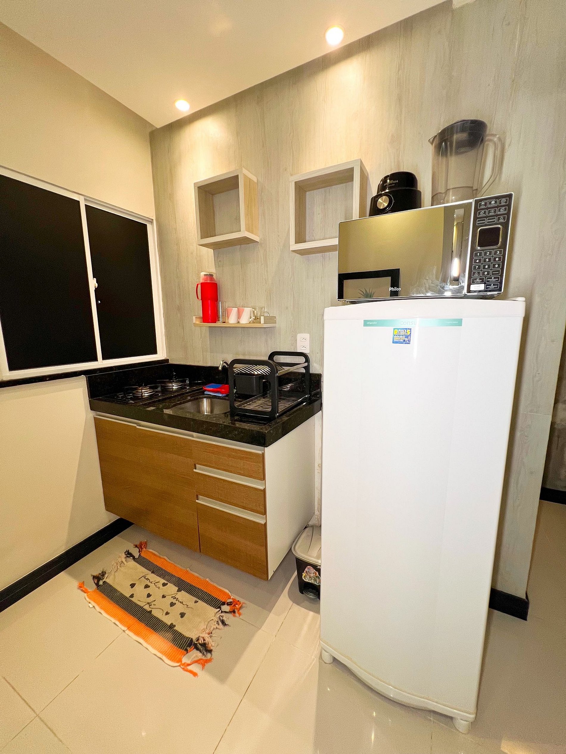O espaço contem uma cozinha completa e equipada com um cooktop de 2 bocas, liquidificador, panelas e micro ondas.
