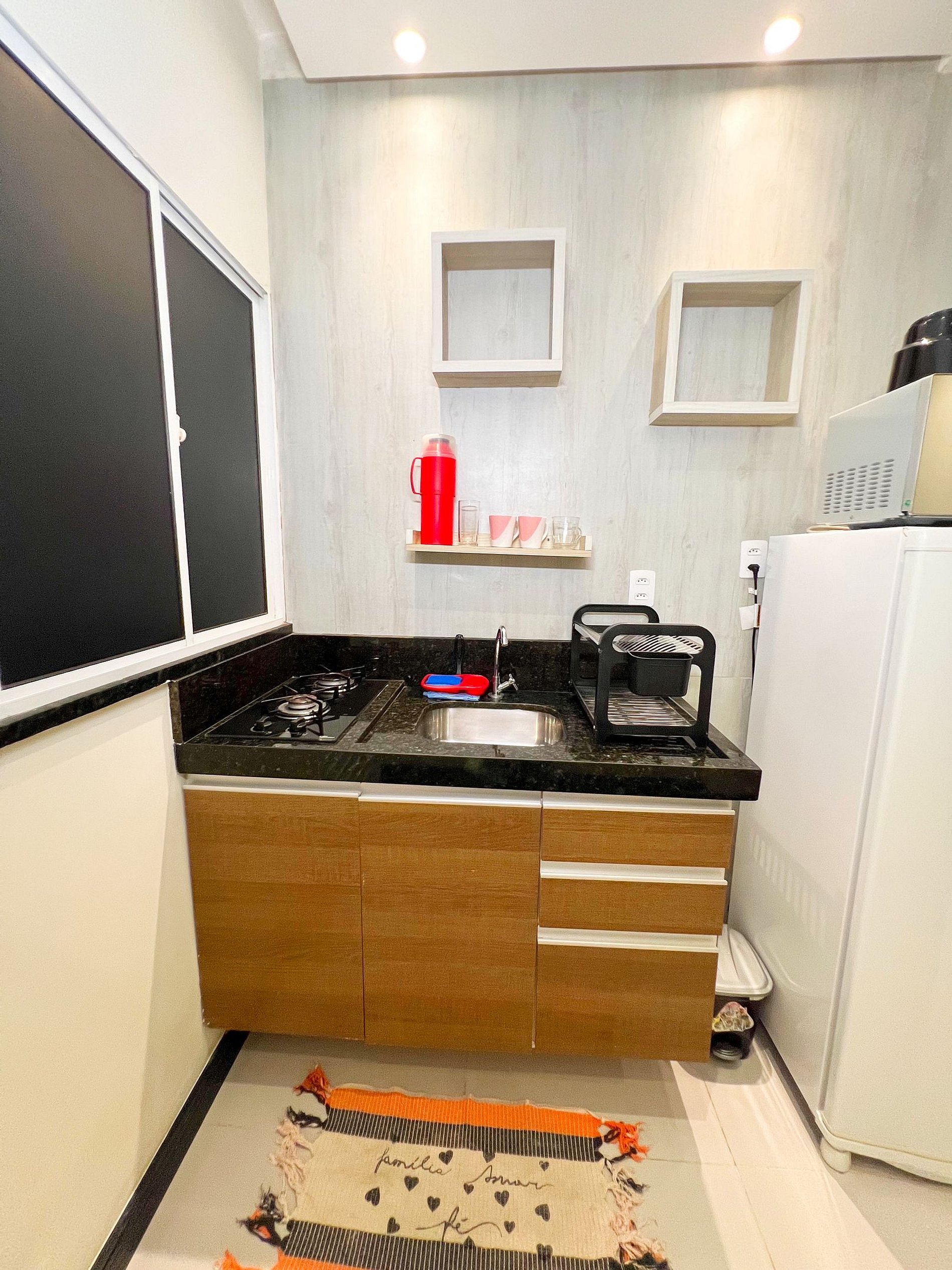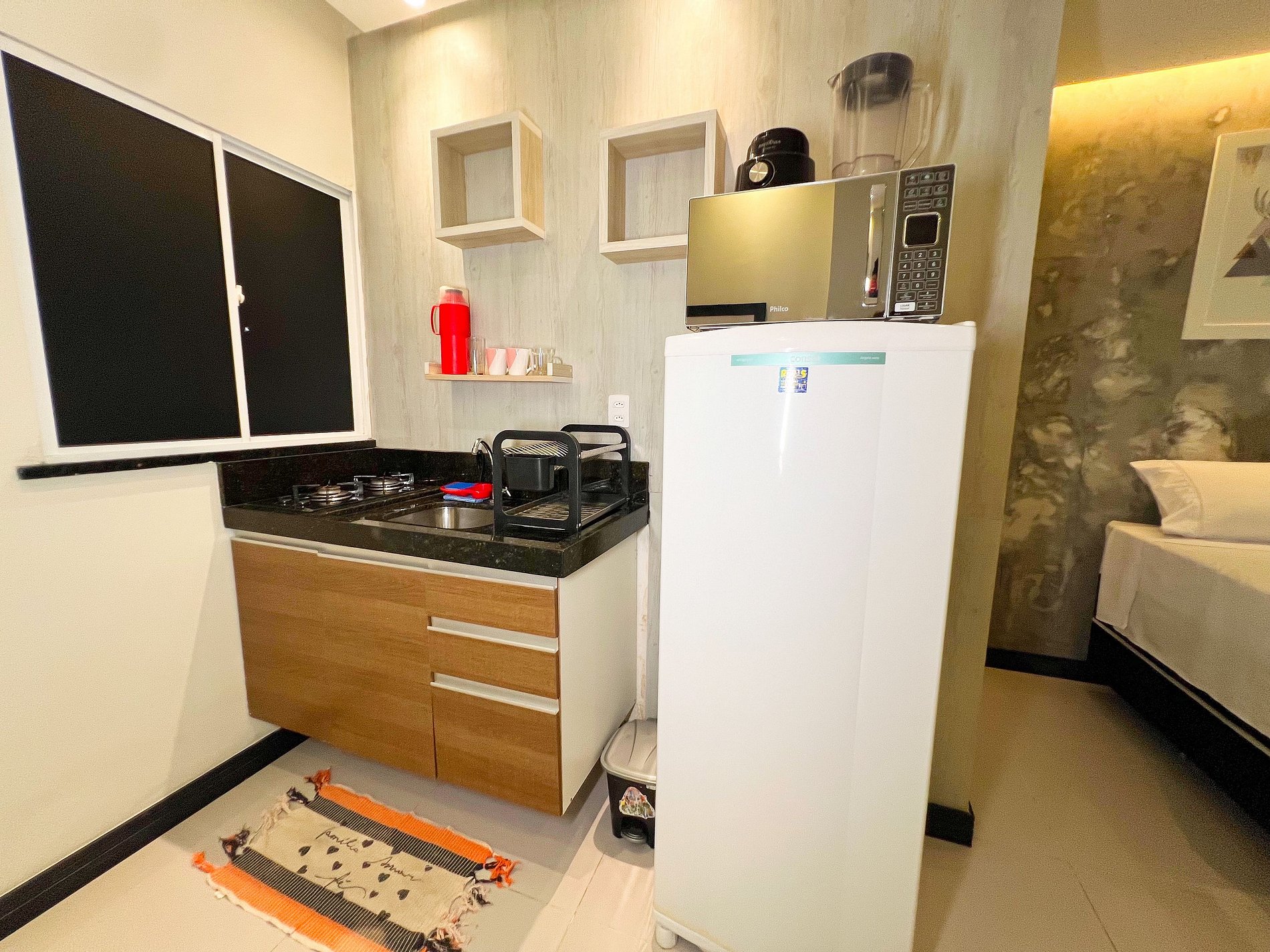 O espaço contem uma cozinha completa e equipada com um cooktop de 2 bocas, liquidificador, panelas e micro ondas.