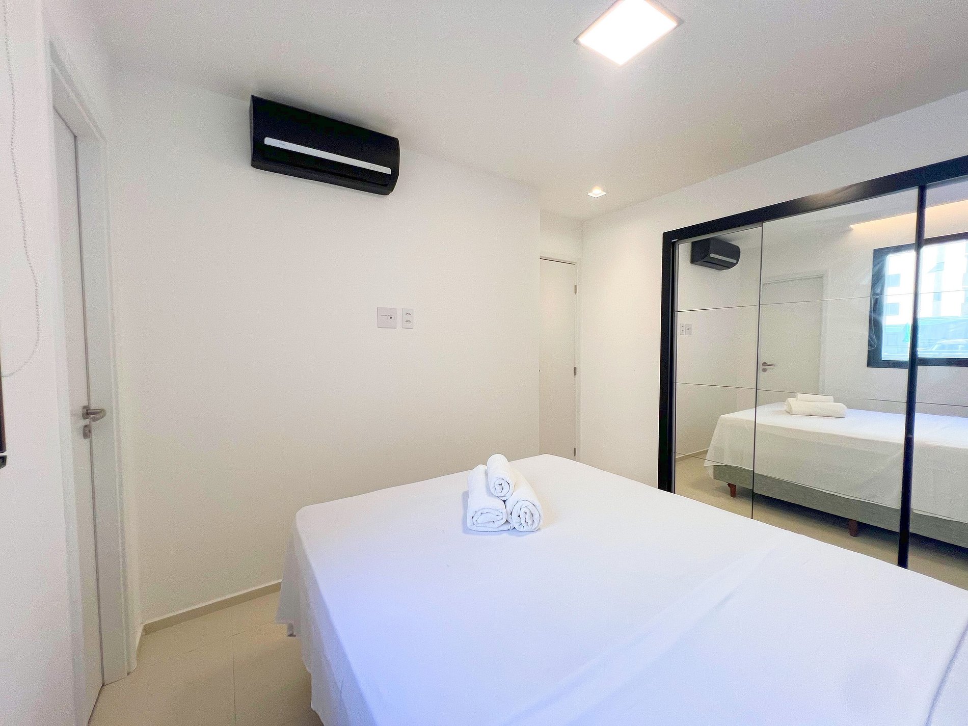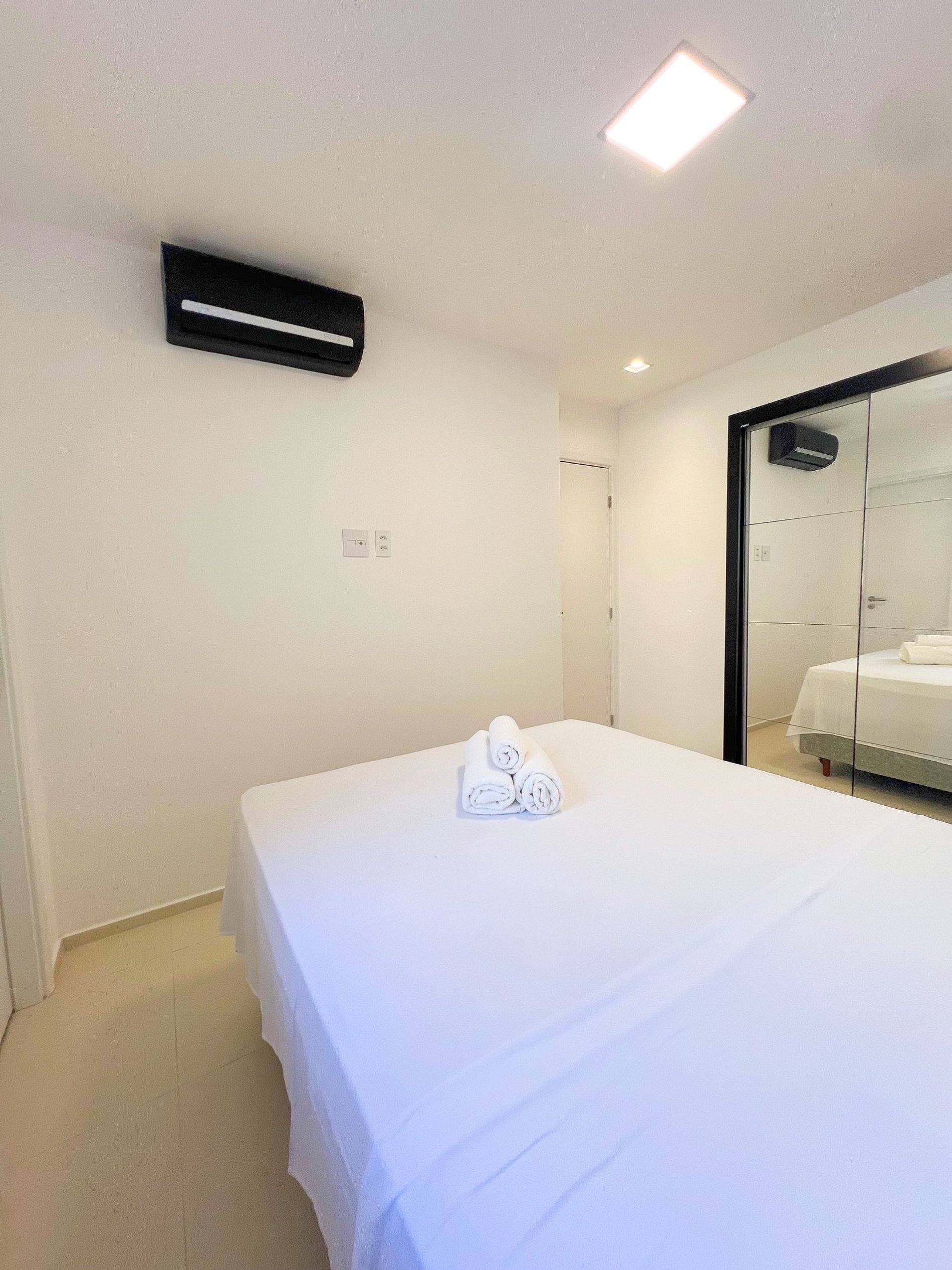 Ar-Condicionado e armário espaçoso para organizar suas roupas.