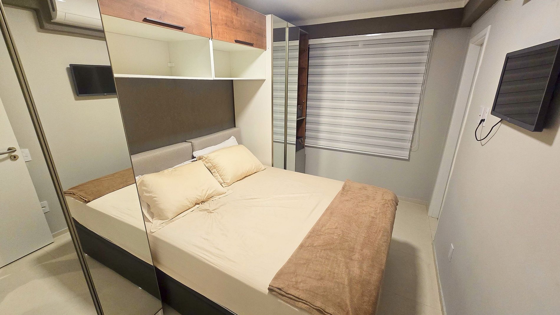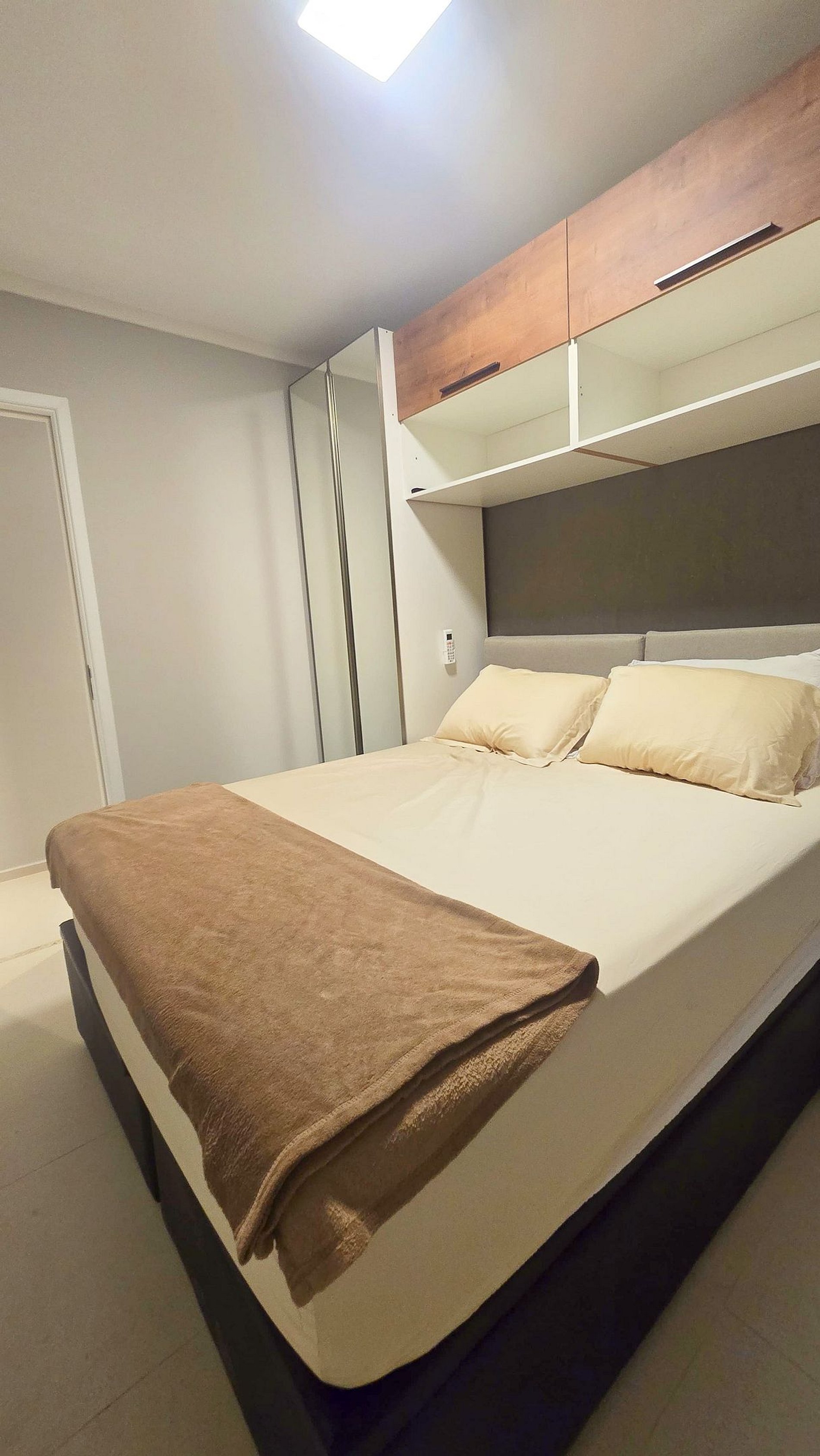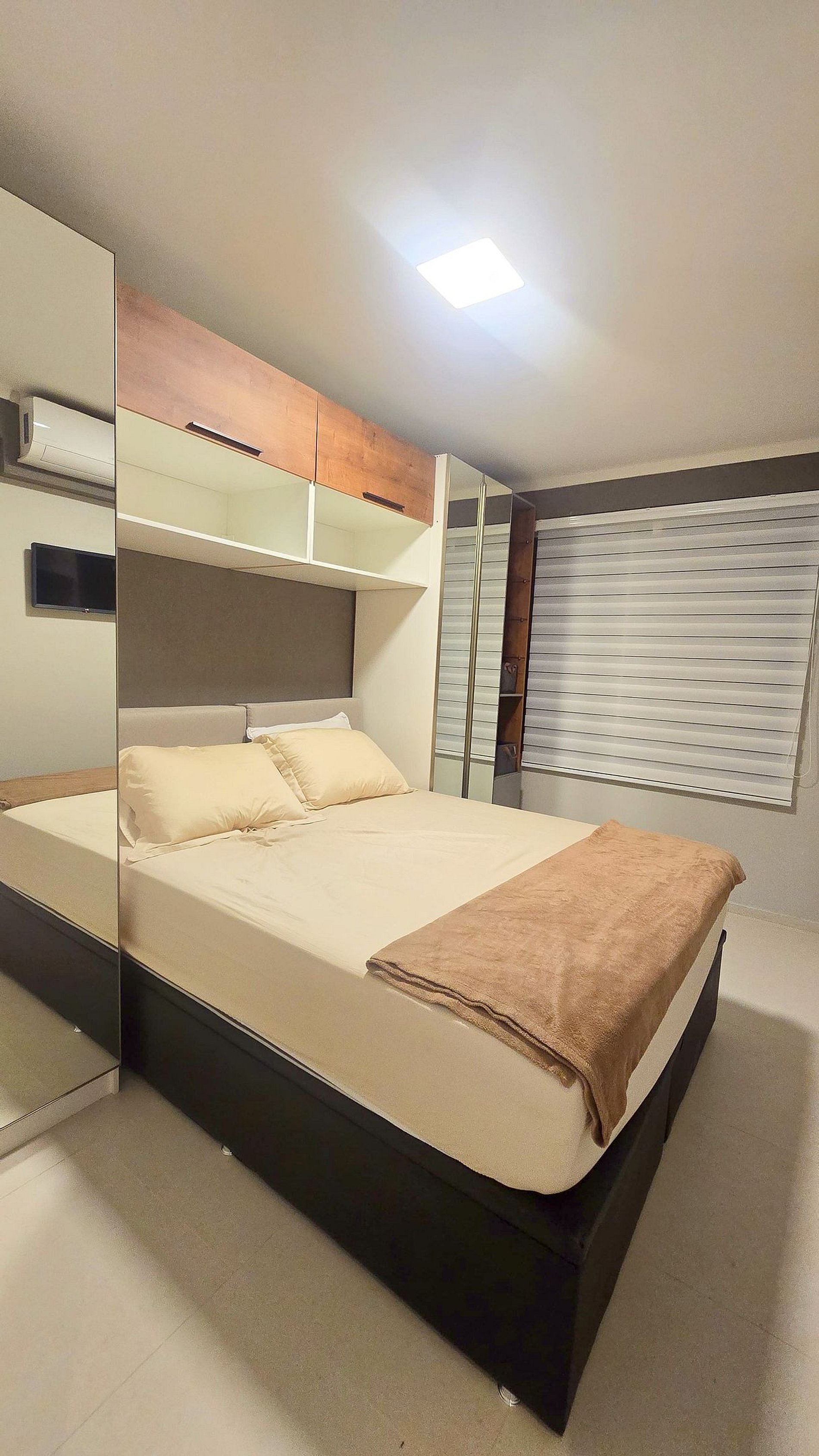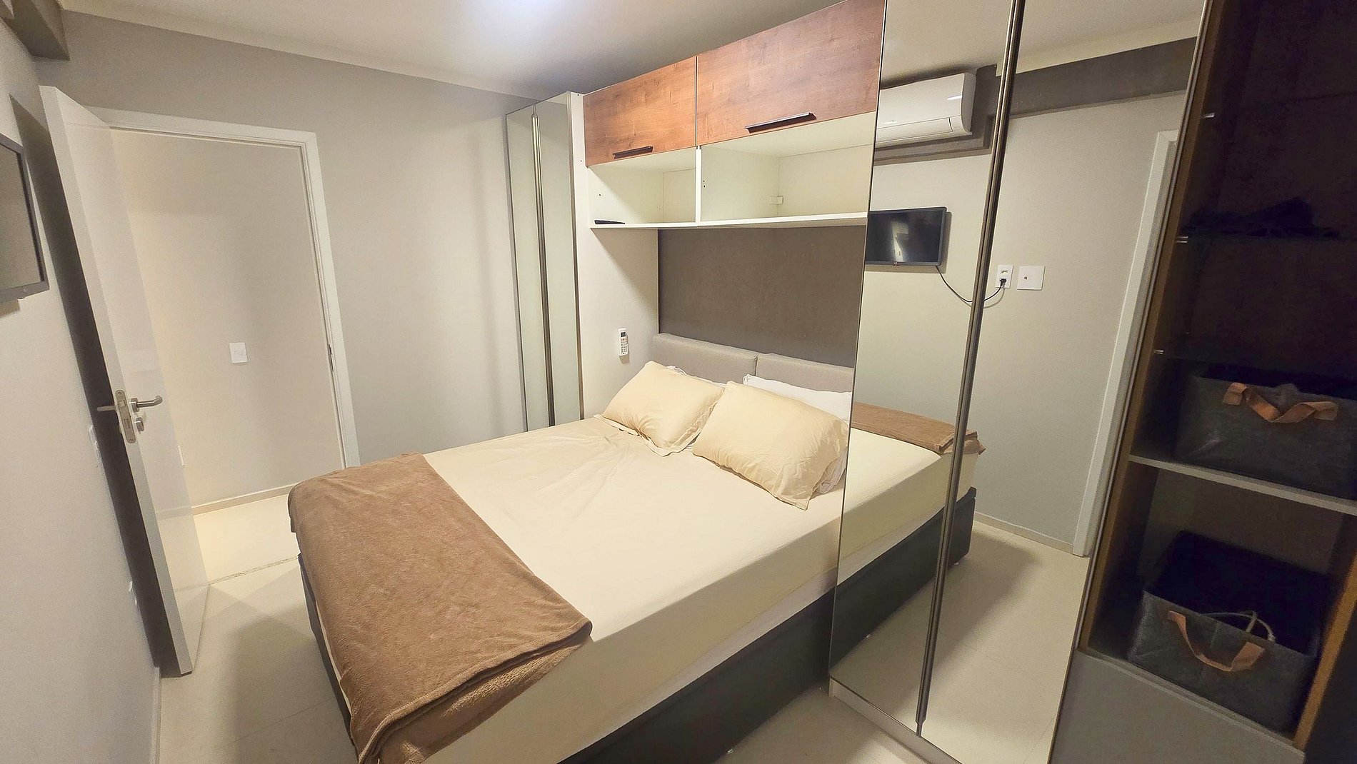 Ar-Condicionado e armário espaçoso para organizar suas roupas.
