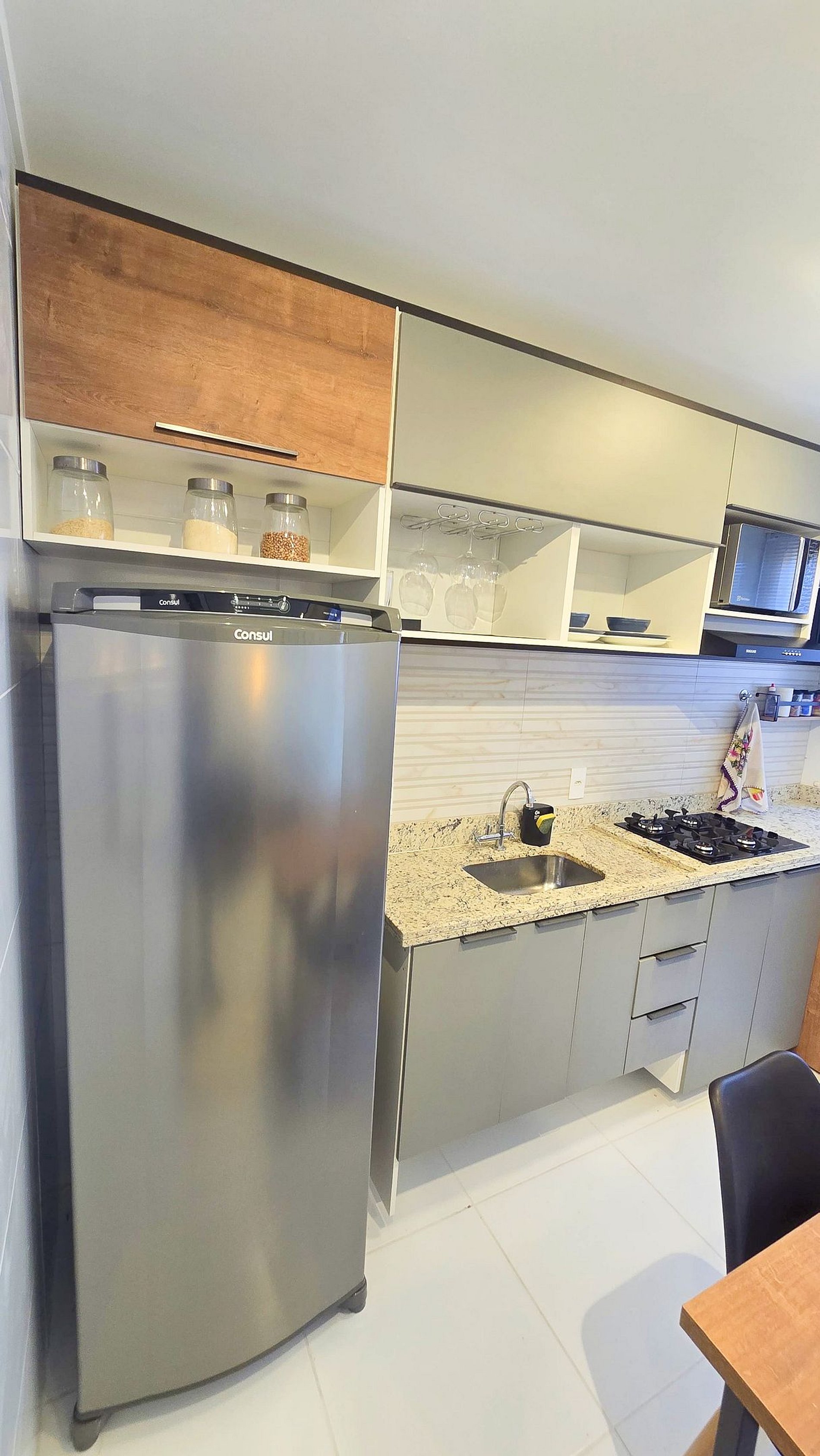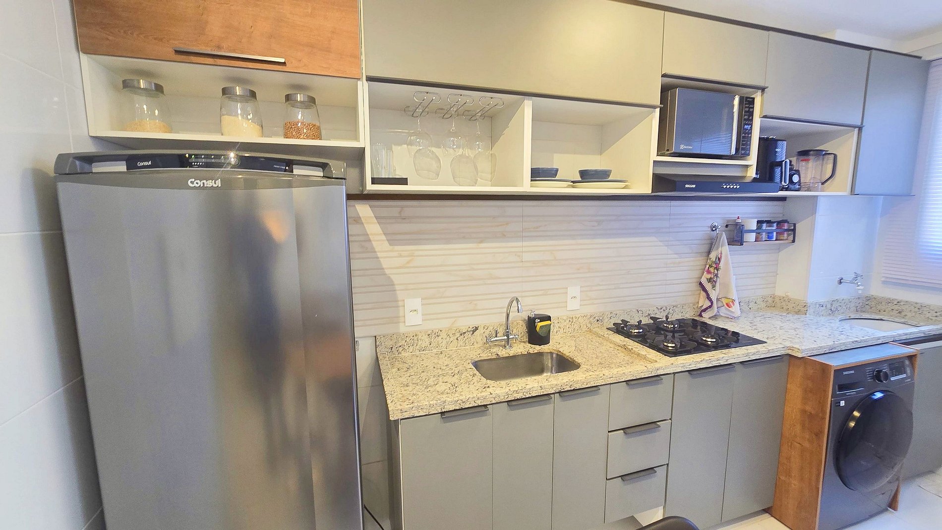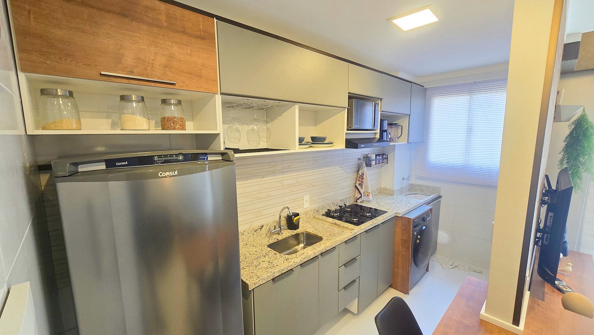 Extremamente bem equipada com geladeira, fogão, micro-ondas, air fryer, liquidificador e todos os utensílios que você precisa para preparar suas refeições como se estivesse em casa.