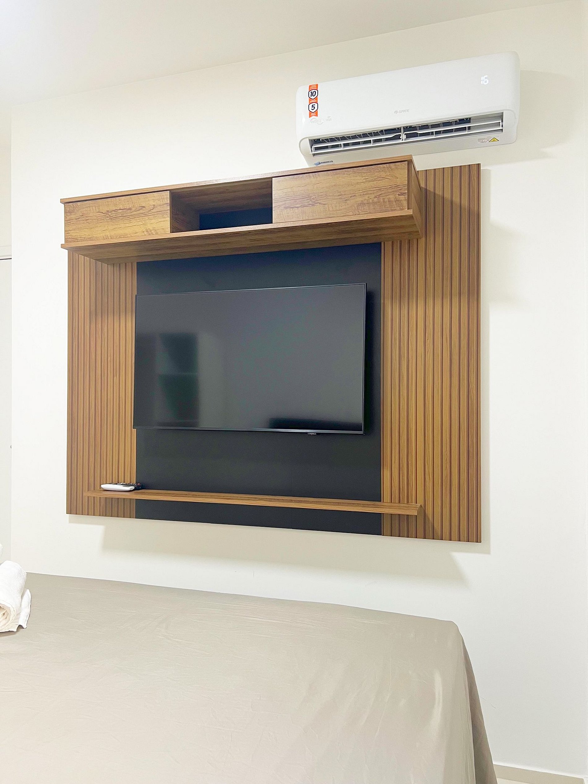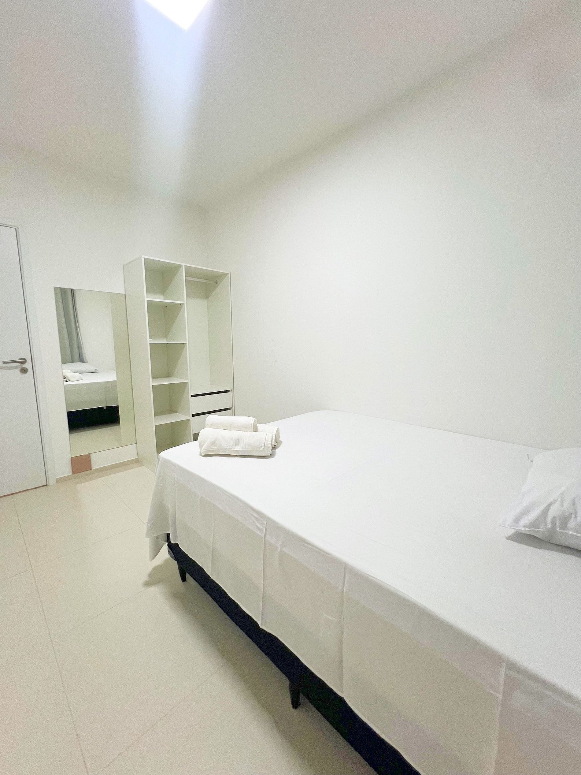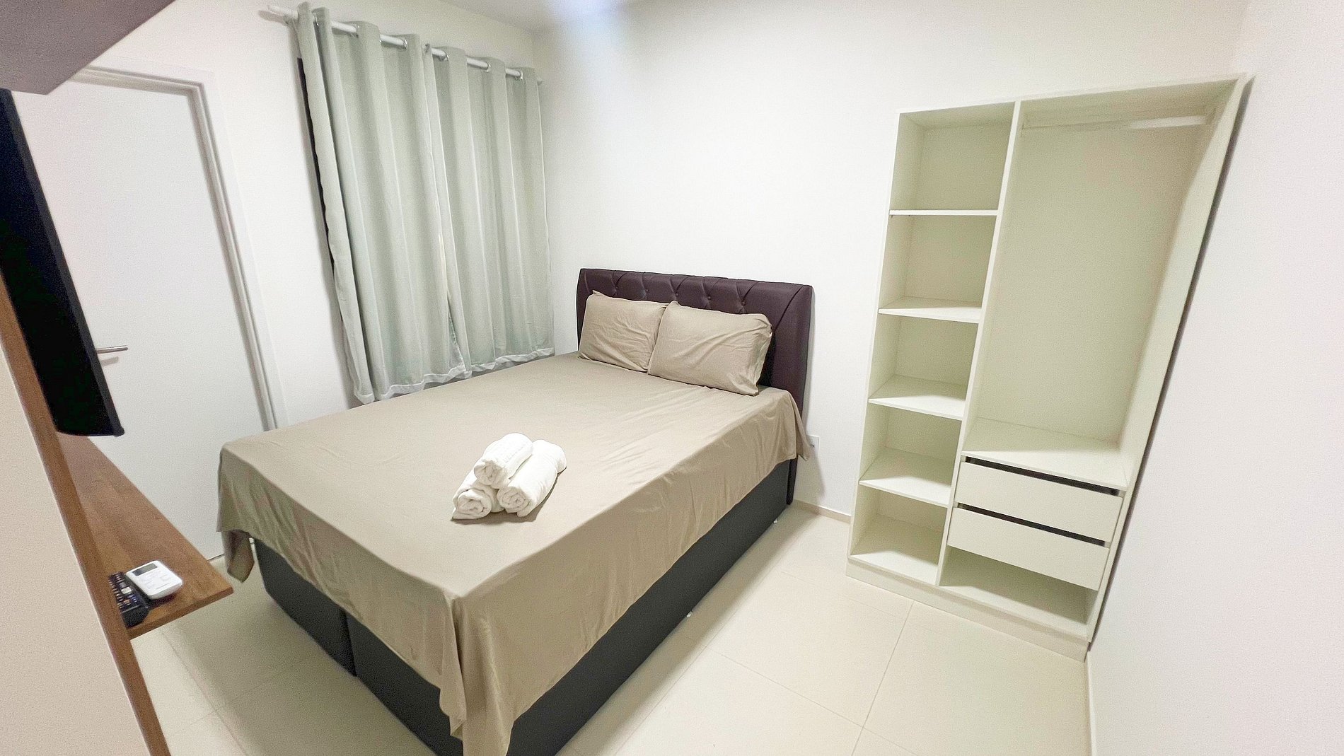 Ar-Condicionado e armário espaçoso para organizar suas roupas.