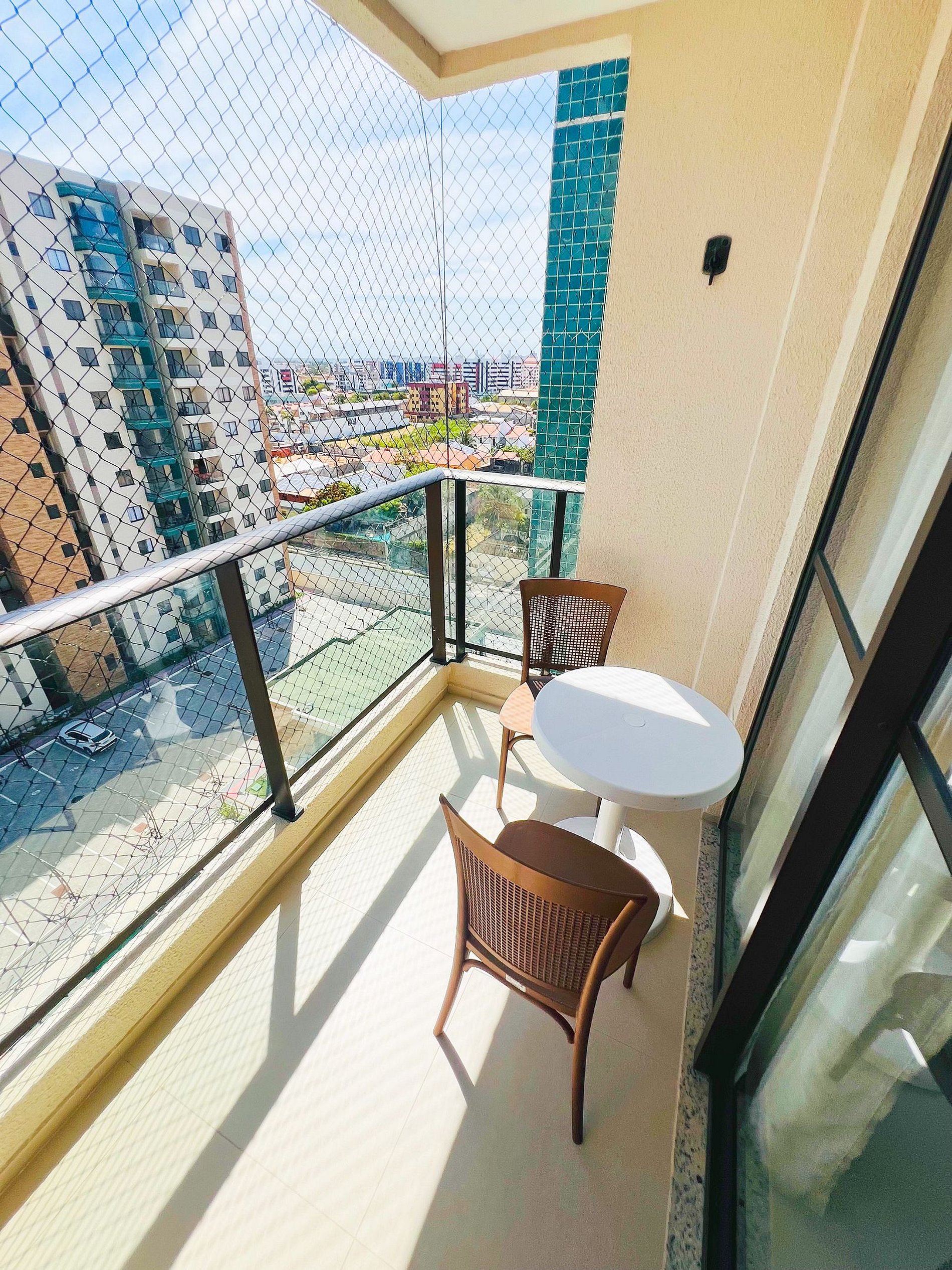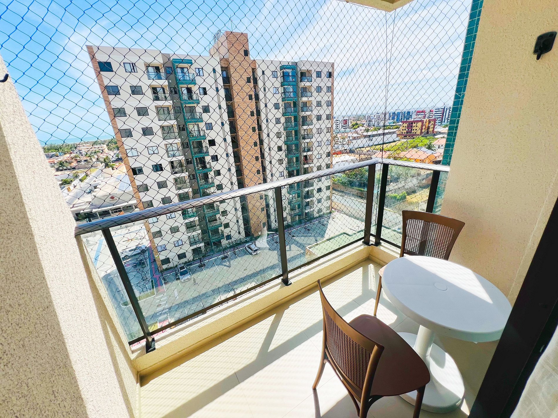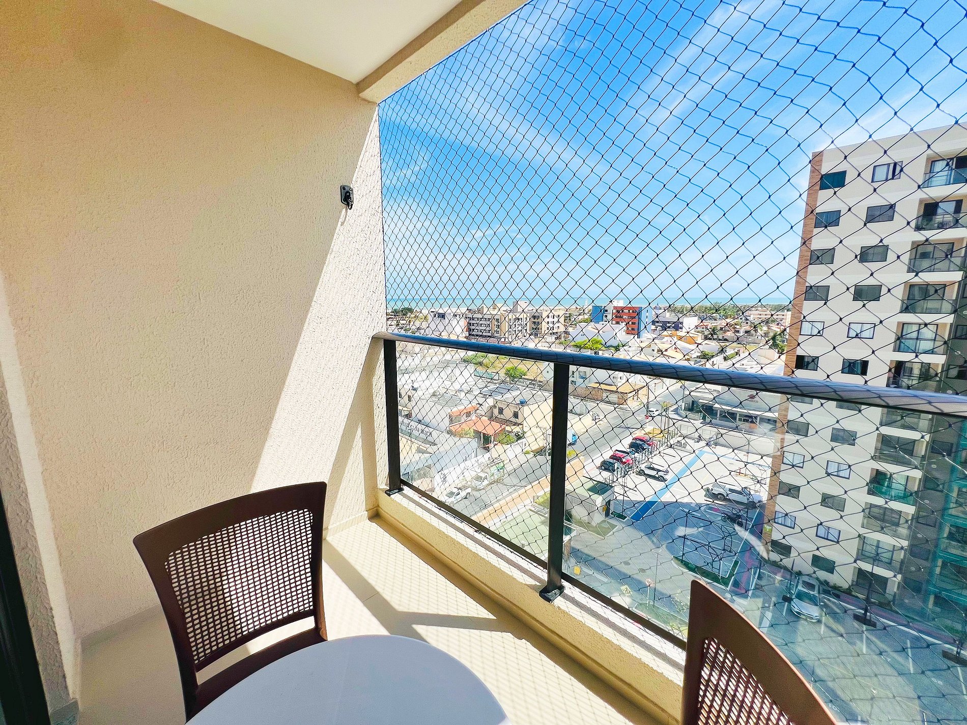 Varanda: Localizada em andar alto, é o nosso ponto alto! Desfrute da varanda com vista panorâmica para o mar e da brisa constante que torna o ambiente incrivelmente ventilado.