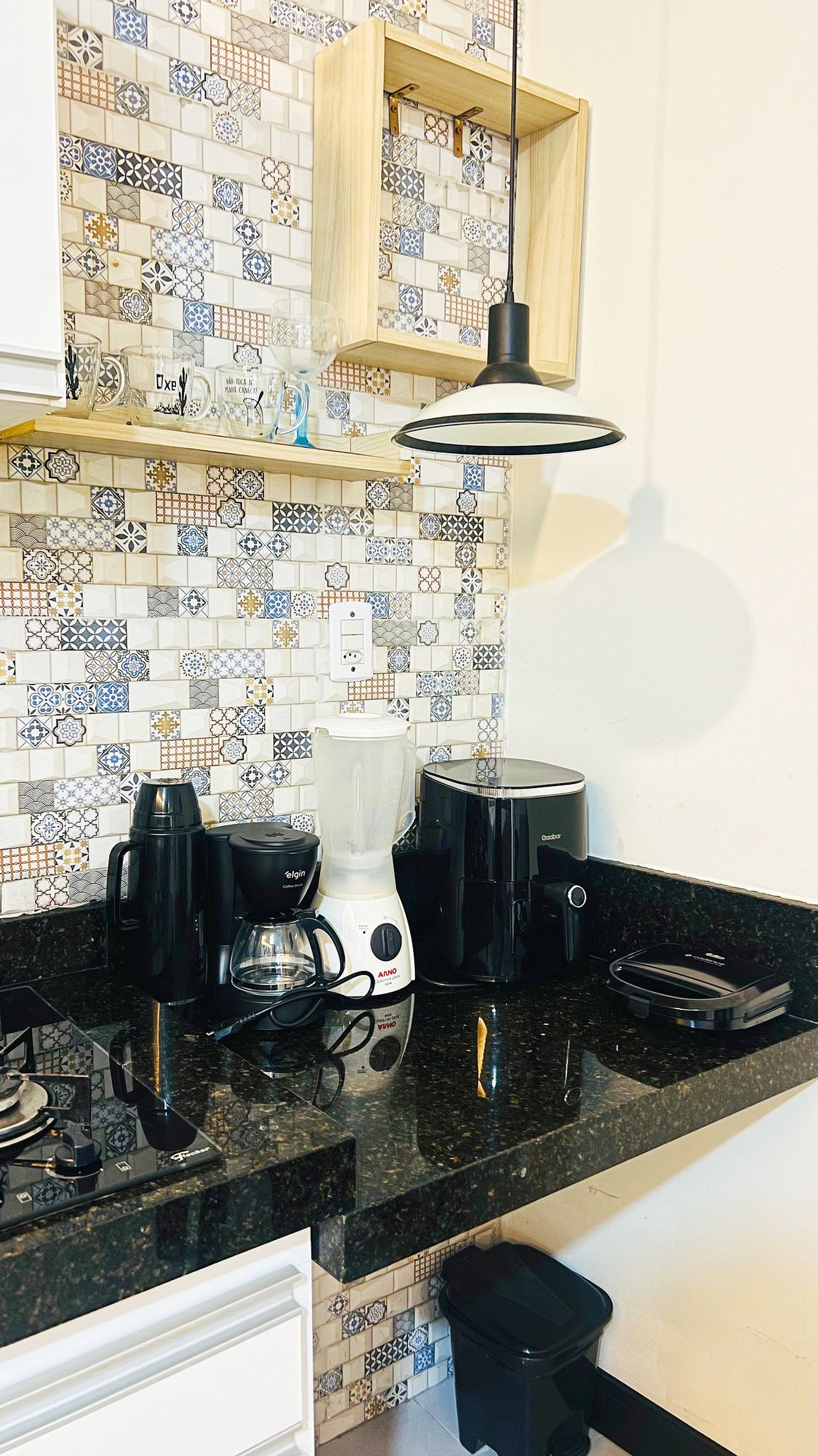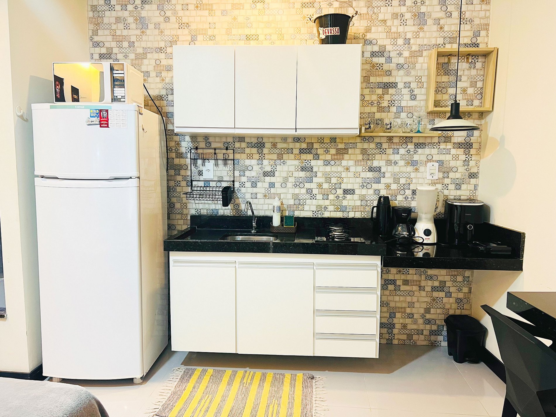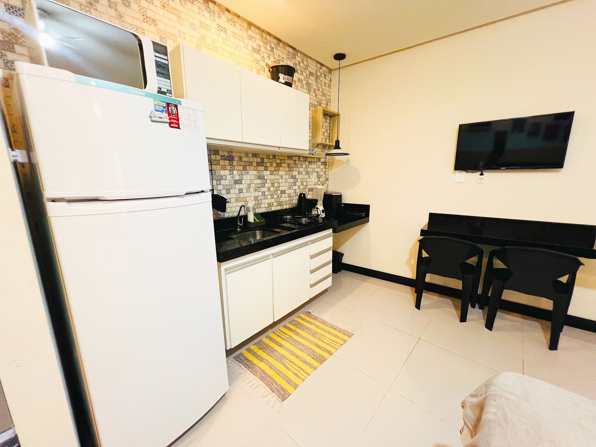Cozinha compacta 100% equipada ( panelas, utensílios, talheres, copos, pratos, canecas, microondas, cooktop 2 bocas, sanduicheira, liquidificador)