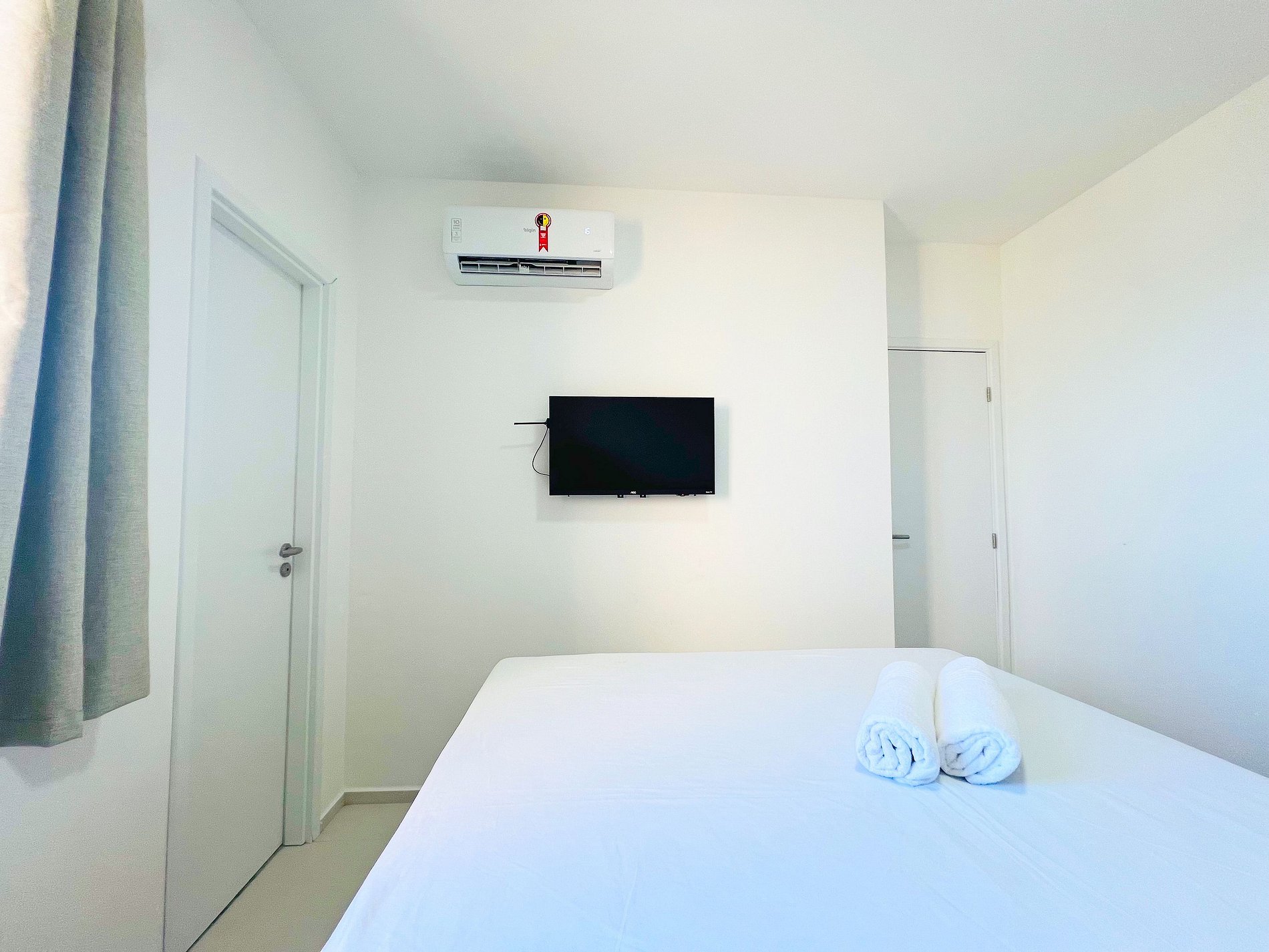 Quarto Principal (Suíte): Cama de casal super confortável, armário e ar-condicionado