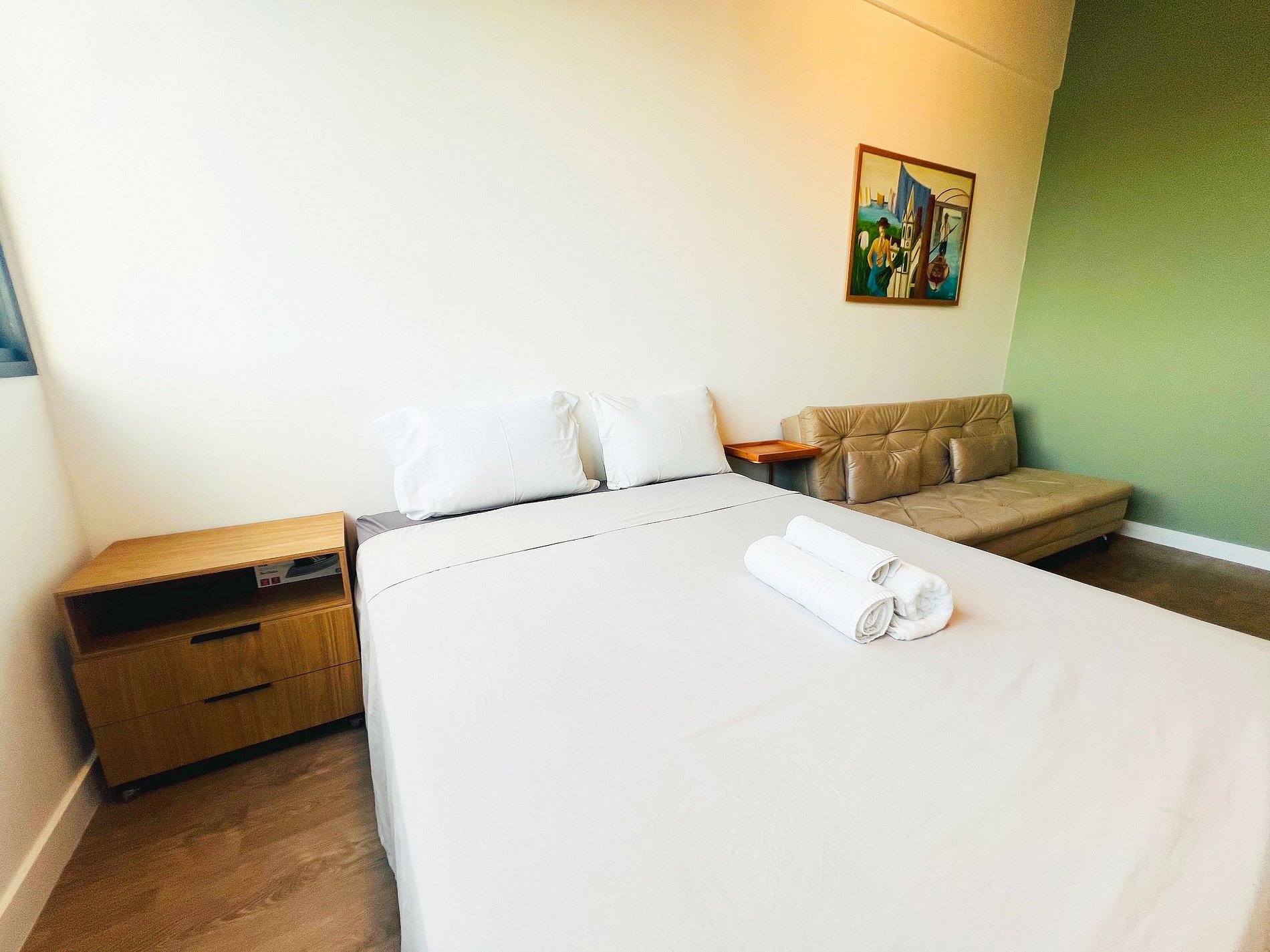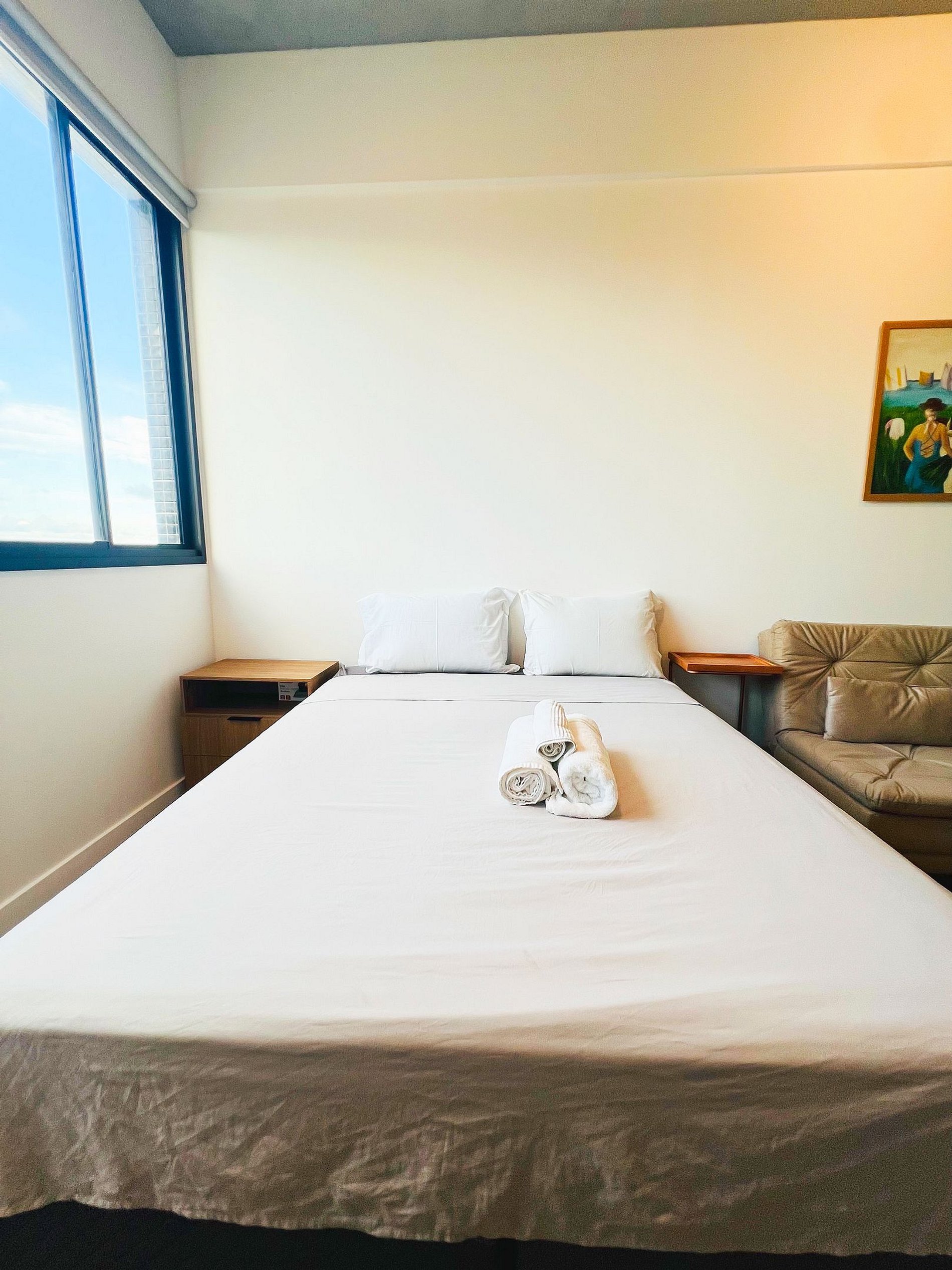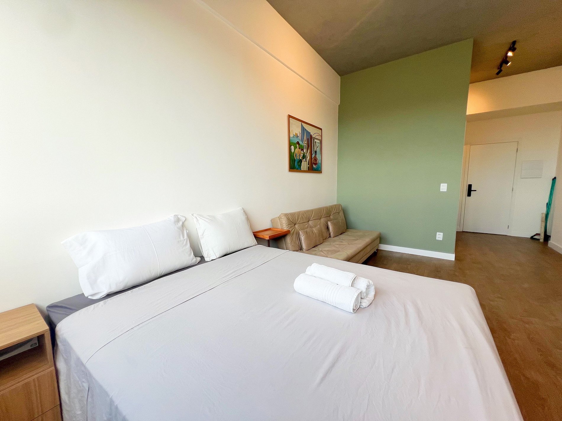 - Descanso de Qualidade: A cama de casal possui enxoval selecionado e o sofá-cama é de fácil manuseio, garantindo que até 4 hóspedes se acomodem com conforto, sem comprometer a circulação do ambiente.