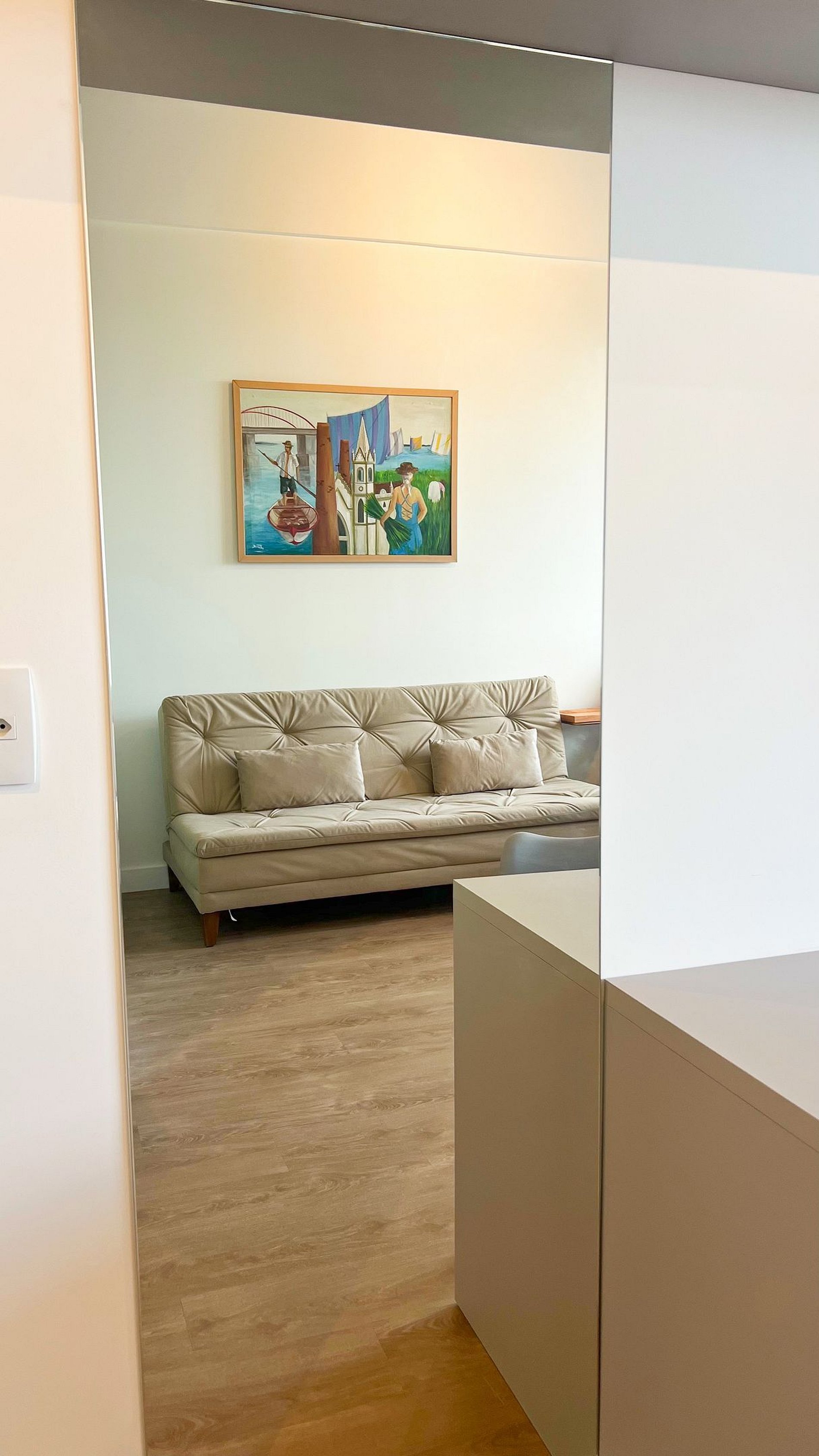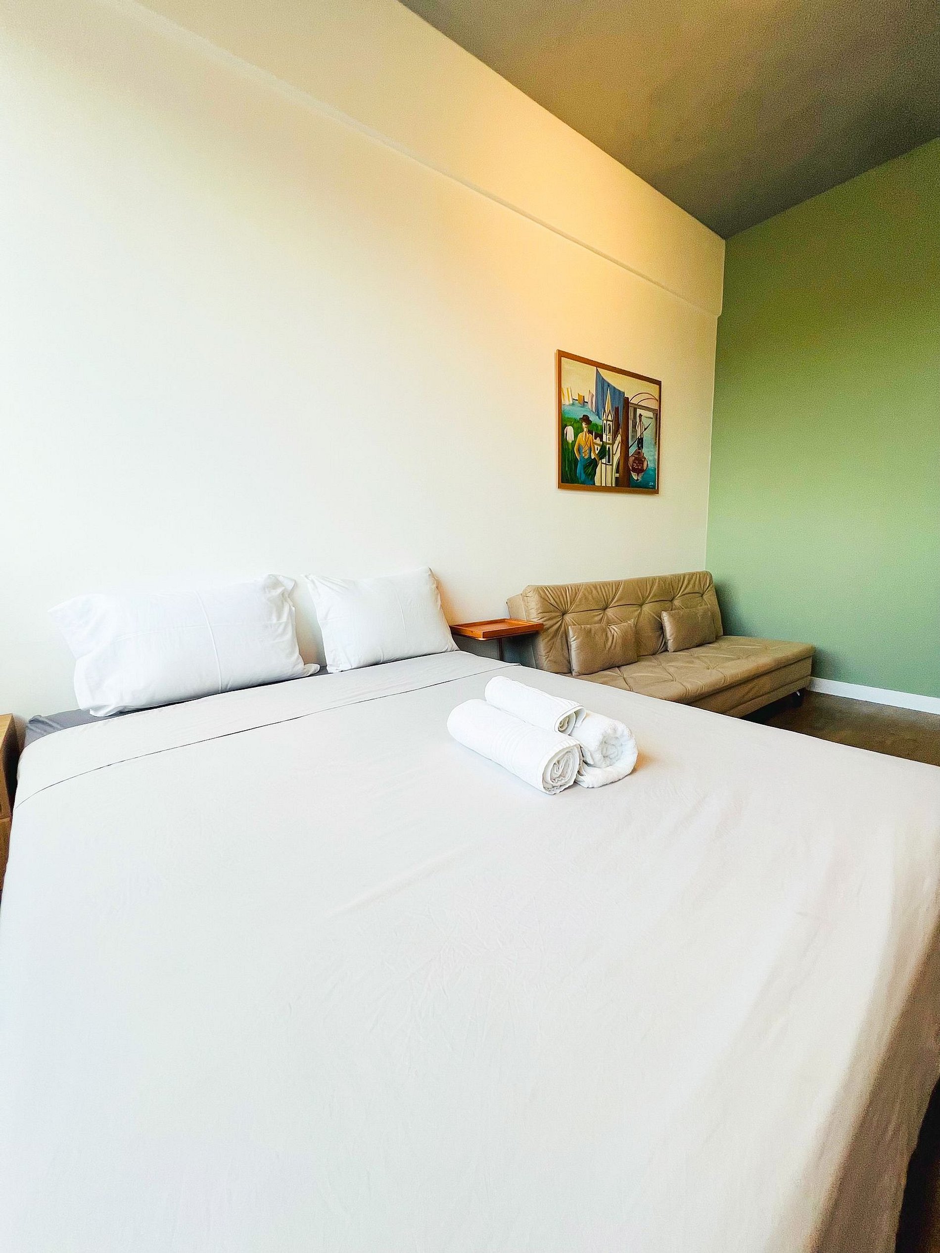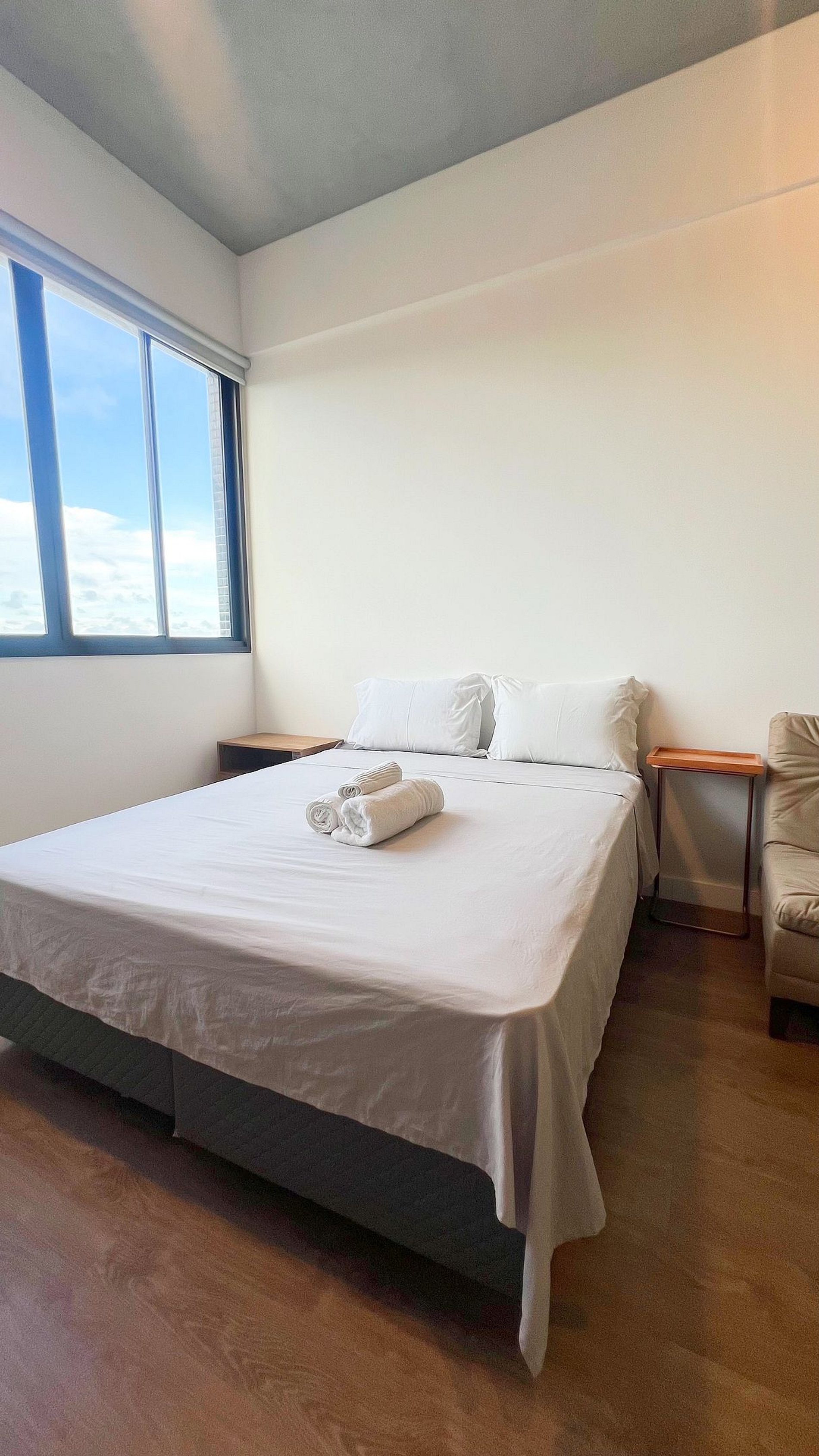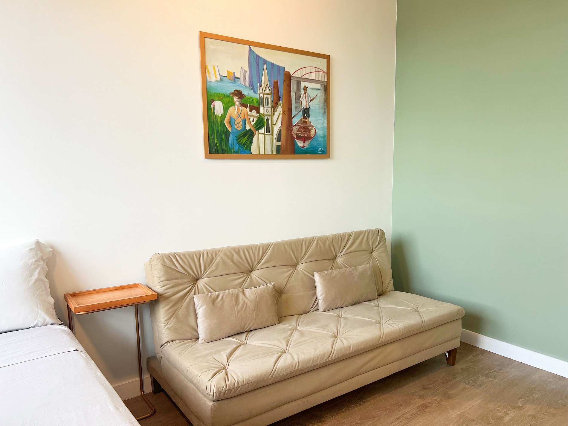 - Descanso de Qualidade: A cama de casal possui enxoval selecionado e o sofá-cama é de fácil manuseio, garantindo que até 4 hóspedes se acomodem com conforto, sem comprometer a circulação do ambiente.