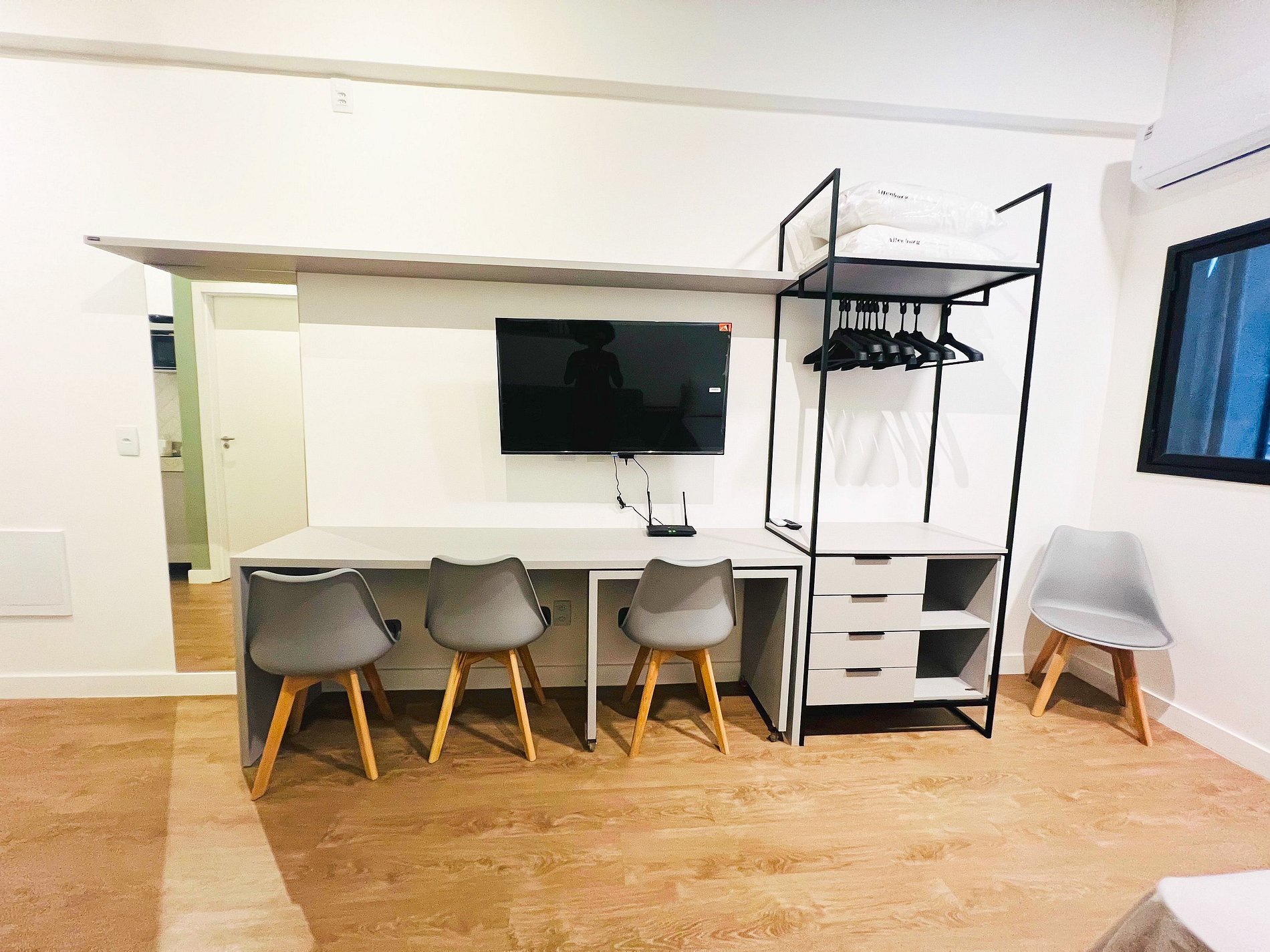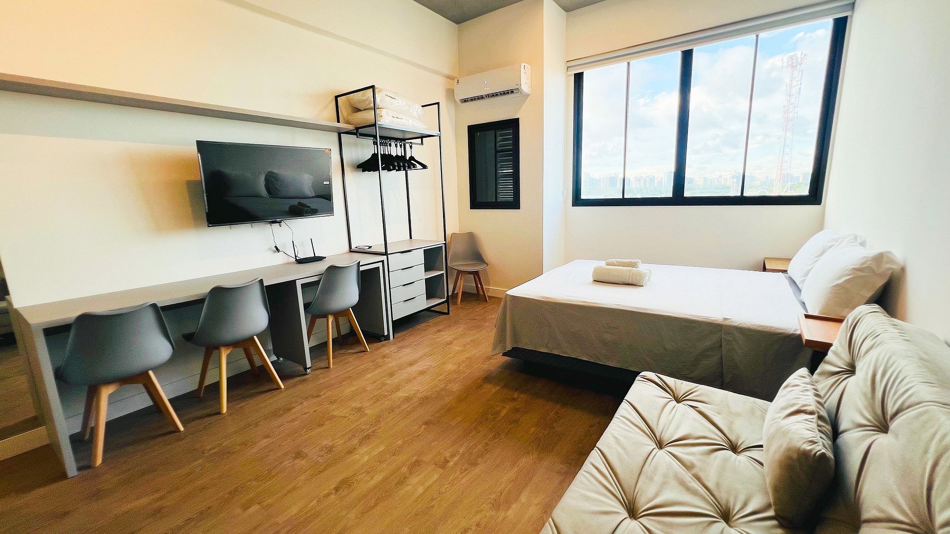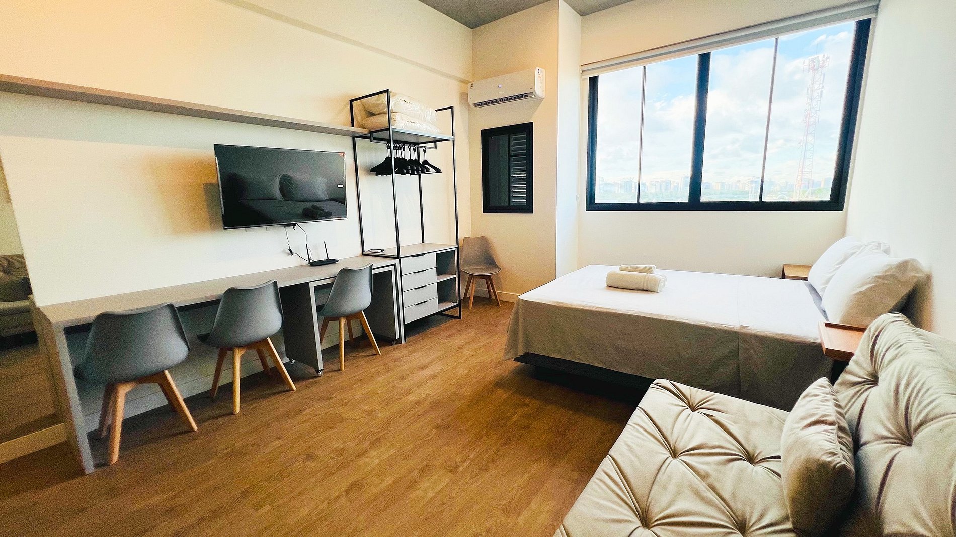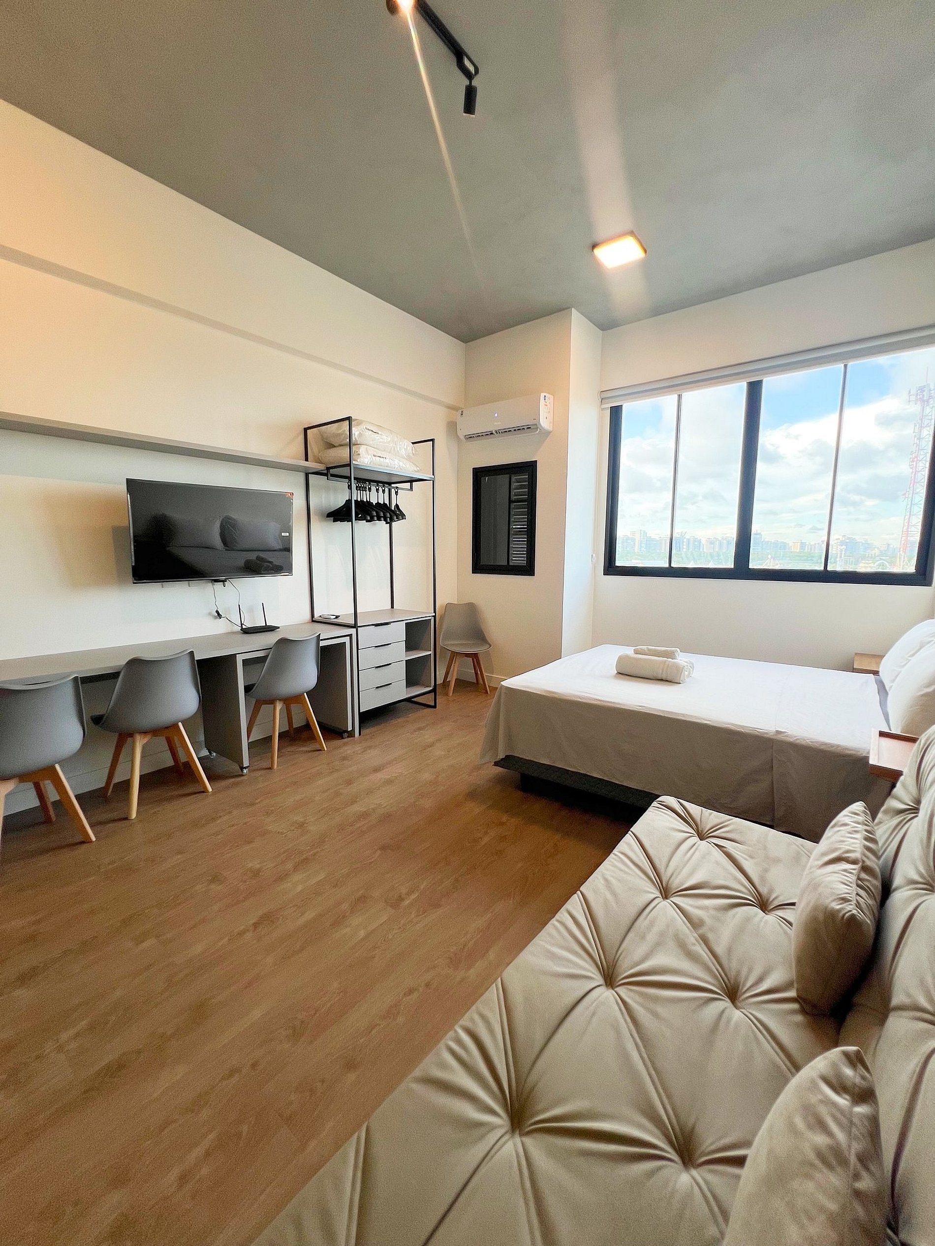 Este estúdio foi projetado para oferecer o máximo de funcionalidade em um ambiente moderno e minimalista. Seja para uma viagem de lazer ou um período de trabalho remoto, você encontrará tudo o que precisa: