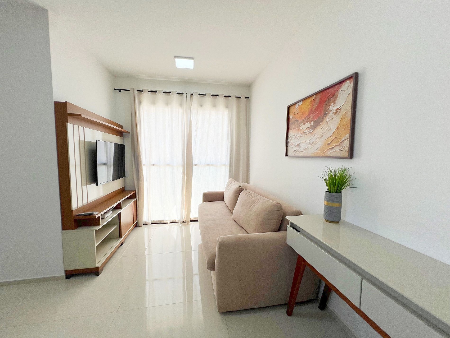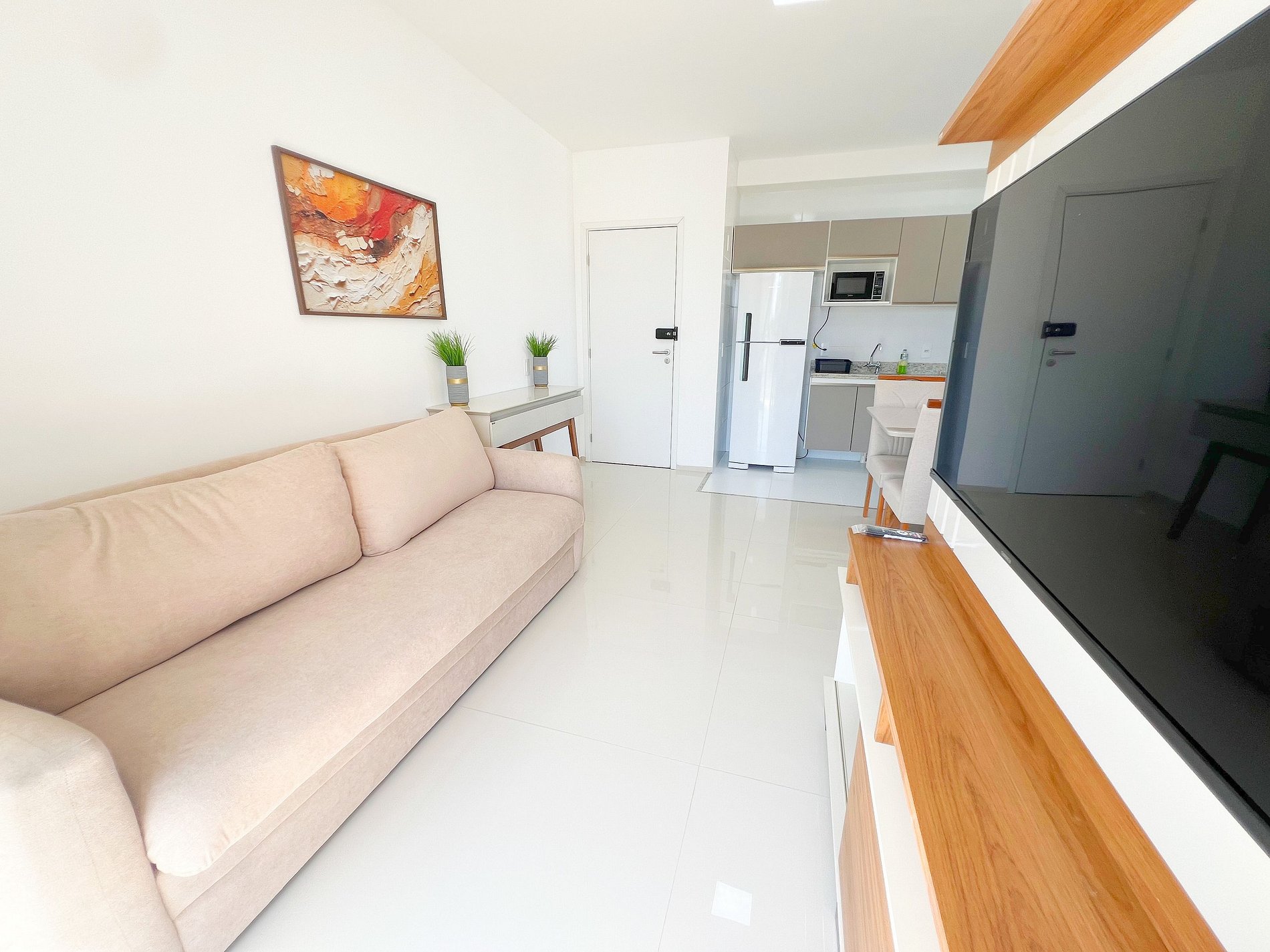 Entretenimento e Conectividade A sala conta com uma Smart TV, pronta para você acessar sua conta da Netflix ou YouTube após um dia de praia. O Wi-Fi de alta velocidade cobre todo o apartamento, sendo ideal para quem precisa de estabilidade para trabalhar (anywhere office) ou apenas navegar sem interrupções.