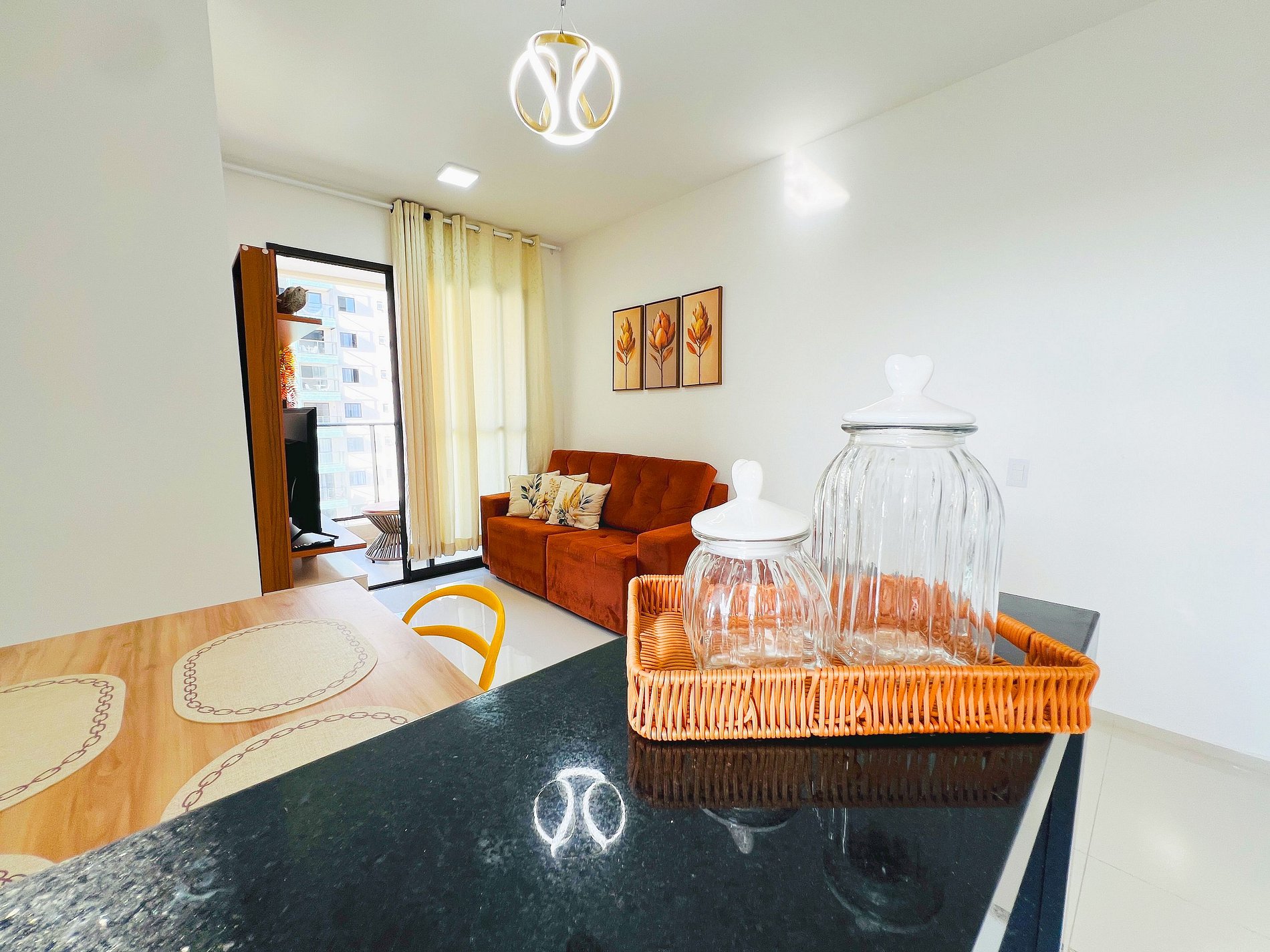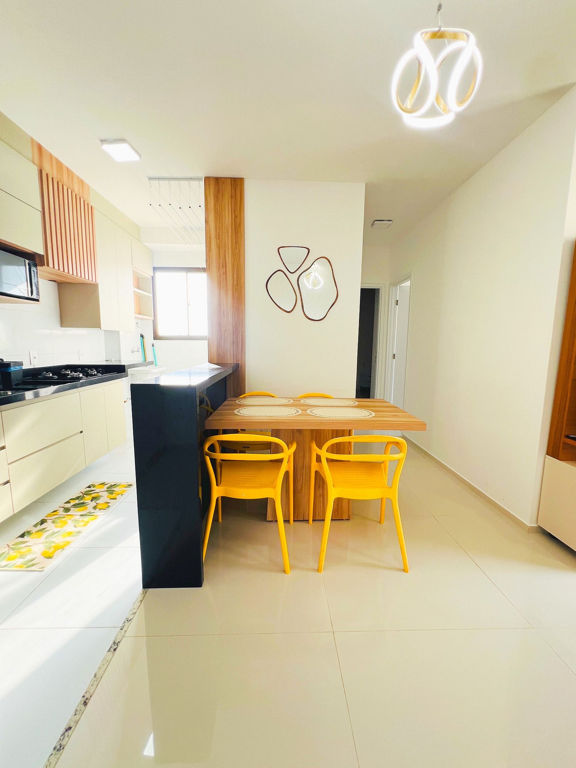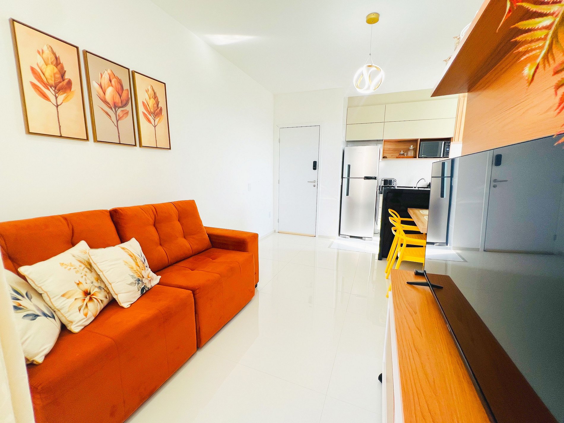 Design e Funcionalidade: A sala é moderna e iluminada, com um sofá aconchegante para suas maratonas de filmes. A cozinha é totalmente planejada e equipada com cooktop e micro-ondas, ideal para quem gosta de preparar refeições rápidas ou tomar um café com calma antes de descer para a Orla.