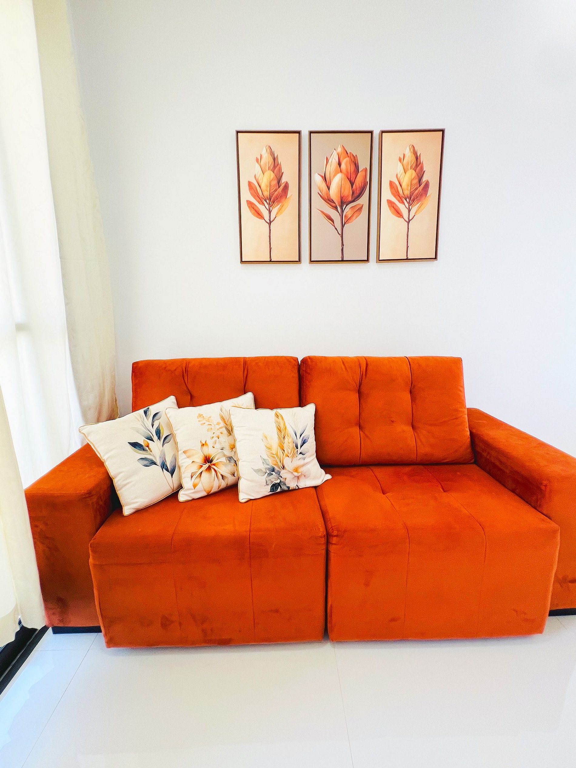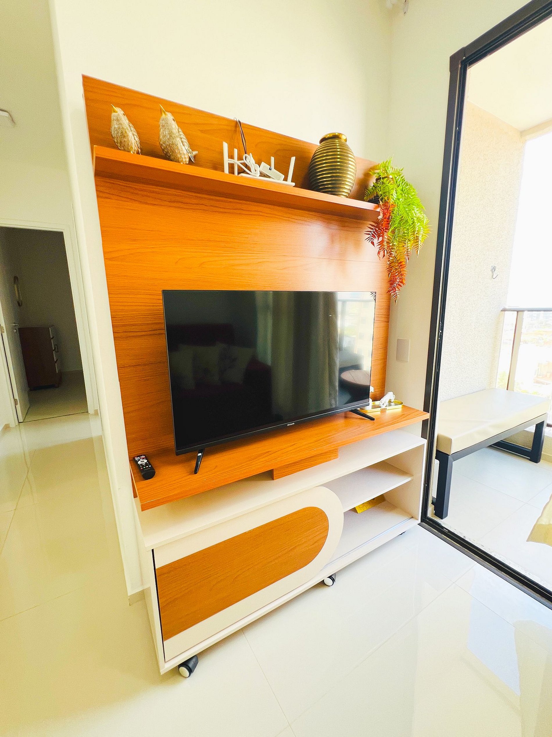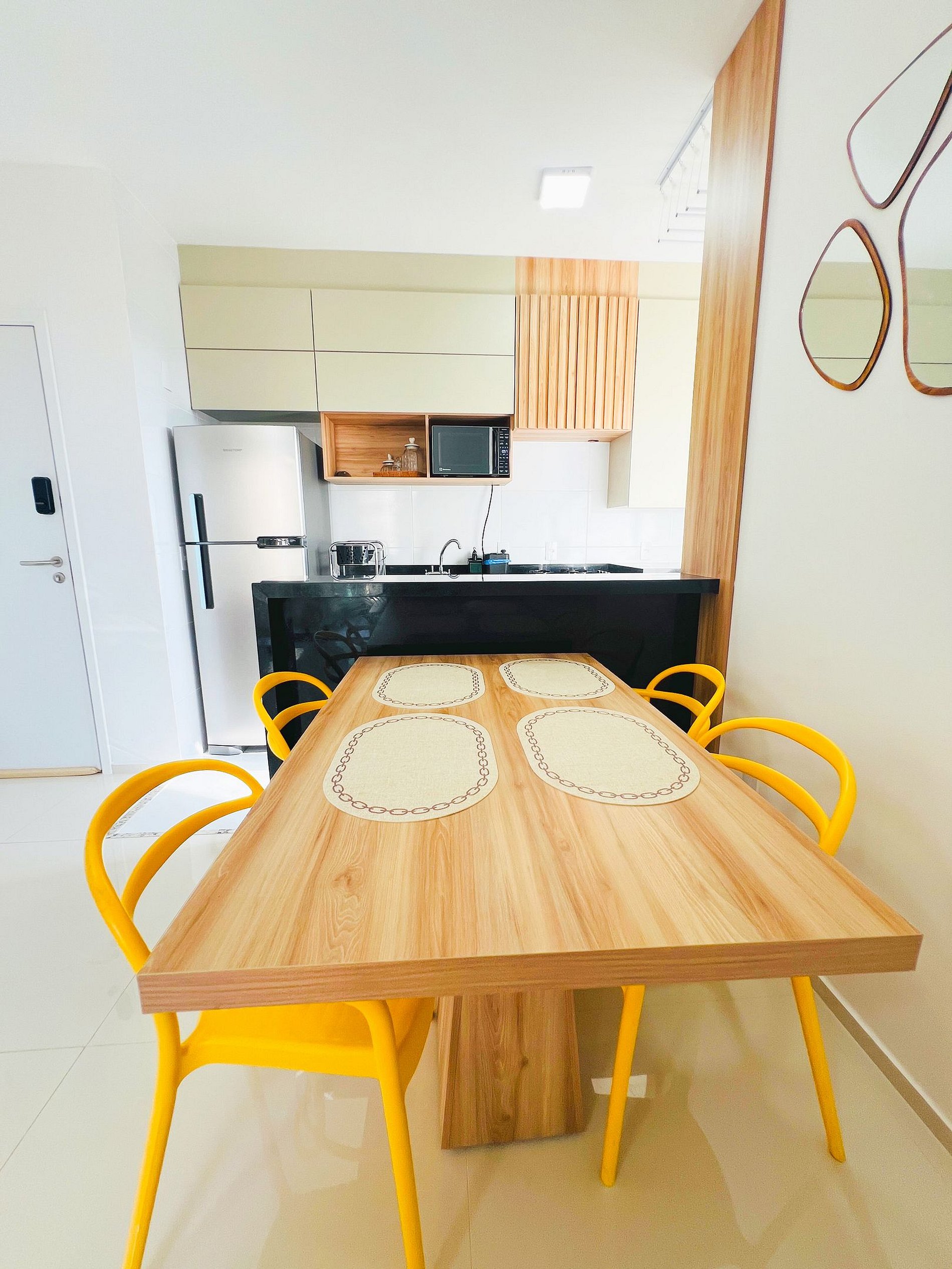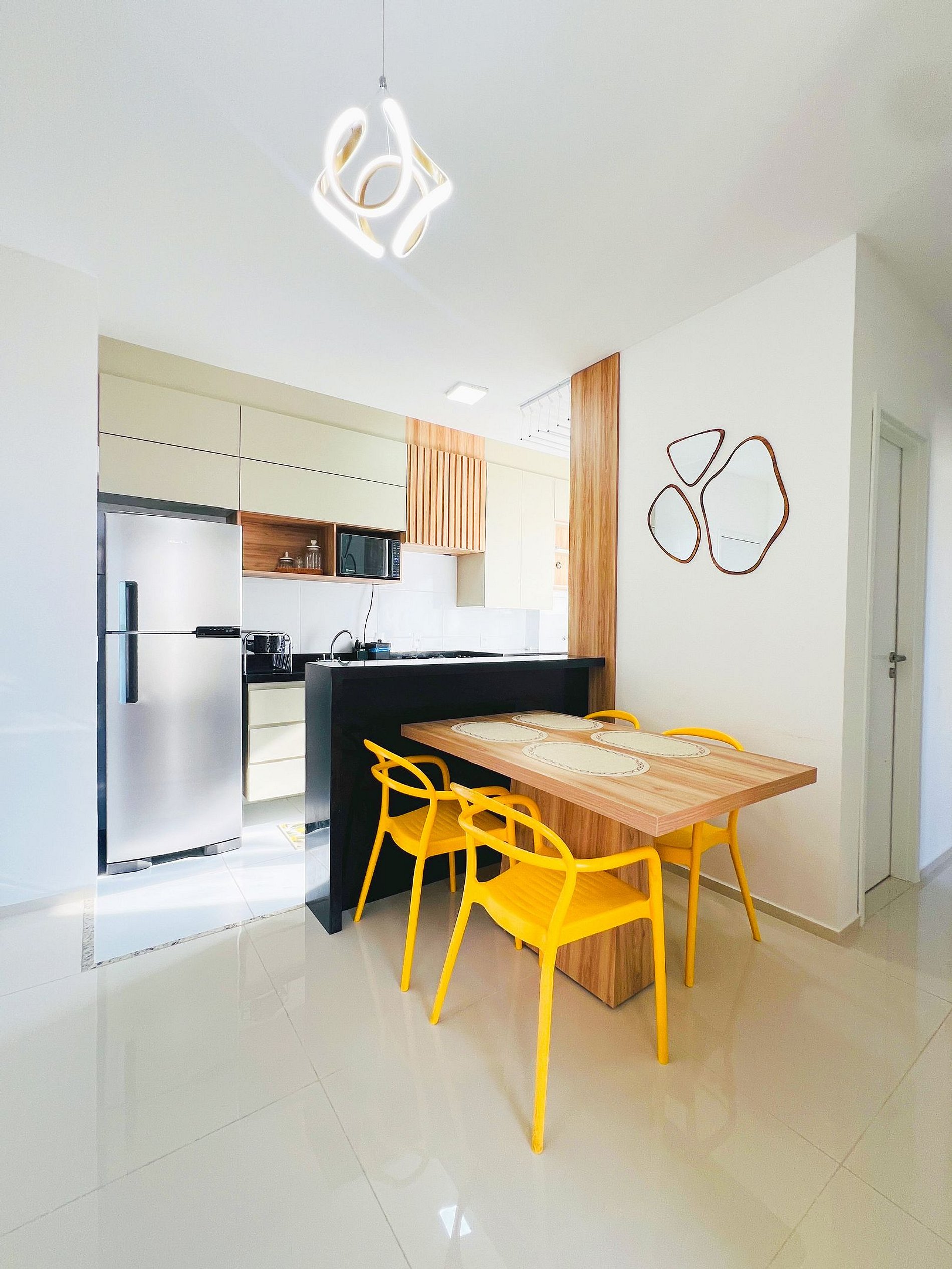 Design e Funcionalidade: A sala é moderna e iluminada, com um sofá aconchegante para suas maratonas de filmes. A cozinha é totalmente planejada e equipada com cooktop e micro-ondas, ideal para quem gosta de preparar refeições rápidas ou tomar um café com calma antes de descer para a Orla.