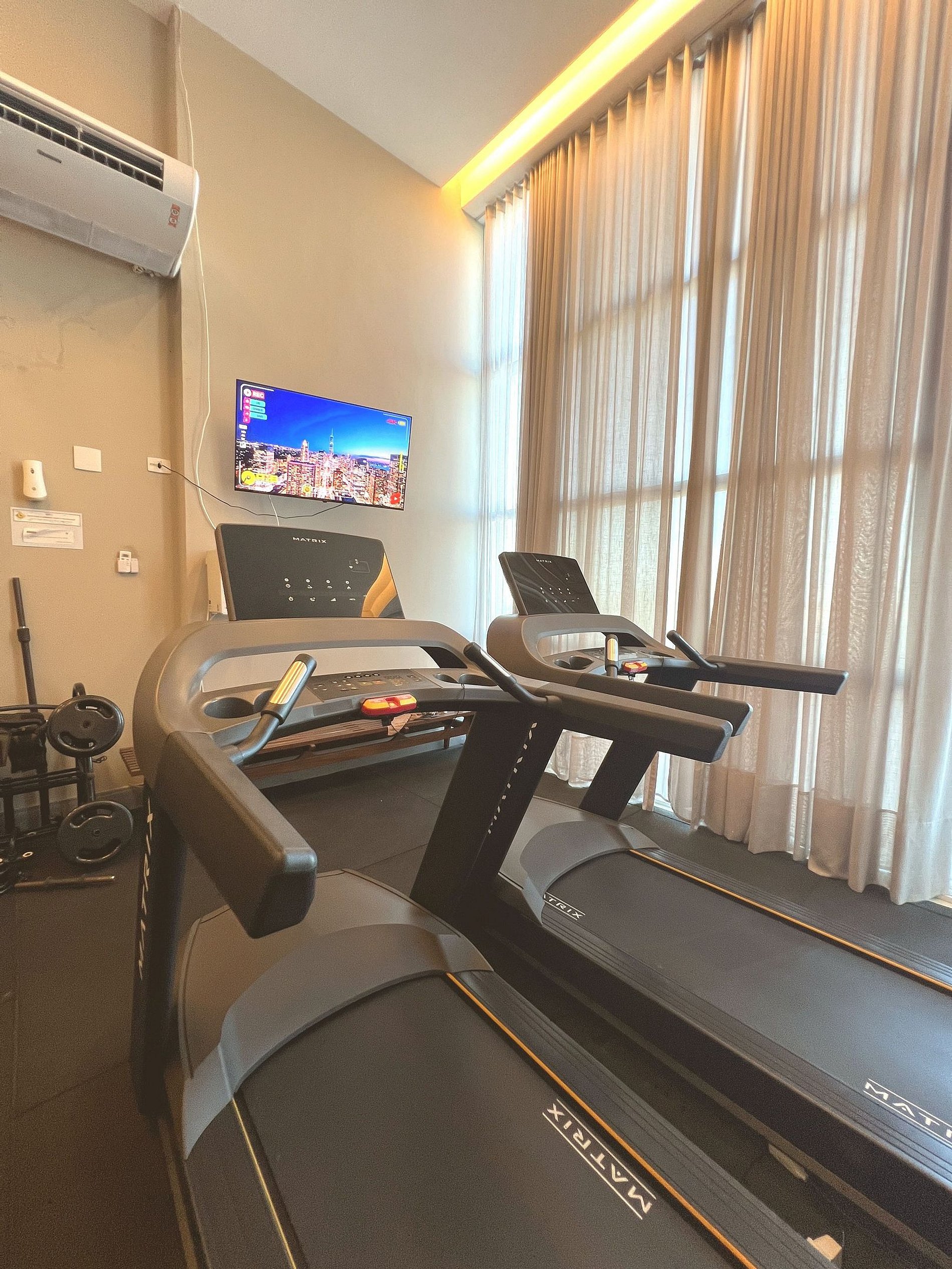 ● Academia de alto padrão com aparelhos Matrix (esteiras, bicicleta, musculação e halteres).