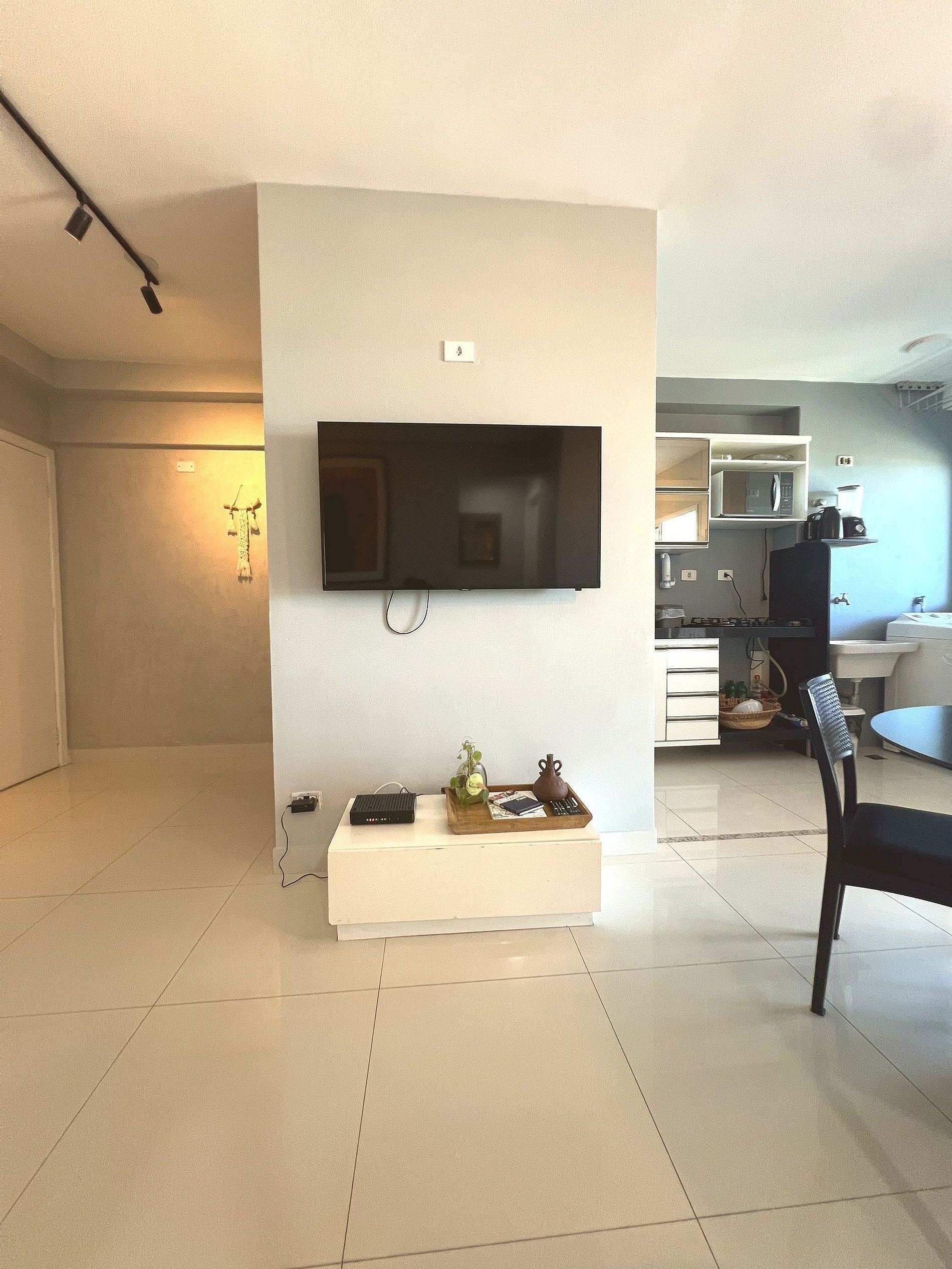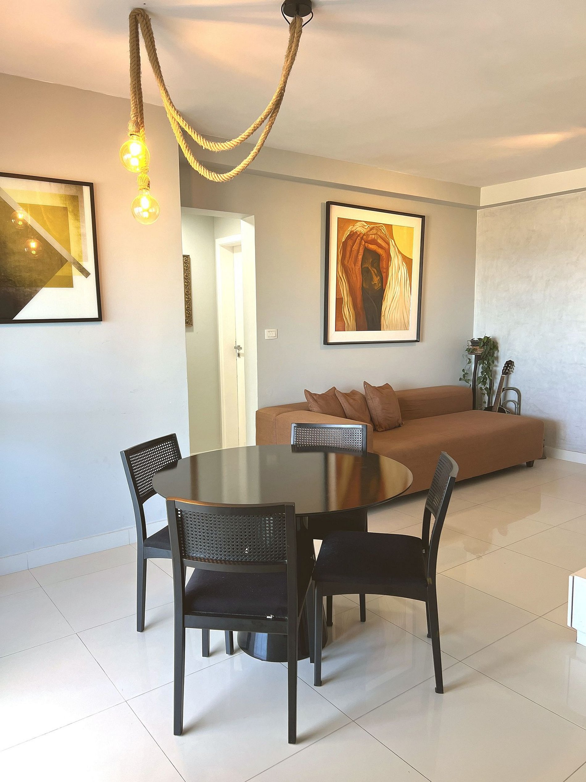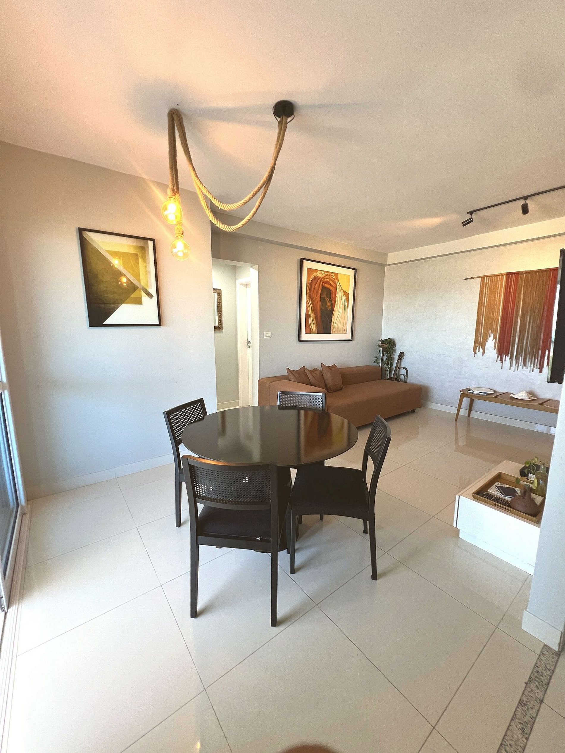 Ambiente amplo e integrado, com sofá confortável, Smart TV e decoração autoral com quadros e tapeçaria artesanal. A mesa redonda para 4 lugares é ideal para refeições em família. Wi-Fi de alta velocidade disponível em todo o apartamento.