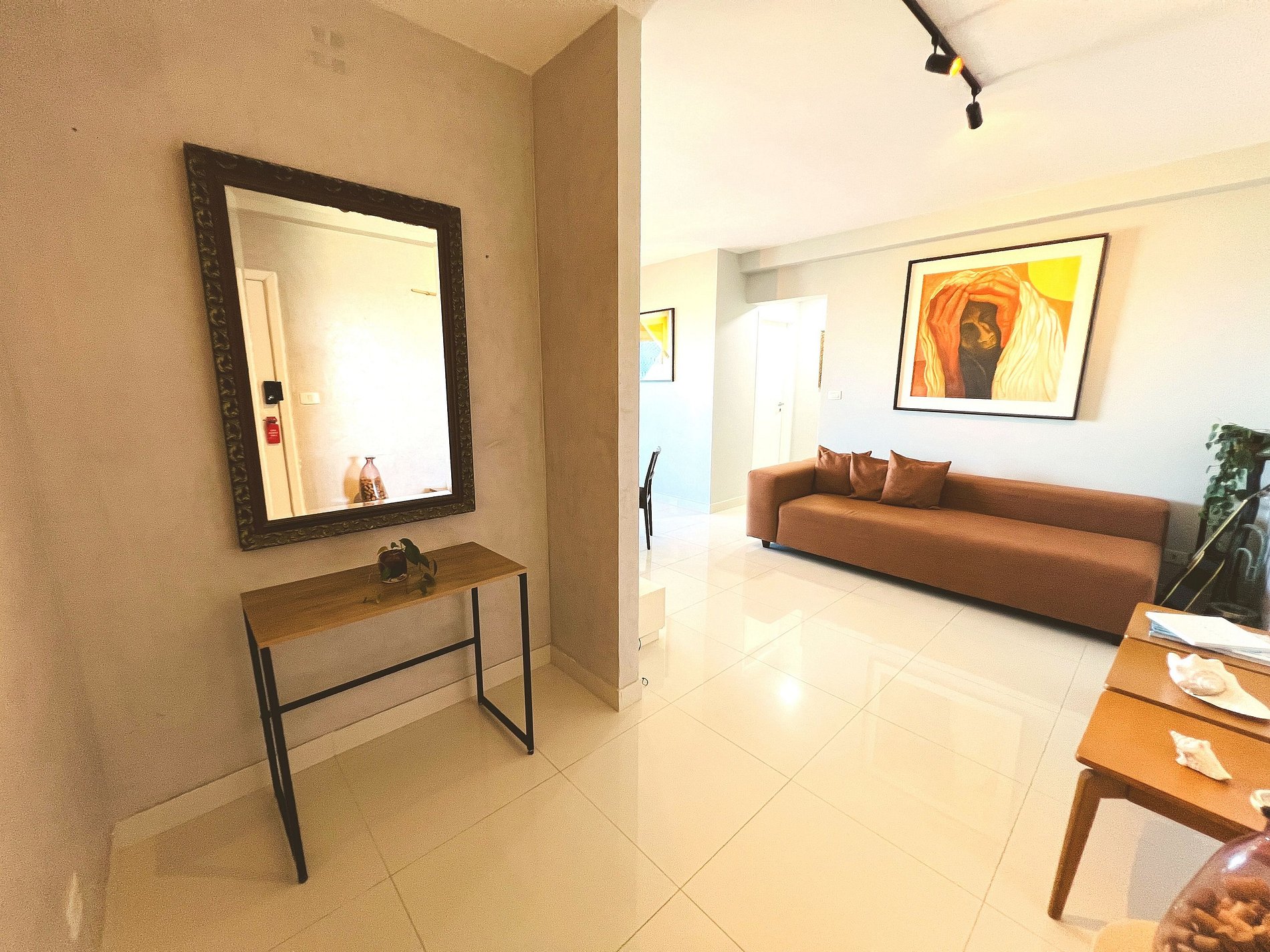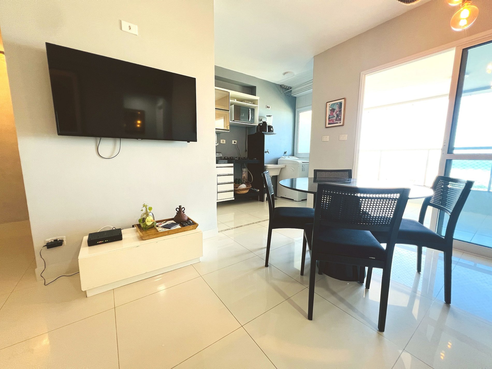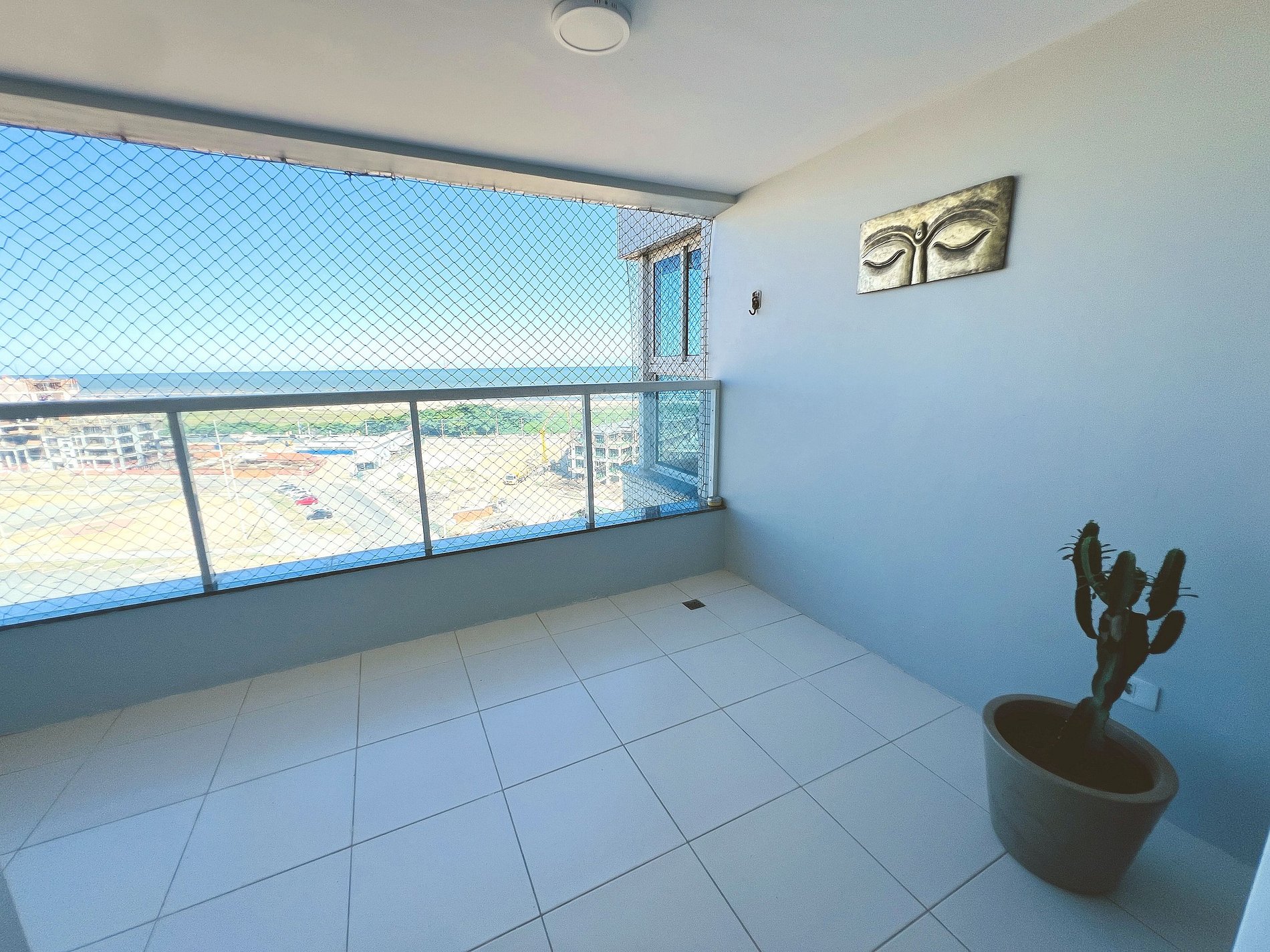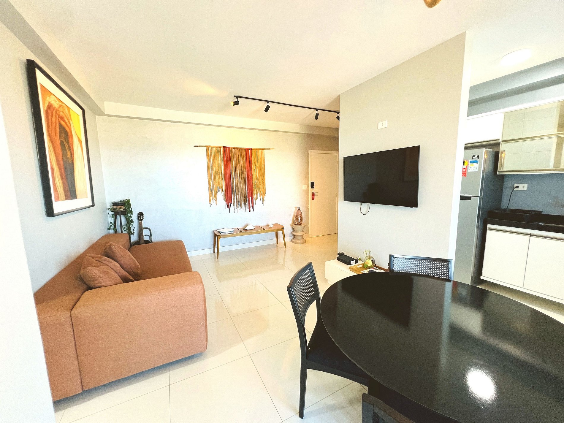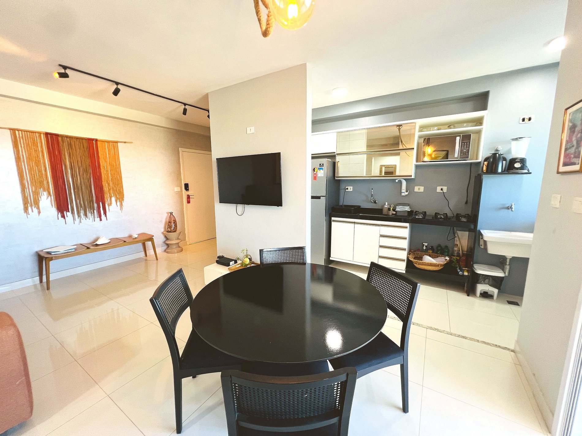 Apartamento decorado com 2 quartos climatizados, varanda com vista livre para o mar, cozinha completa e Wi-Fi de alta velocidade.