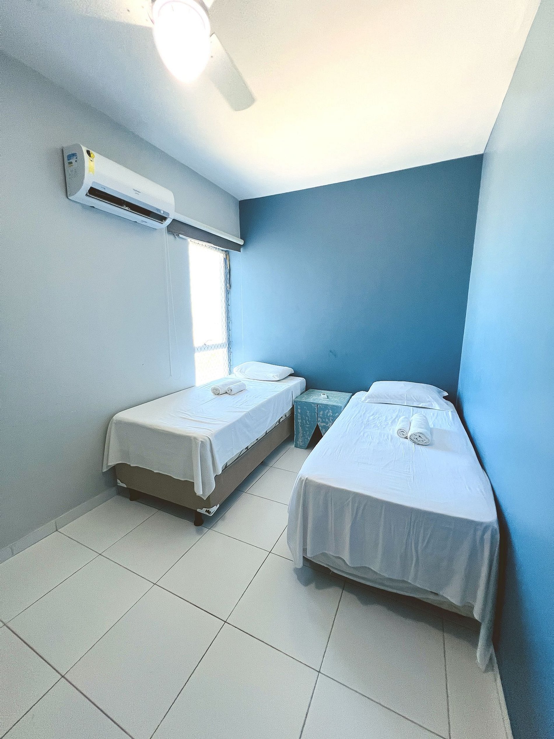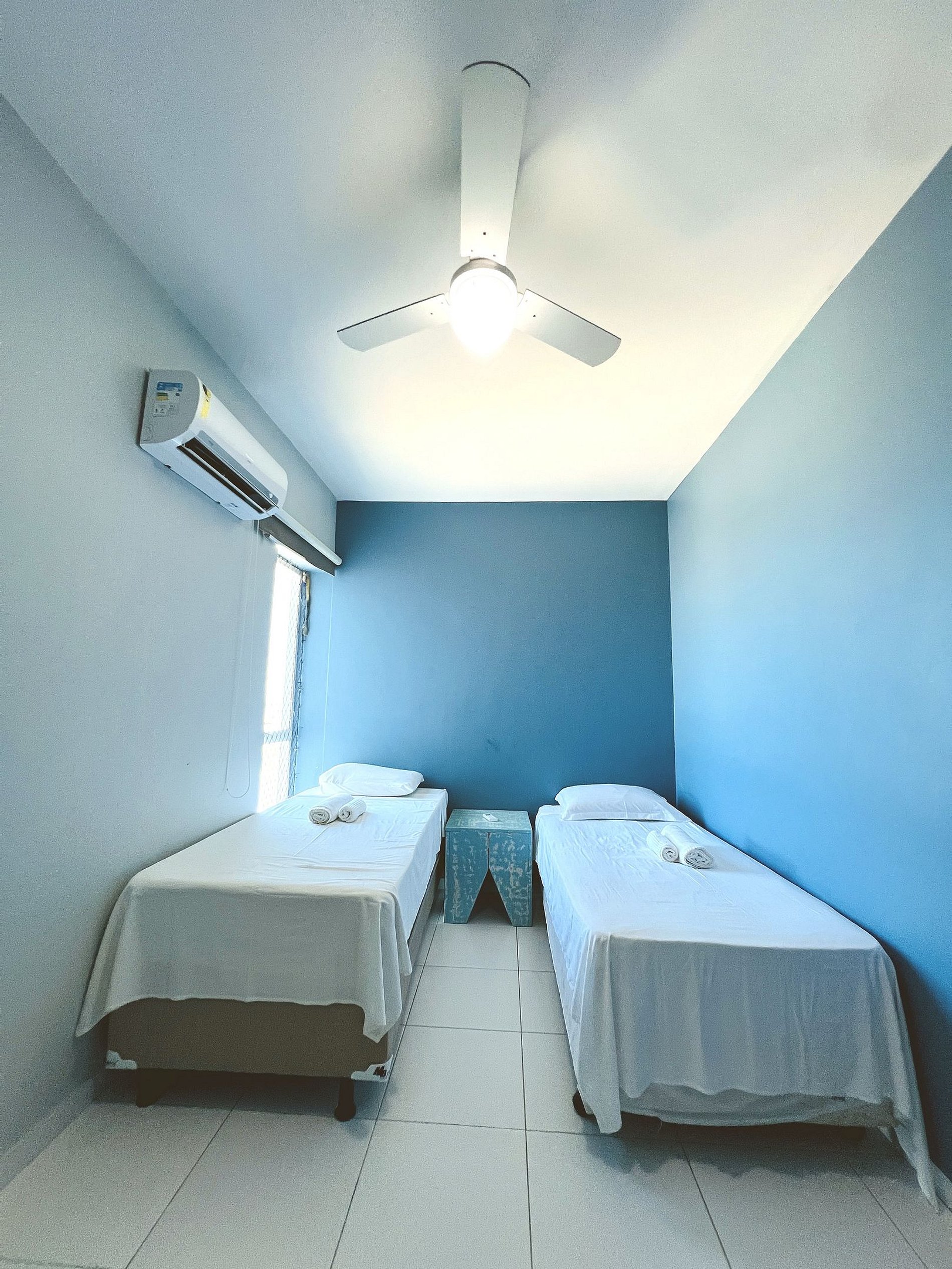 Duas camas de solteiro e um colchão de solteiro adicional, perfeito para crianças ou amigos viajando juntos. Também conta com ar-condicionado split e ventilador de teto. Segundo banheiro completo com bancada em granito e box de vidro.