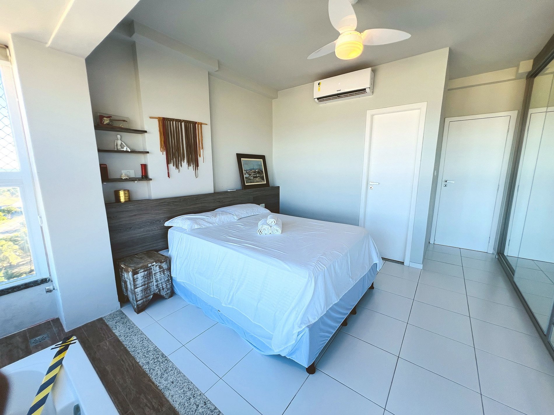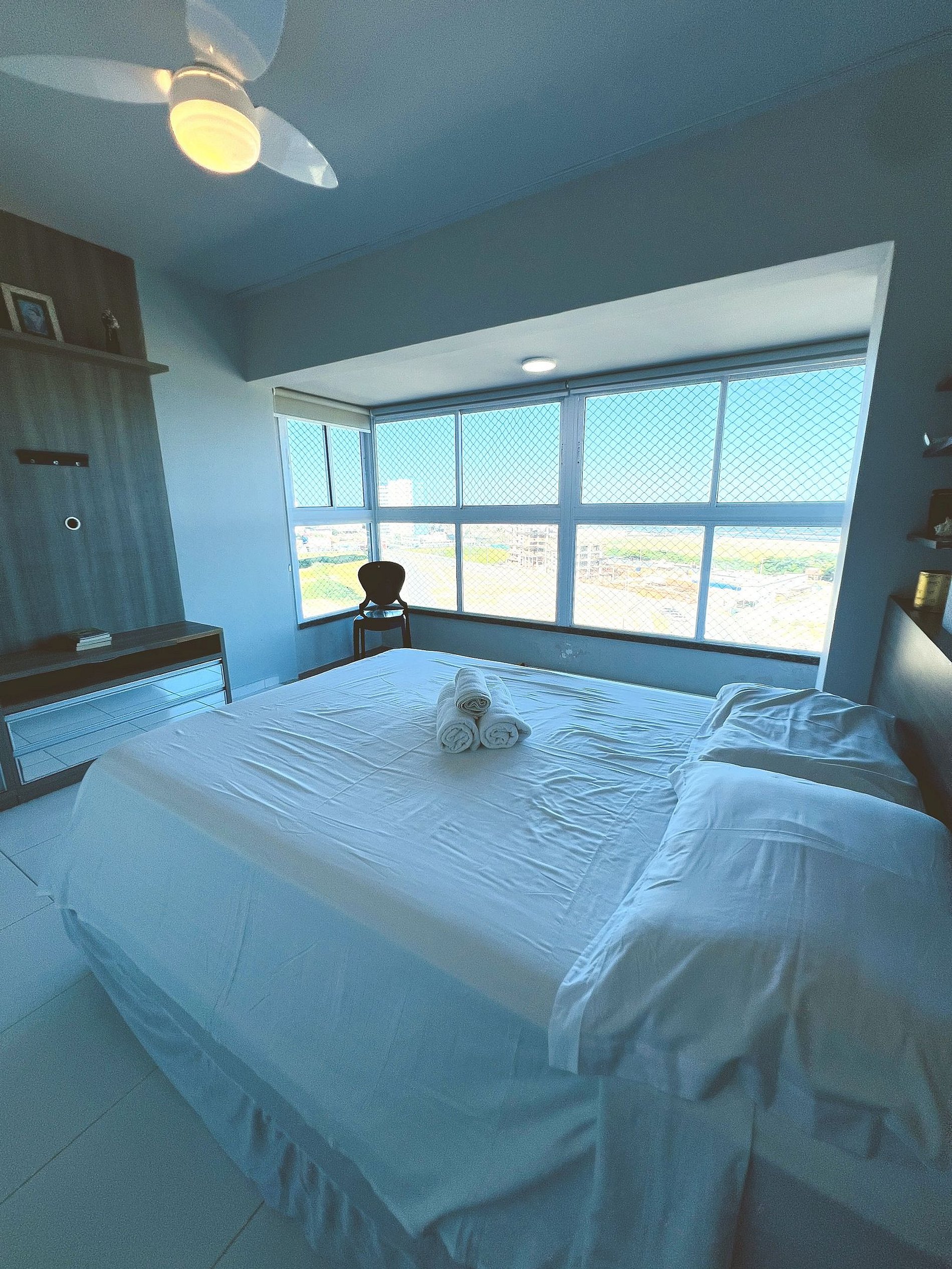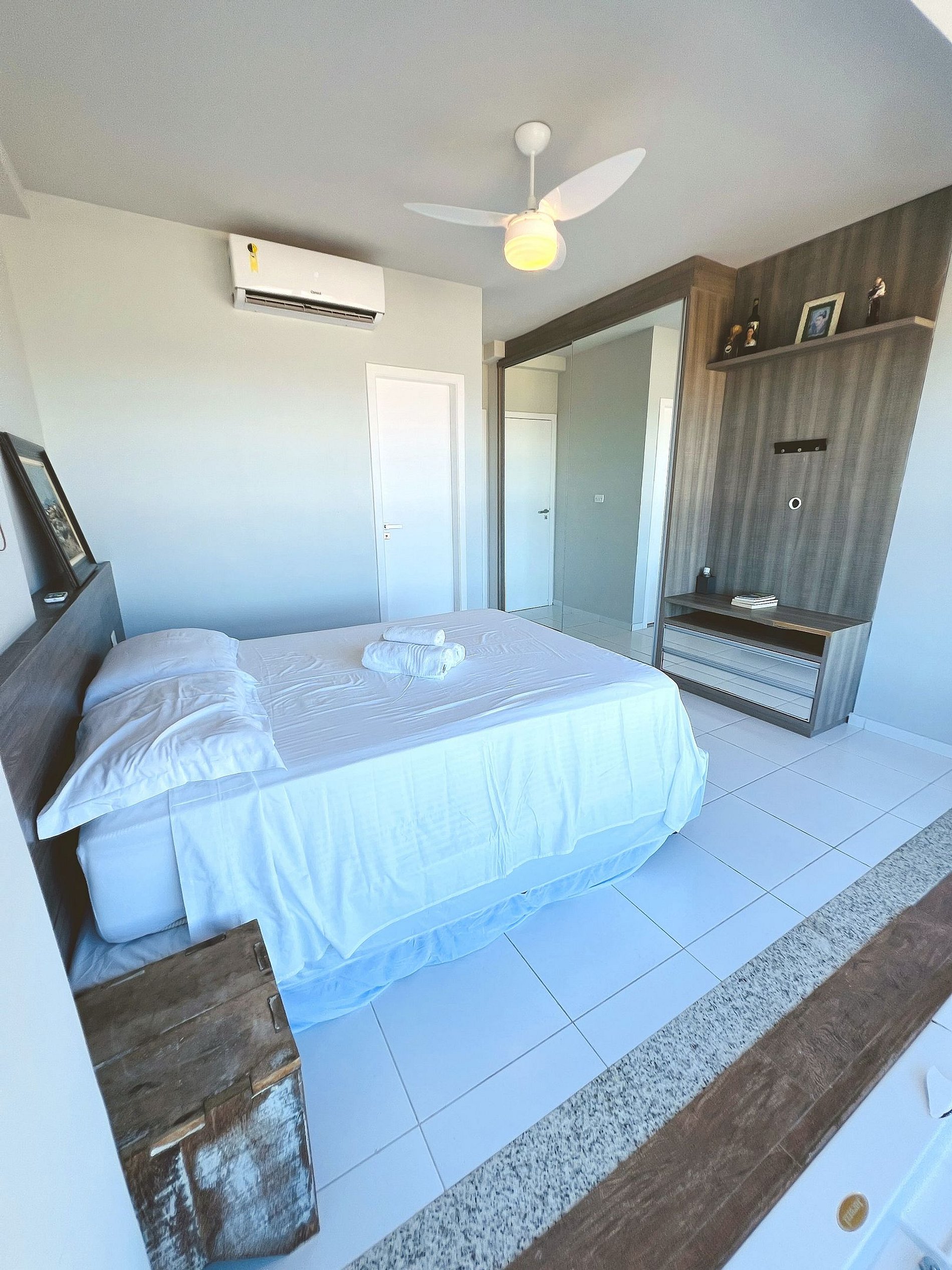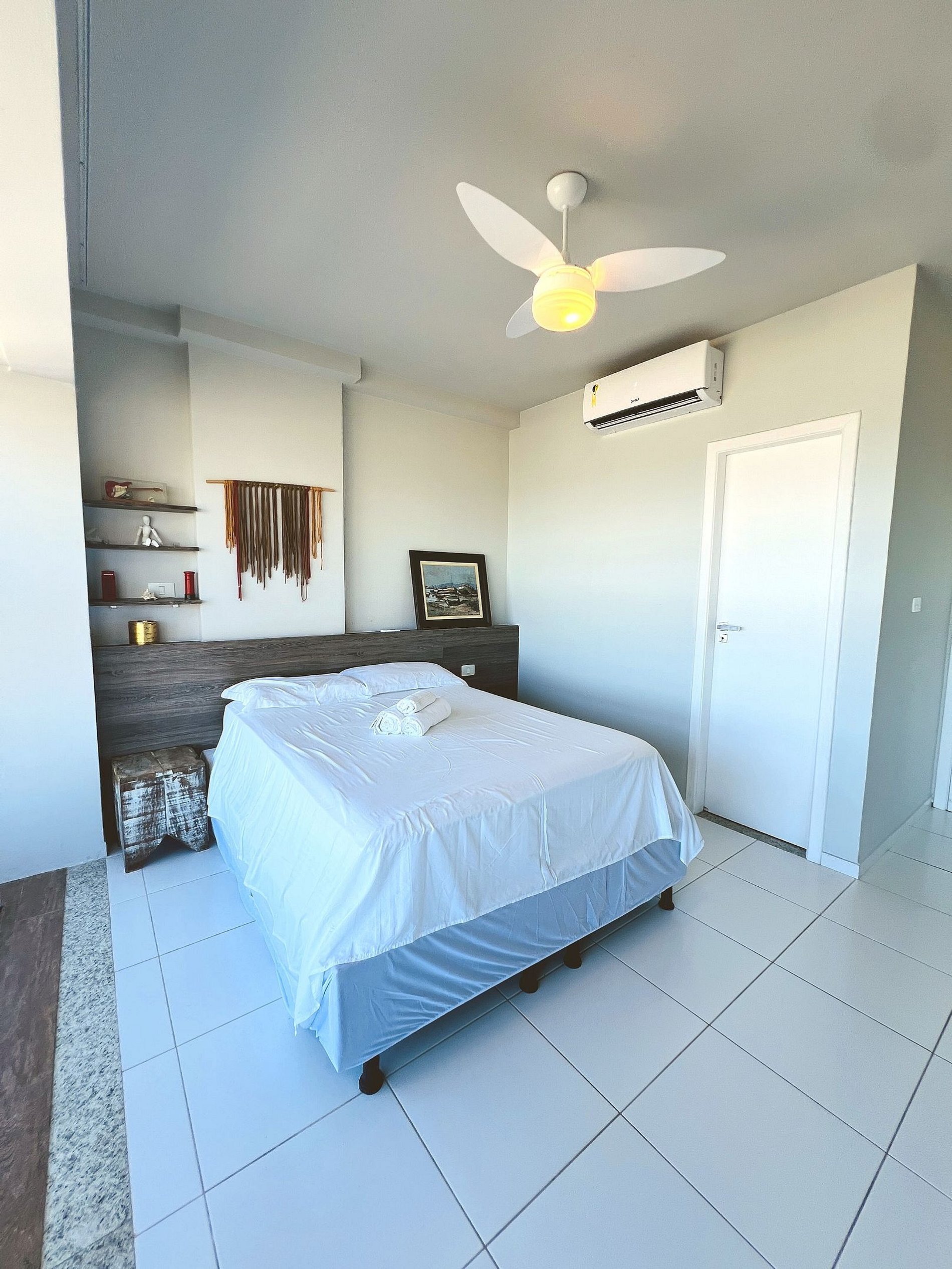 Cama de casal aconchegante, cabeceira em madeira, guarda-roupa com espelho, ar-condicionado split e ventilador de teto. A janela ampla traz luz natural e mais uma perspectiva da vista mar. Banheiro privativo com bancada em granito e box de vidro.
