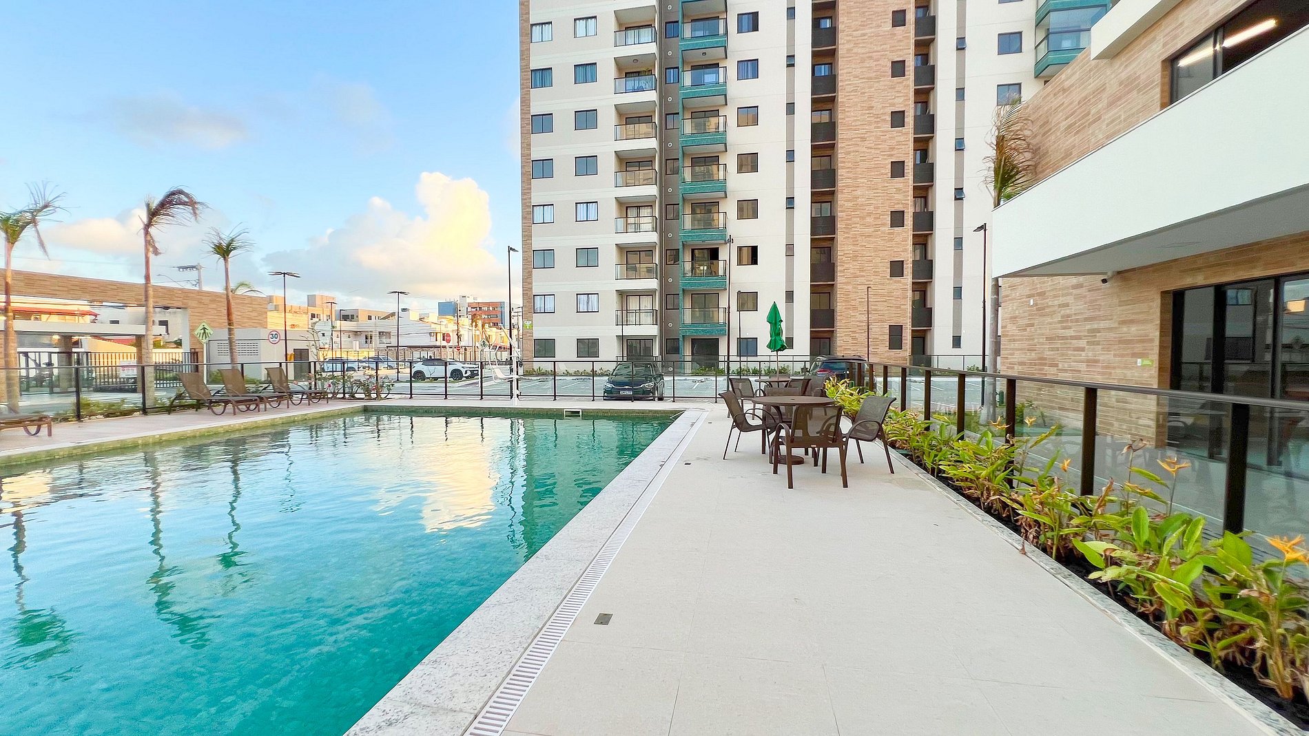 ● Piscina adulto com deck, espreguiçadeiras e coqueiros — perfeita para os dias de sol.
