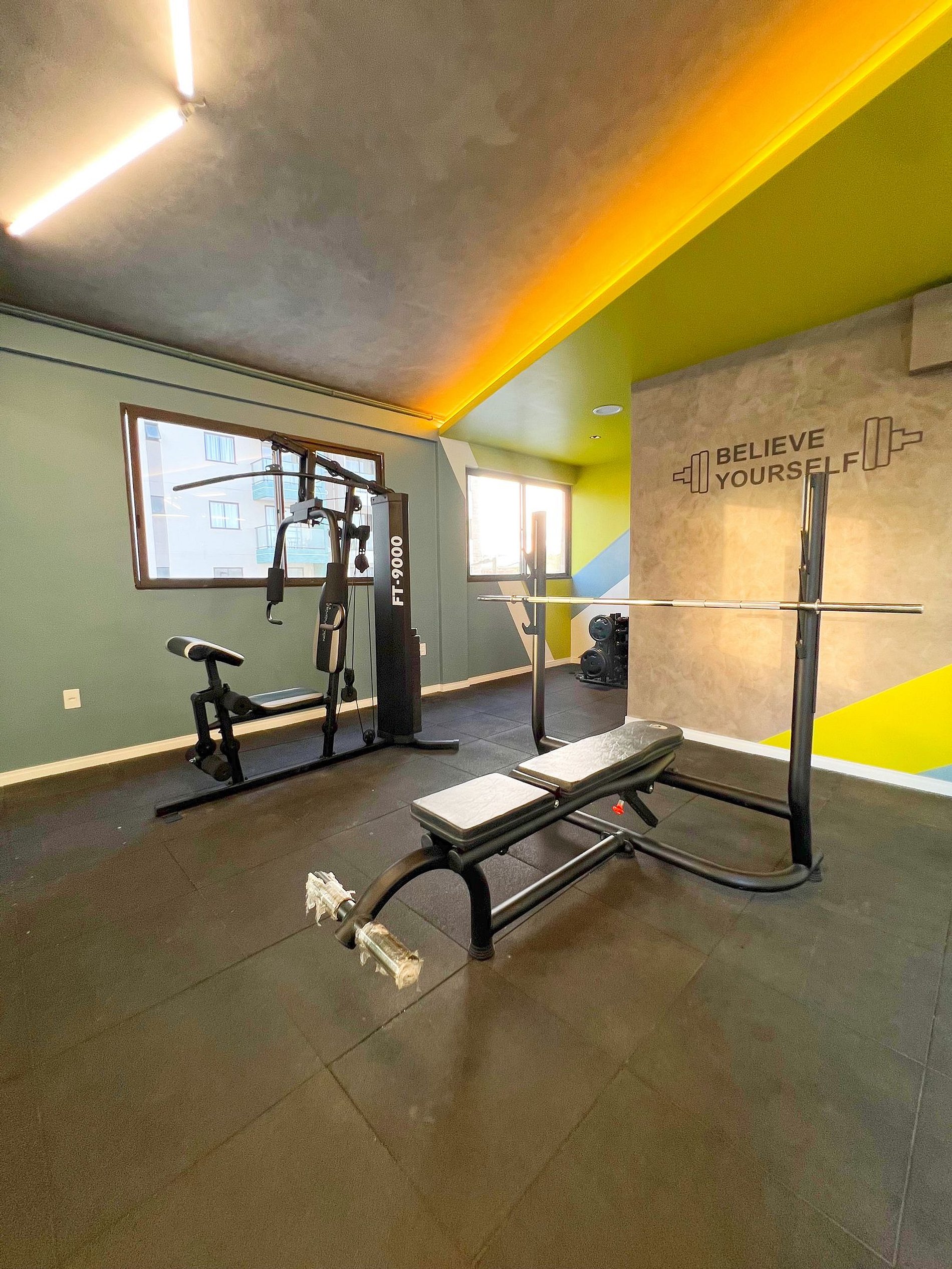 ● Academia moderna e completa: esteiras, bicicletas ergométricas, estação de musculação e banco de supino.