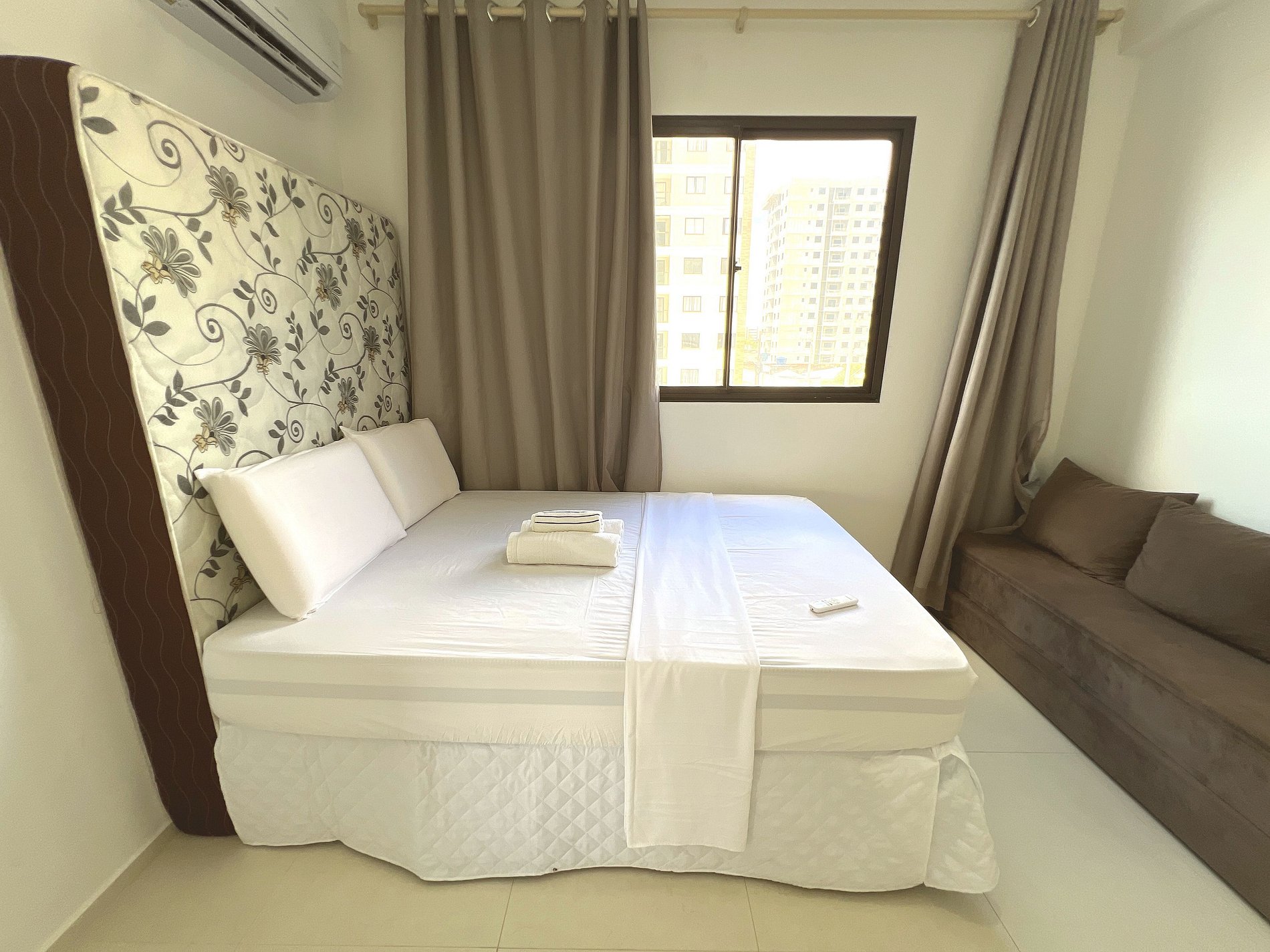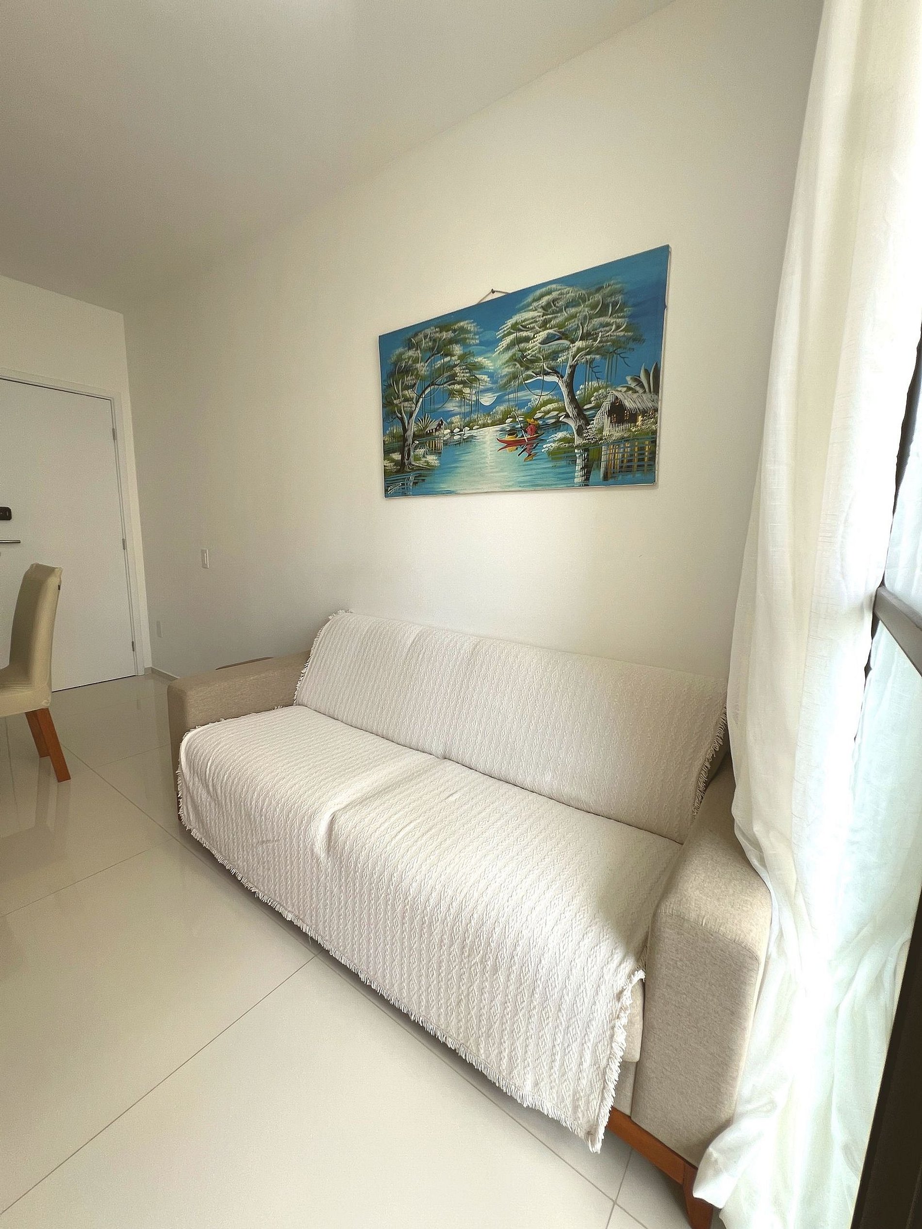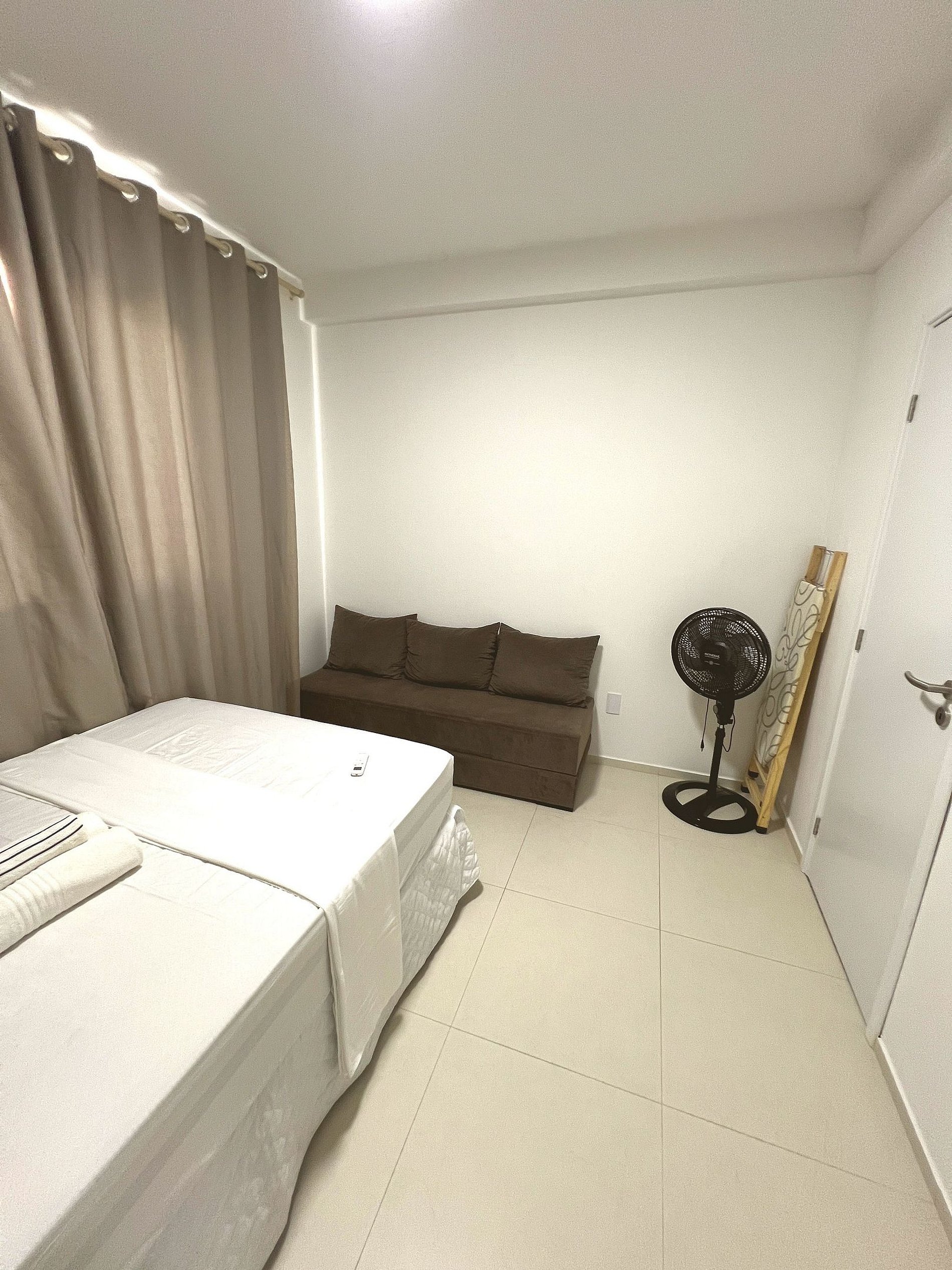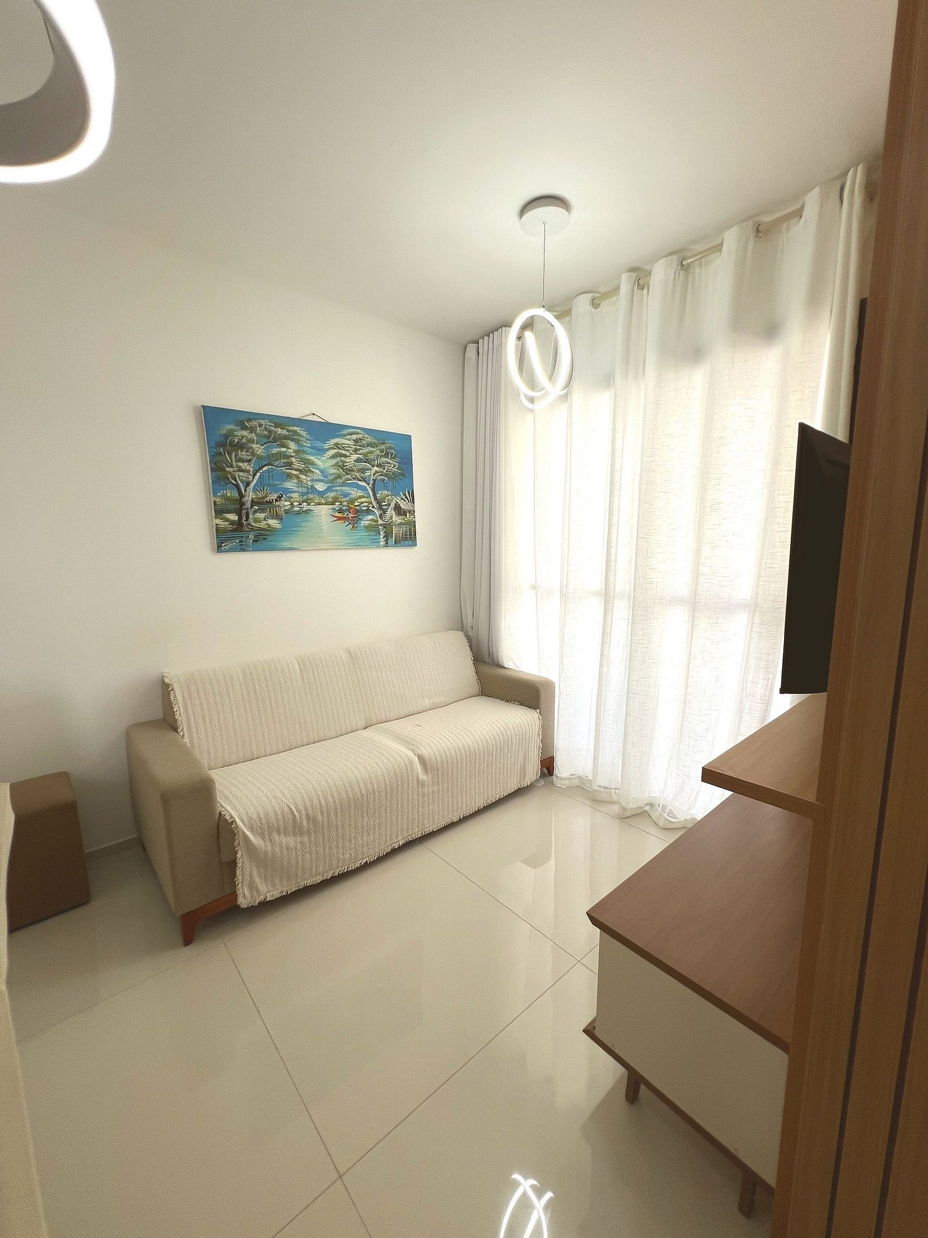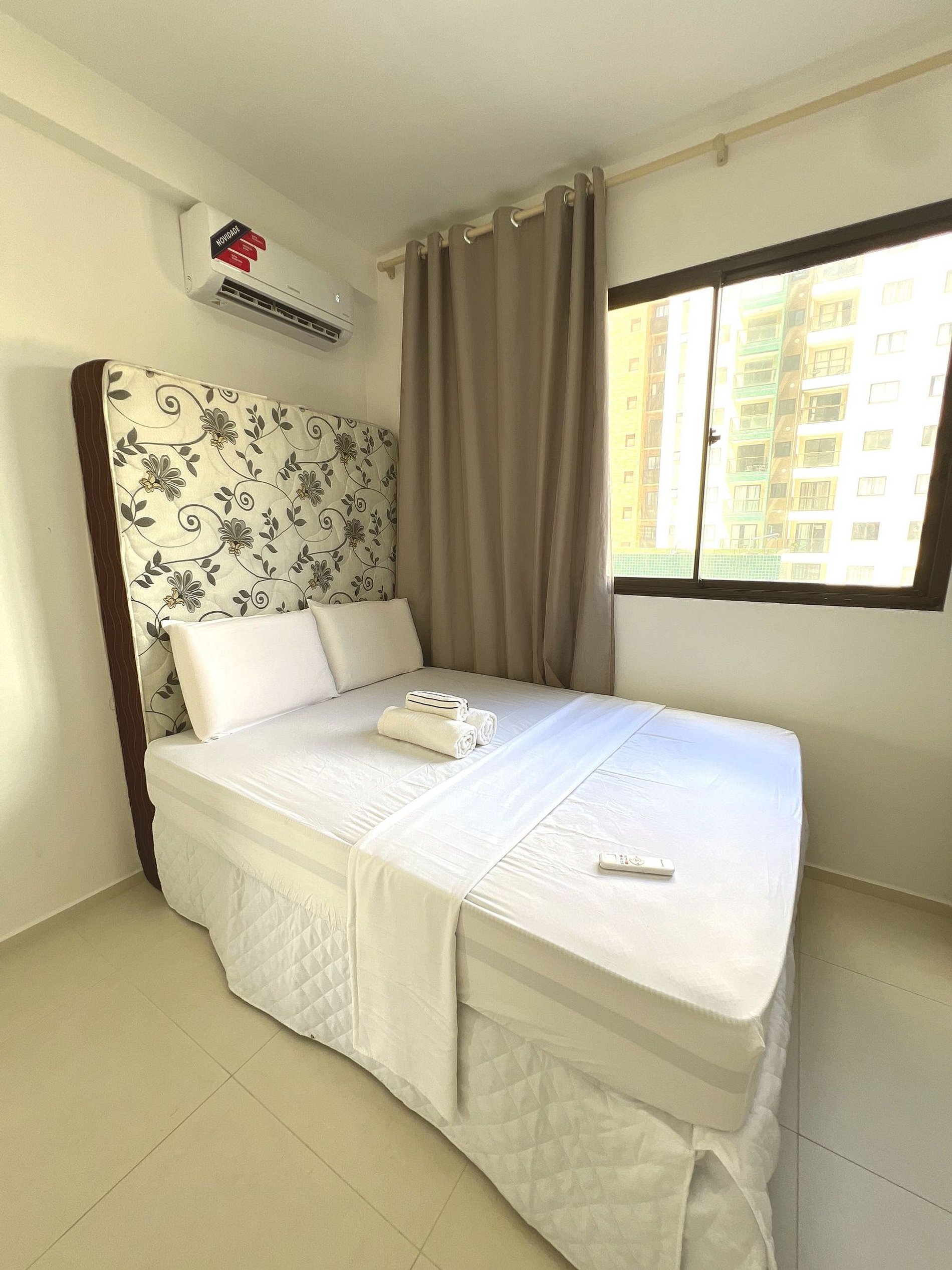 Apartamento novo e moderno no Condomínio Marbello, com 1 quarto climatizado, Smart TV, Wi-Fi rápido e cozinha completa.