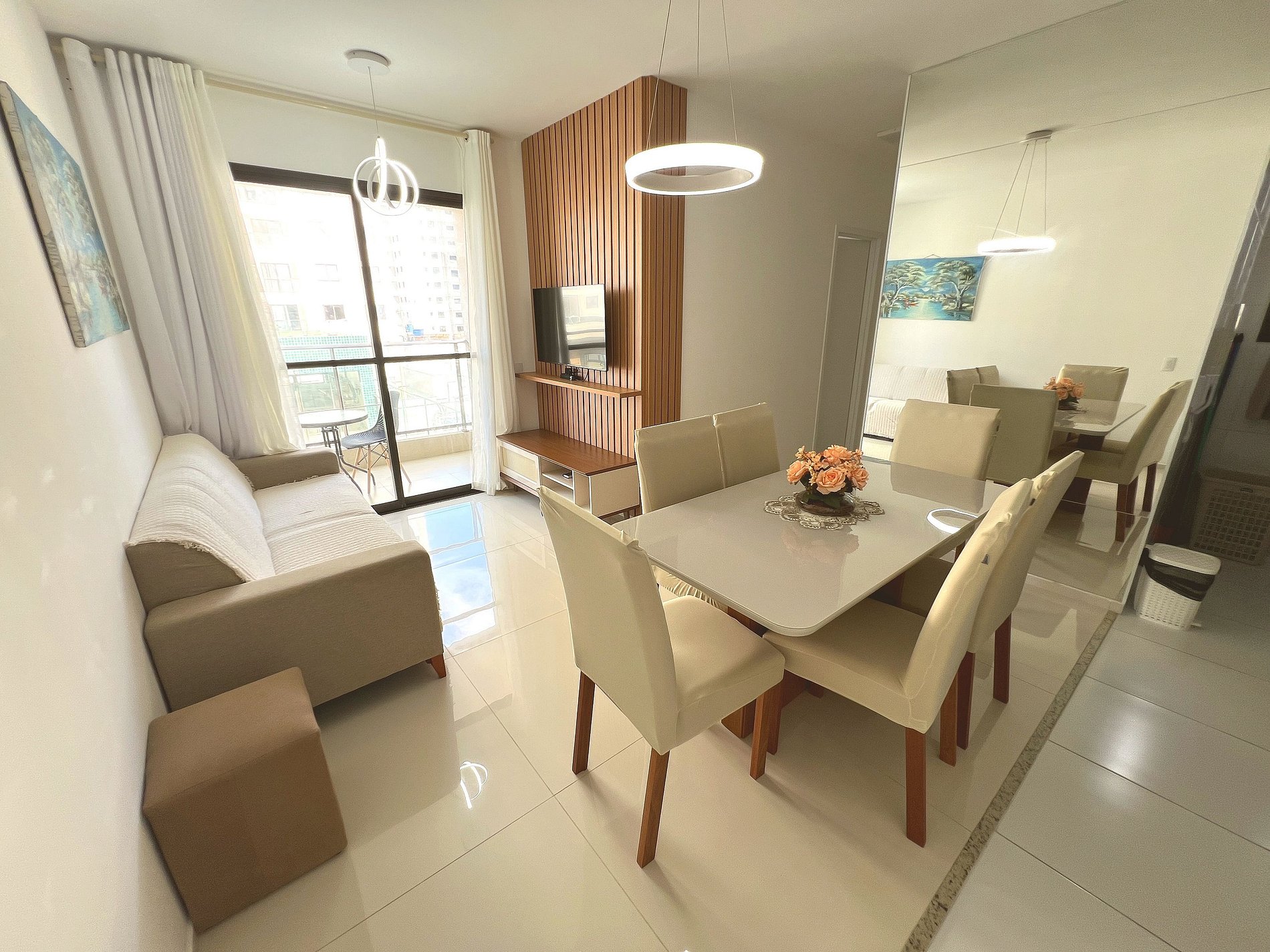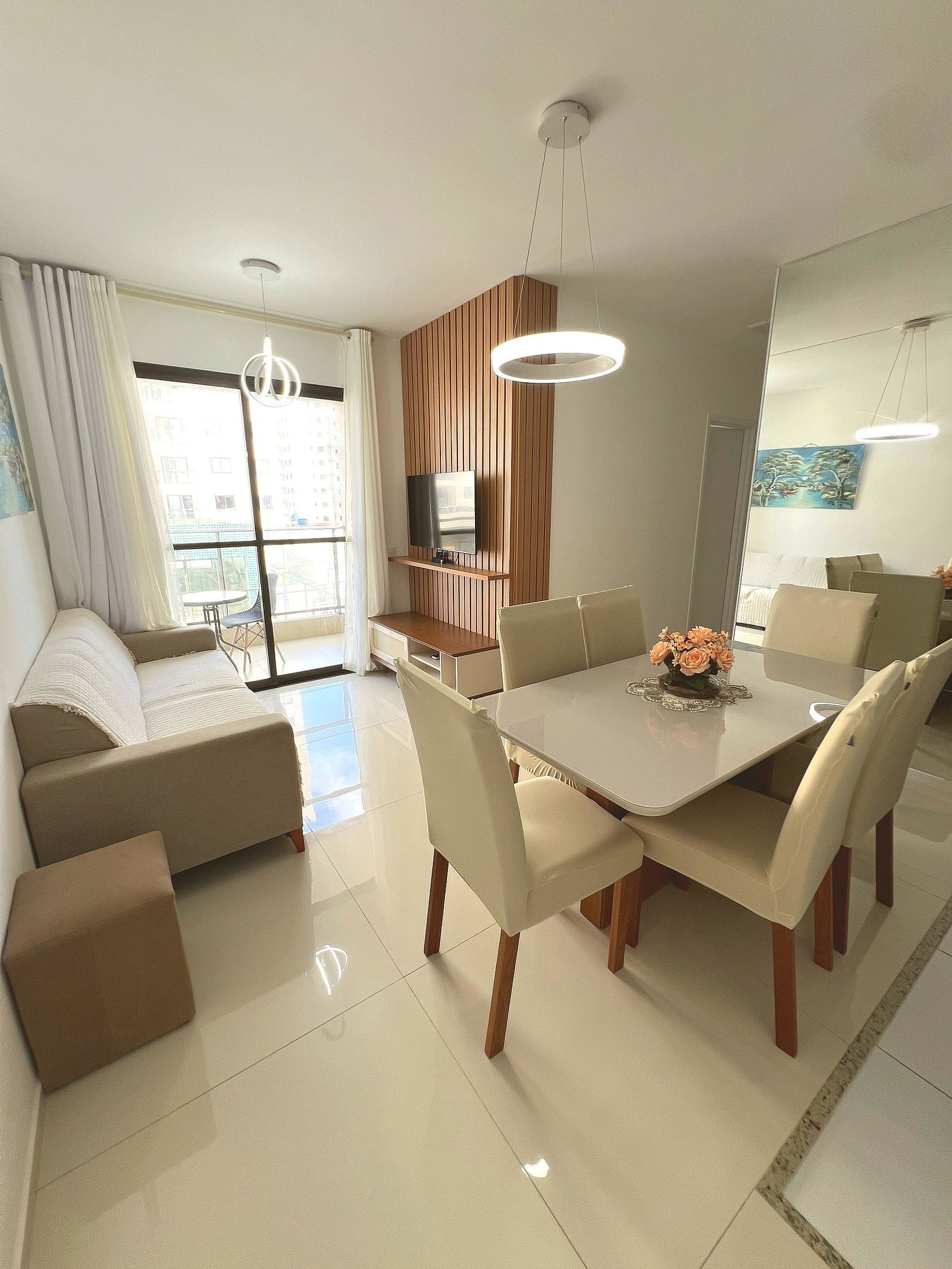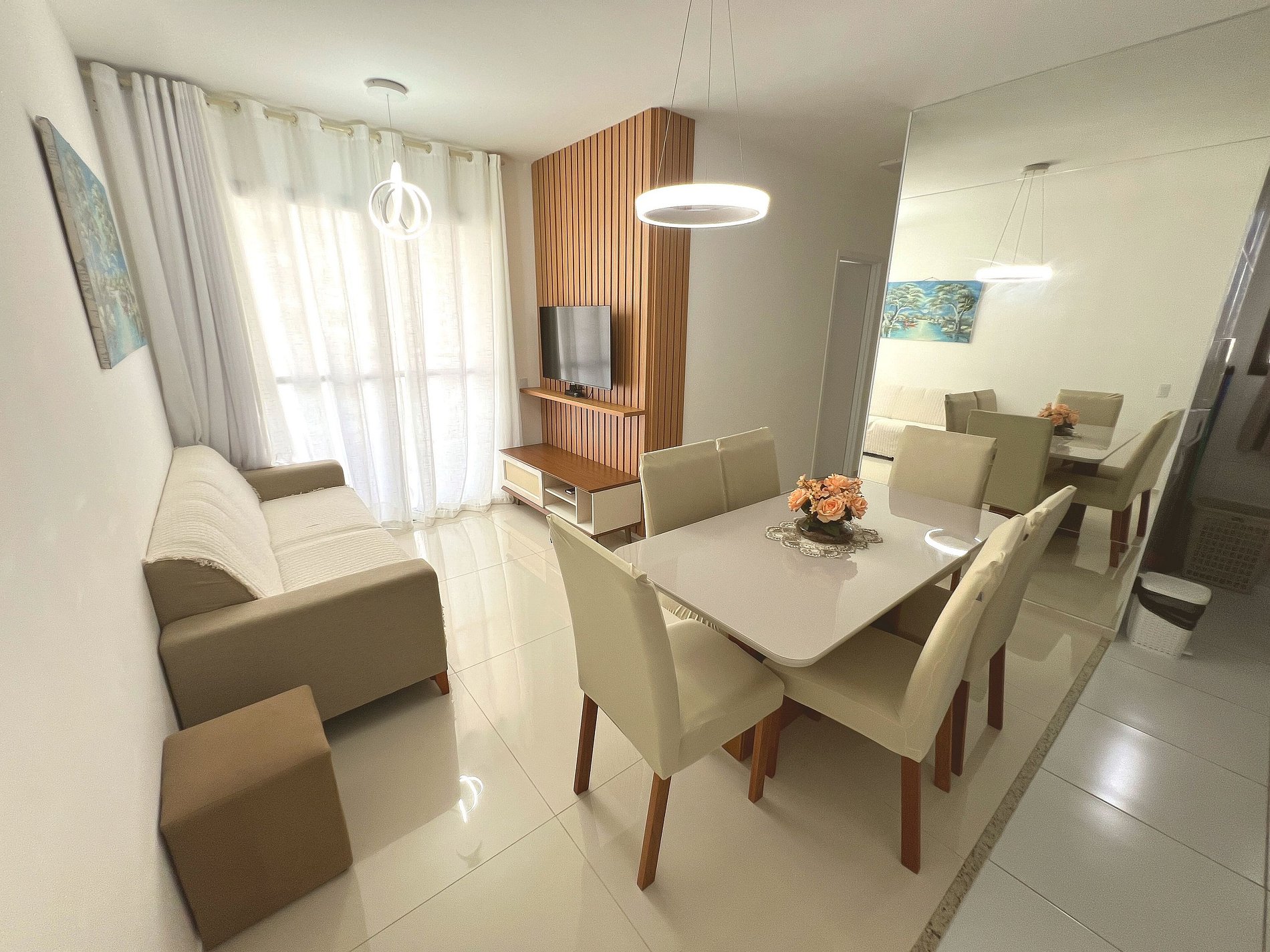Ambiente integrado, clean e muito bem iluminado. A sala oferece: