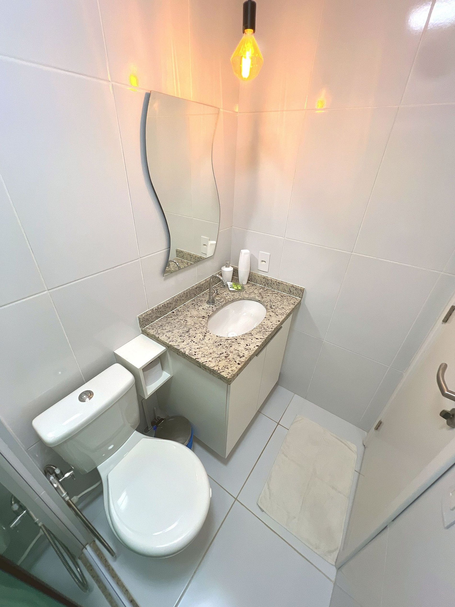 Moderno e bem acabado, com box de vidro, bancada em granito, espelho e iluminação elegante. Tudo pensado para o seu conforto.