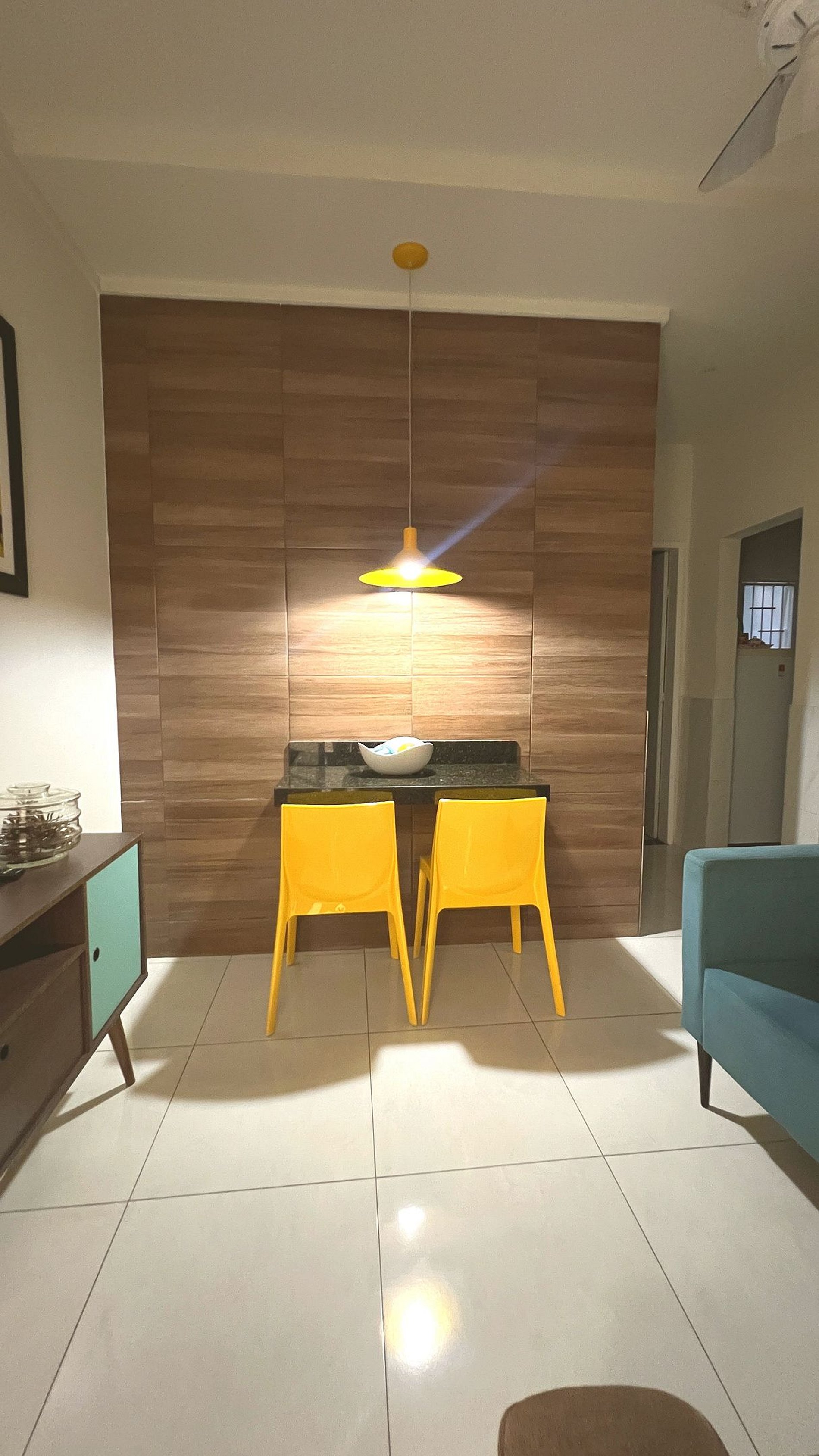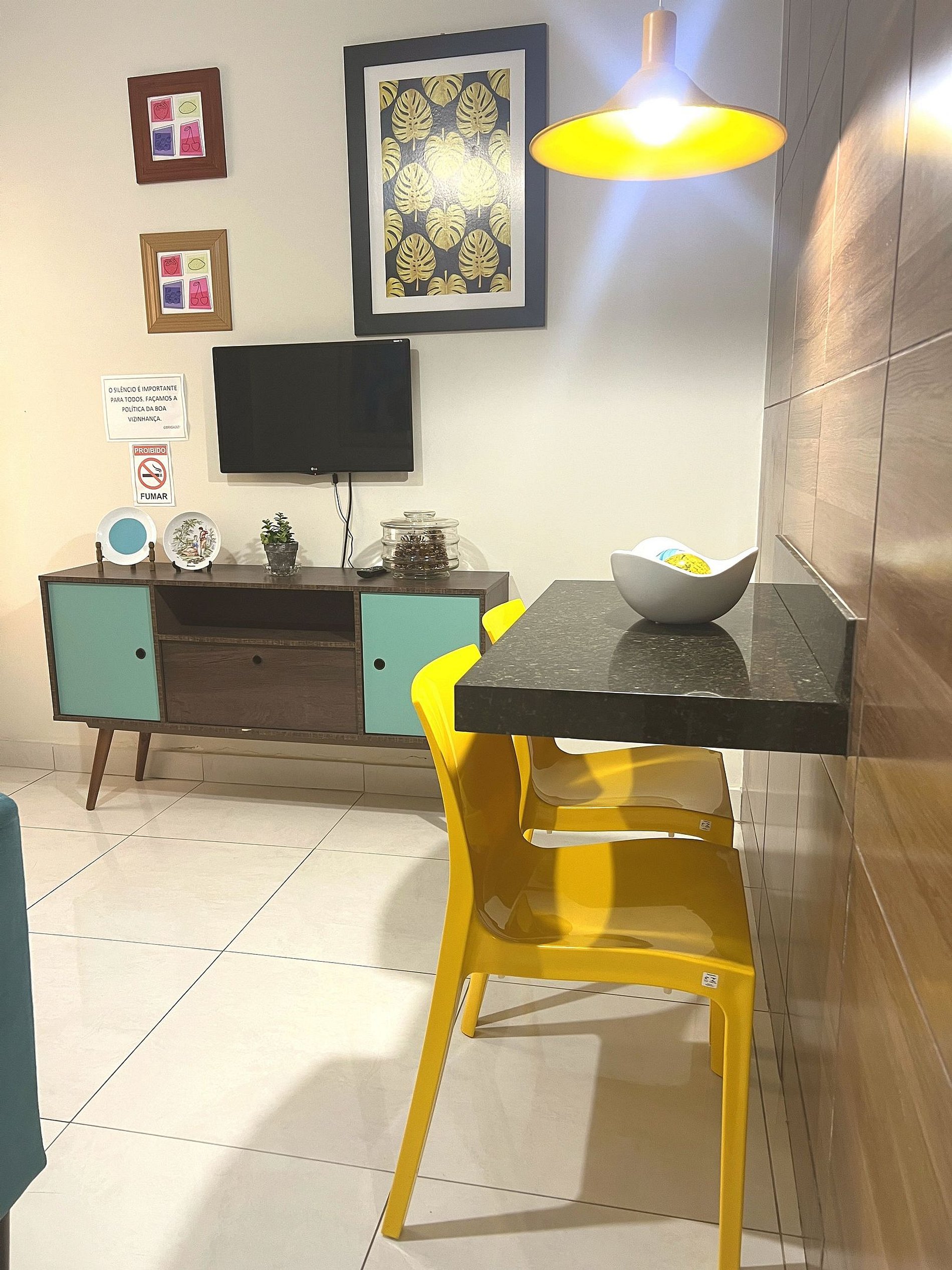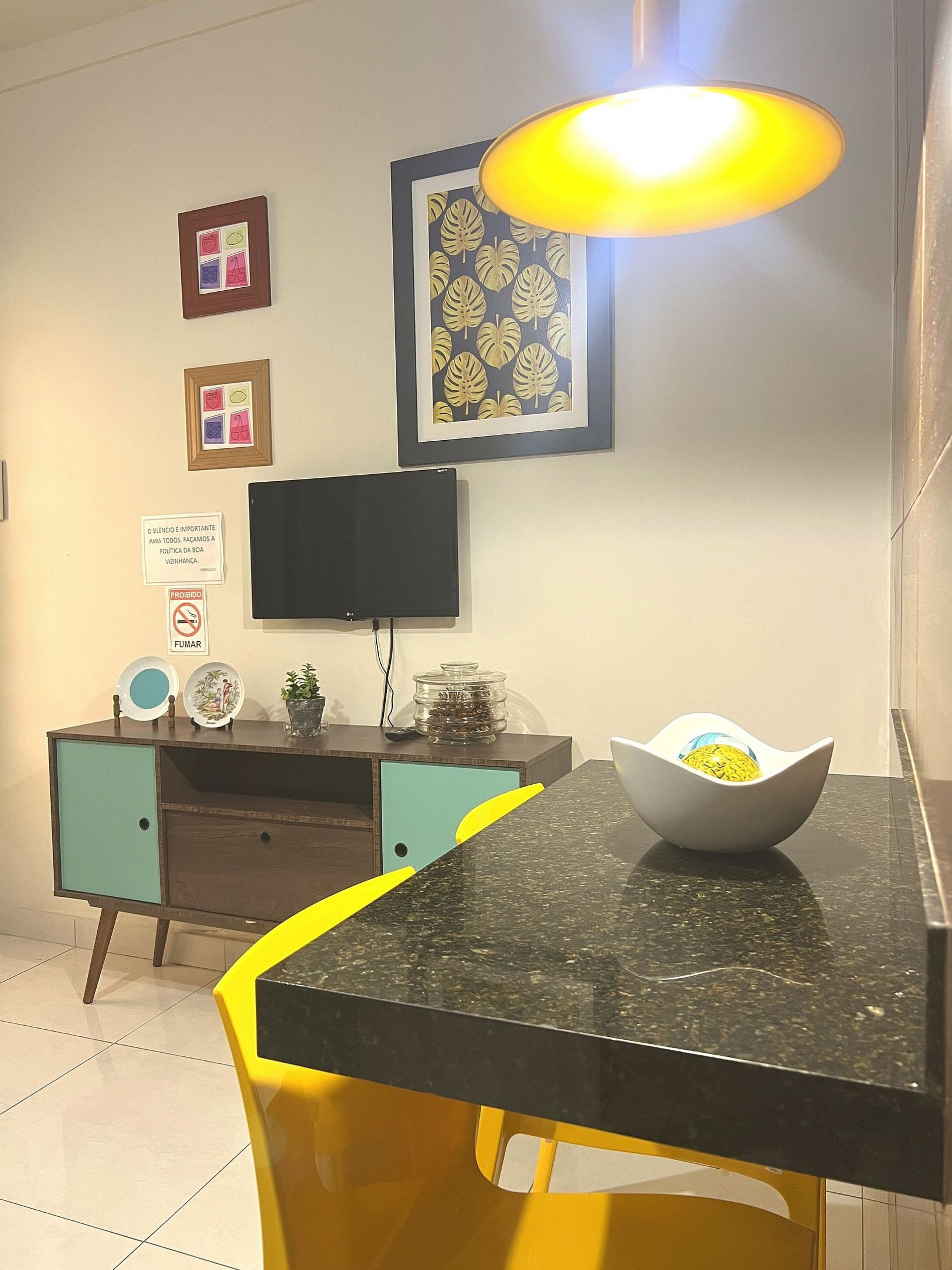 Um ambiente integrado e cheio de personalidade! O sofá confortável e a poltrona convidam ao descanso após um dia de praia, enquanto a Smart TV garante o entretenimento à noite. A mesa de jantar com bancada em granito e cadeiras amarelas dá um charme especial às refeições. Na parede, o revestimento amadeirado e a luminária pendente criam um clima acolhedor e moderno. Wi-Fi de alta velocidade disponível para quem precisa se conectar.