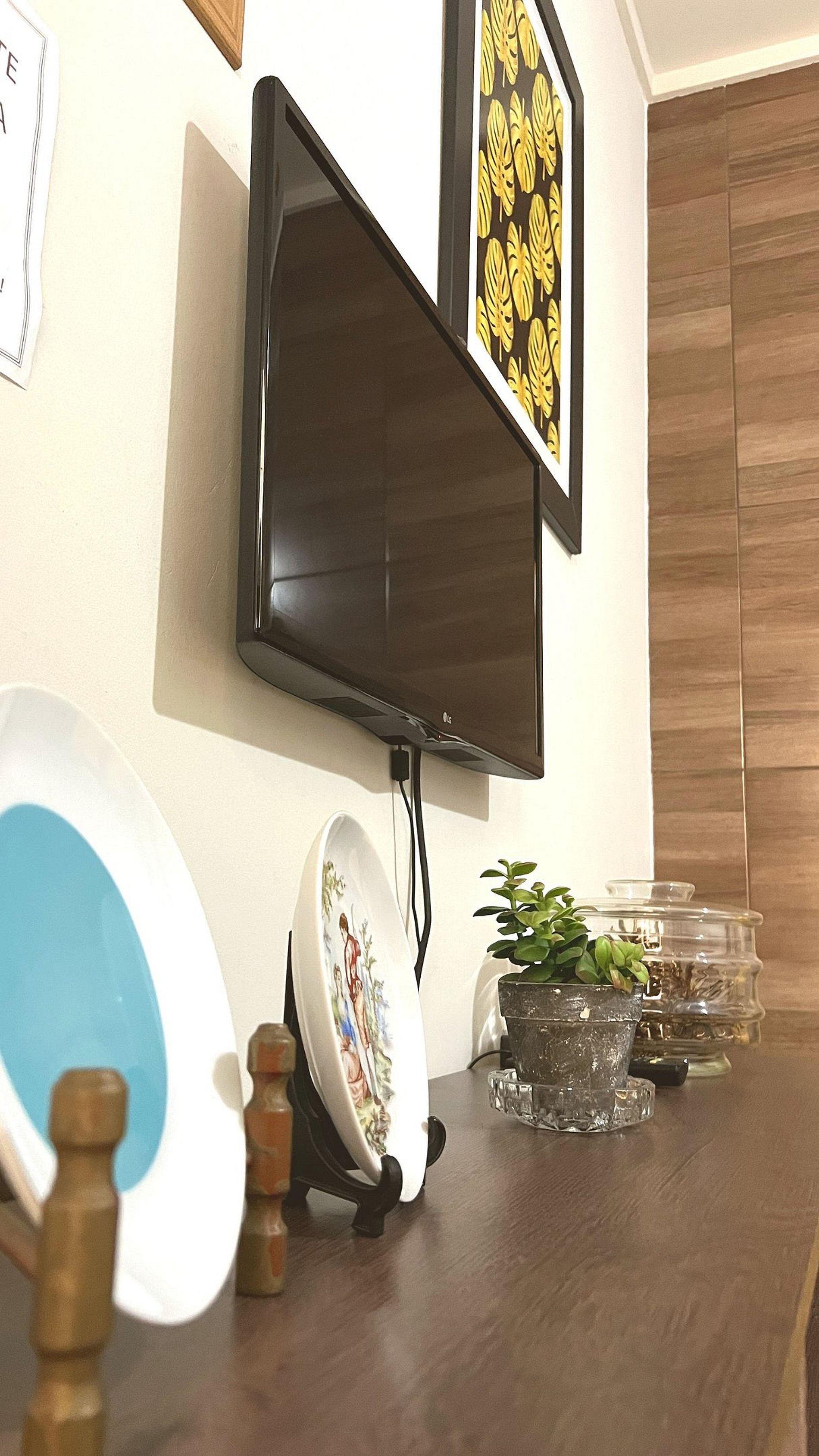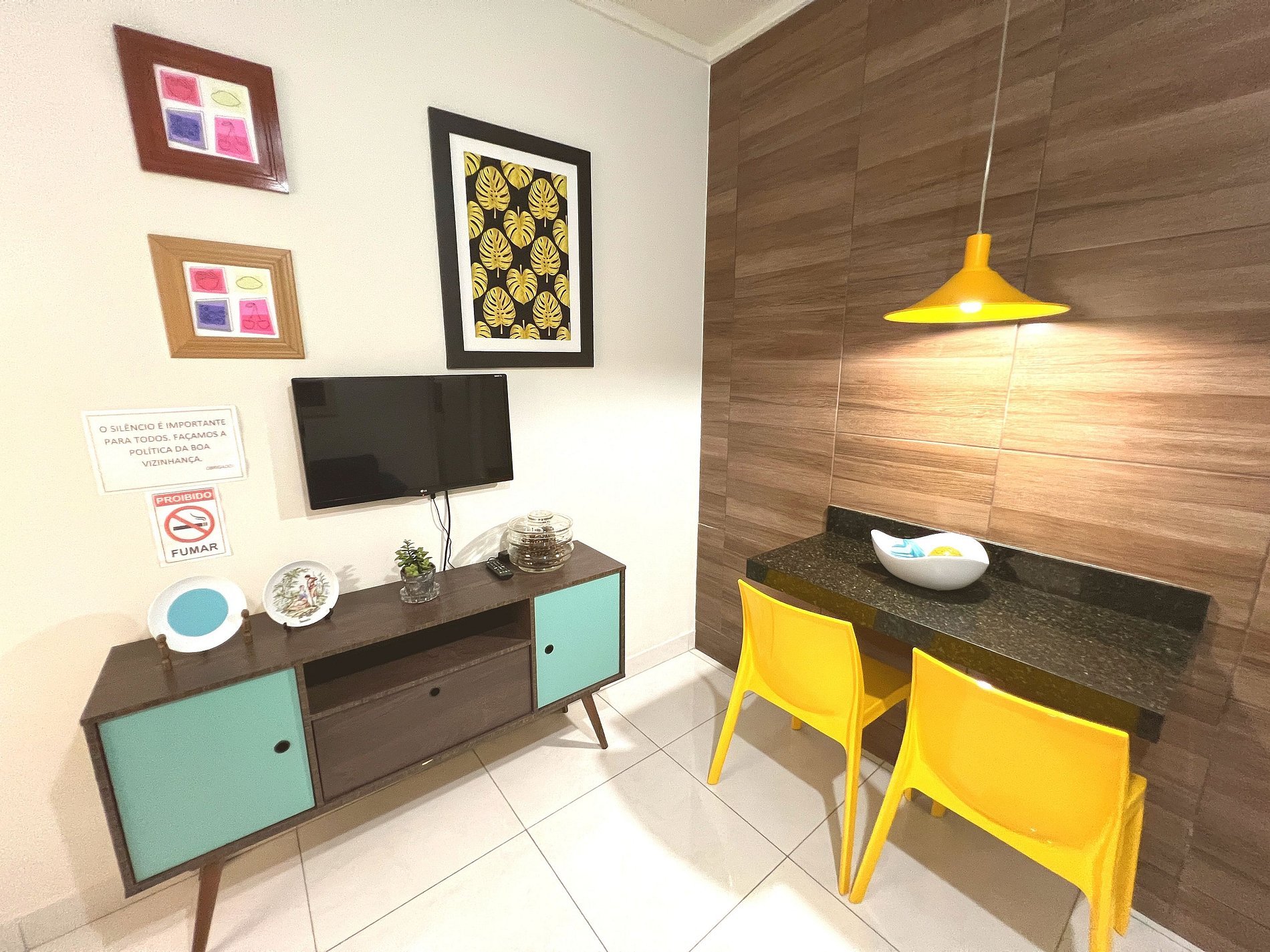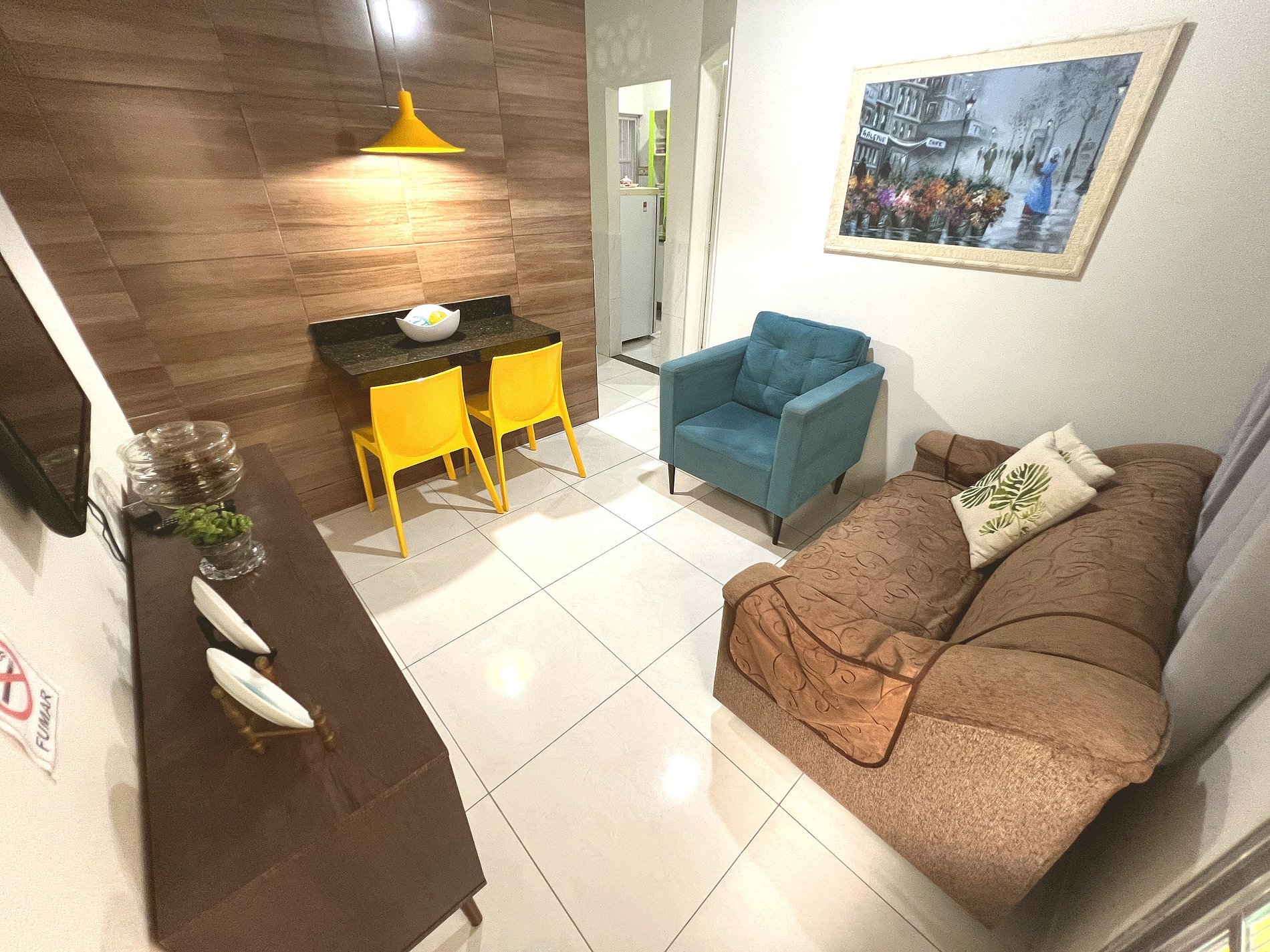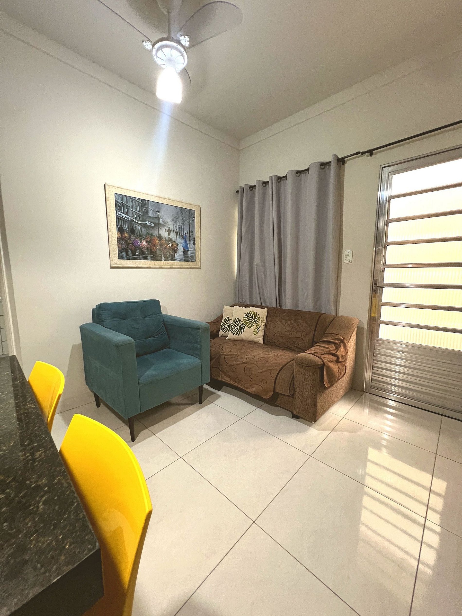 Um ambiente integrado e cheio de personalidade! O sofá confortável e a poltrona convidam ao descanso após um dia de praia, enquanto a Smart TV garante o entretenimento à noite. A mesa de jantar com bancada em granito e cadeiras amarelas dá um charme especial às refeições. Na parede, o revestimento amadeirado e a luminária pendente criam um clima acolhedor e moderno. Wi-Fi de alta velocidade disponível para quem precisa se conectar.