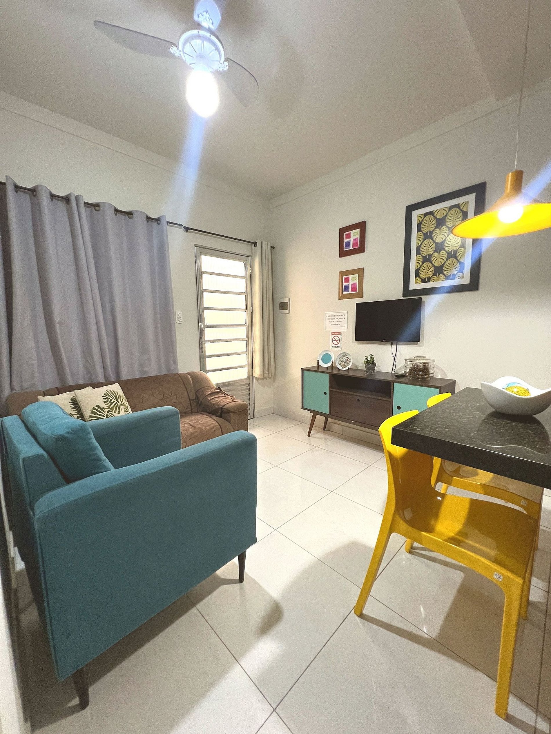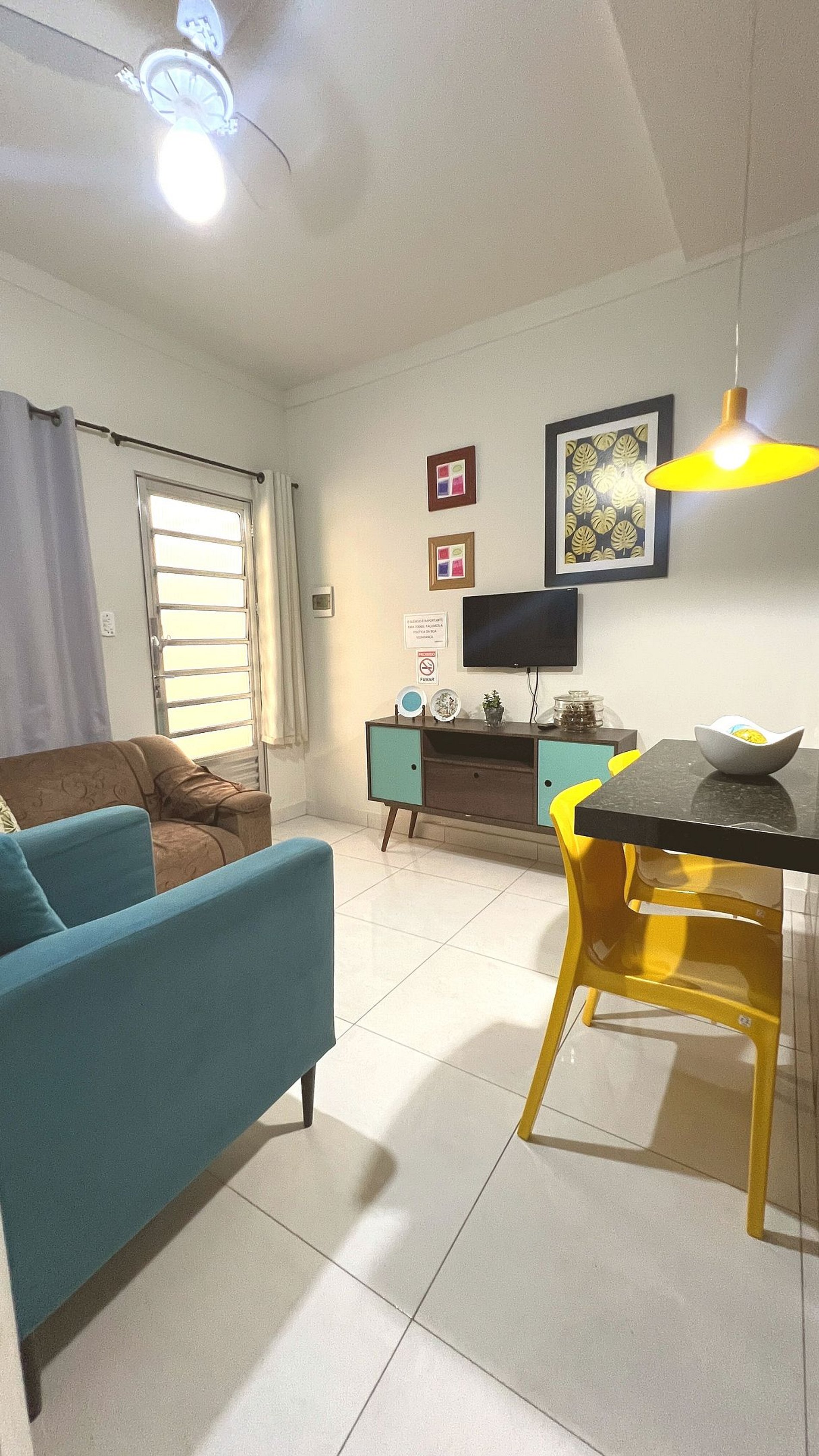 Apartamento térreo, colorido e aconchegante para até 6 pessoas, com 2 quartos climatizados, Wi-Fi e Smart TV.