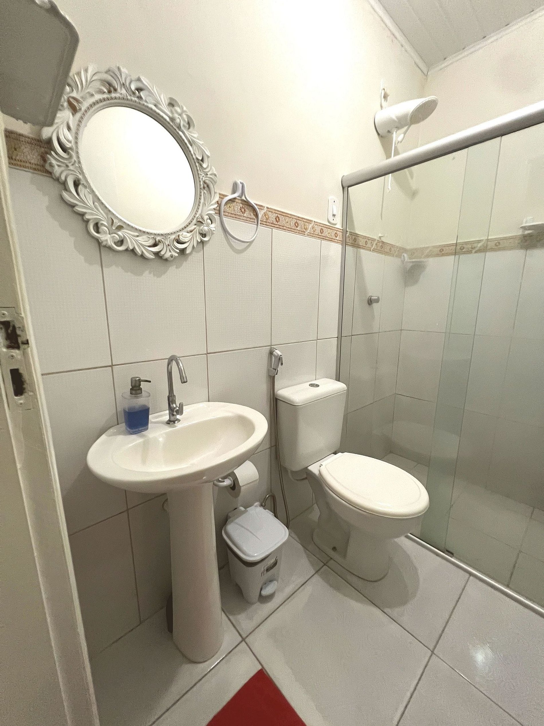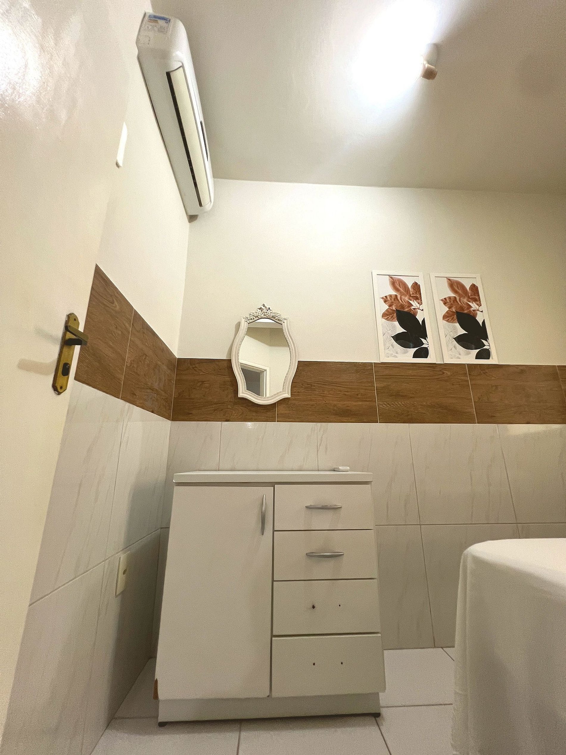 ● Box com divisória de vidro, pia com espelho provençal e acabamento limpo.