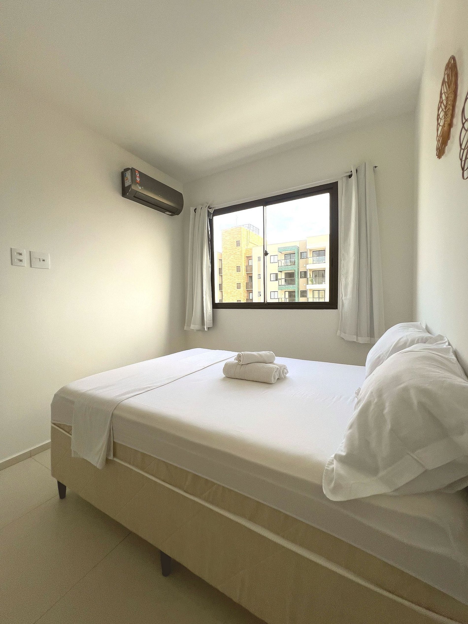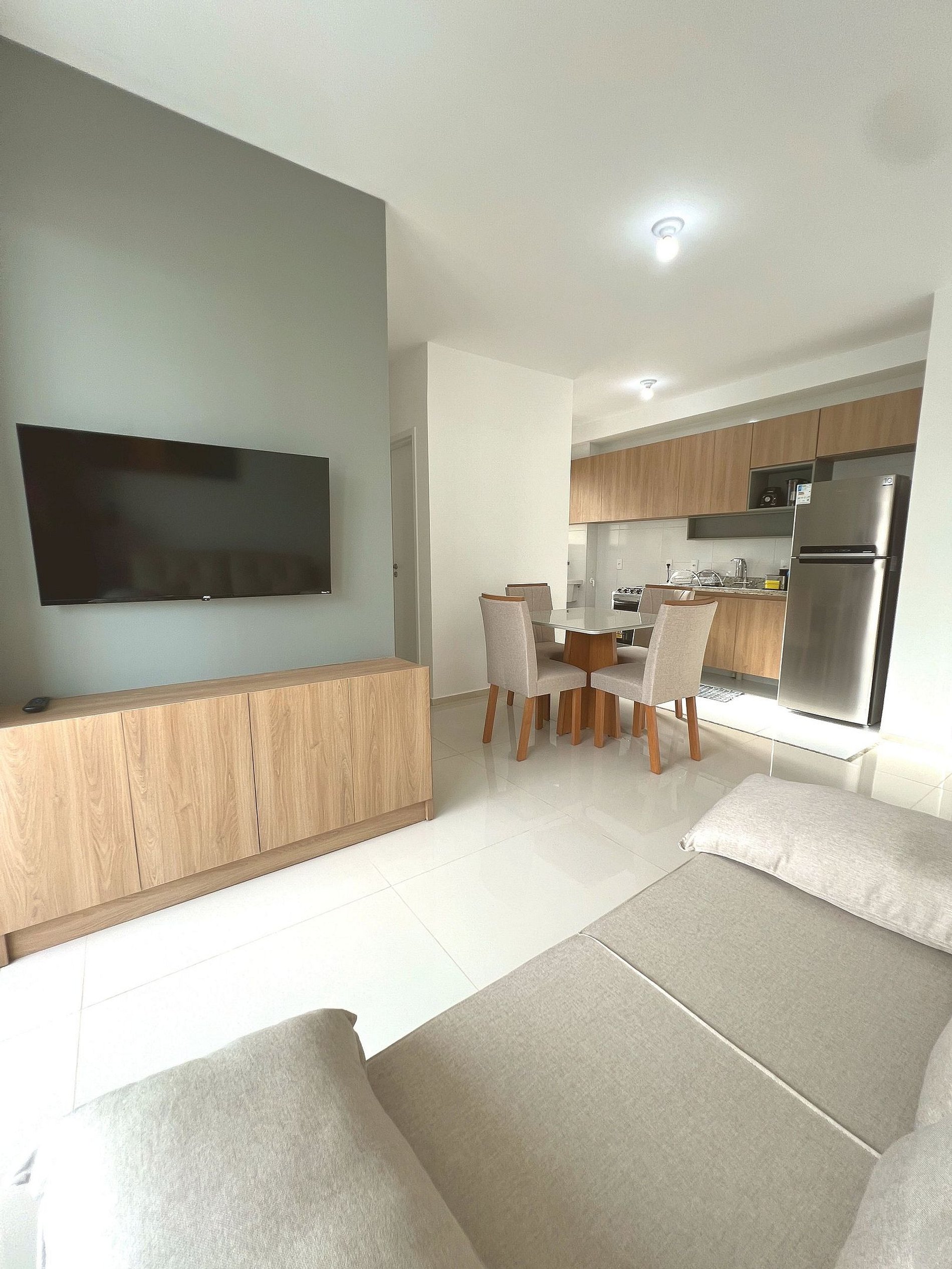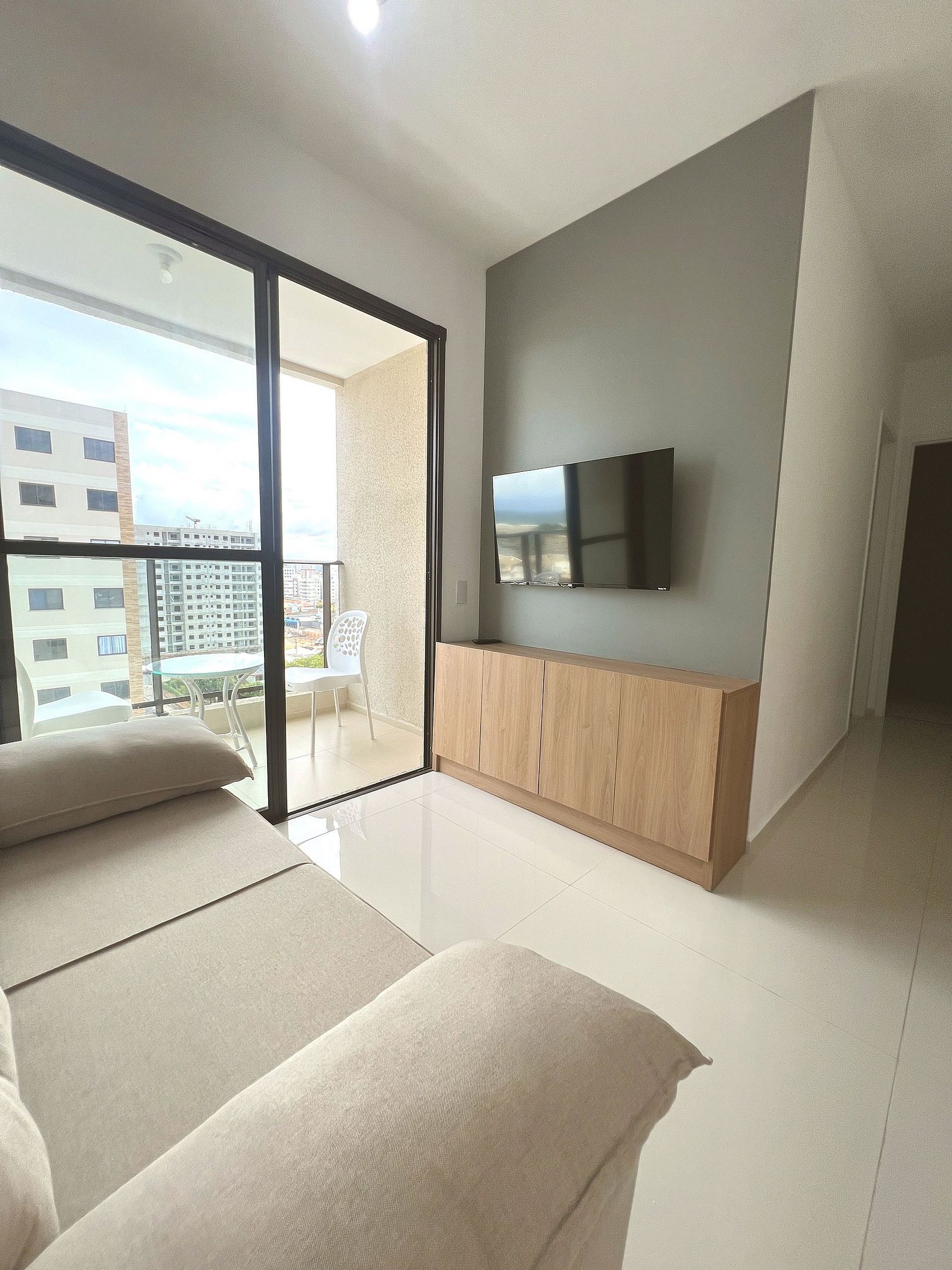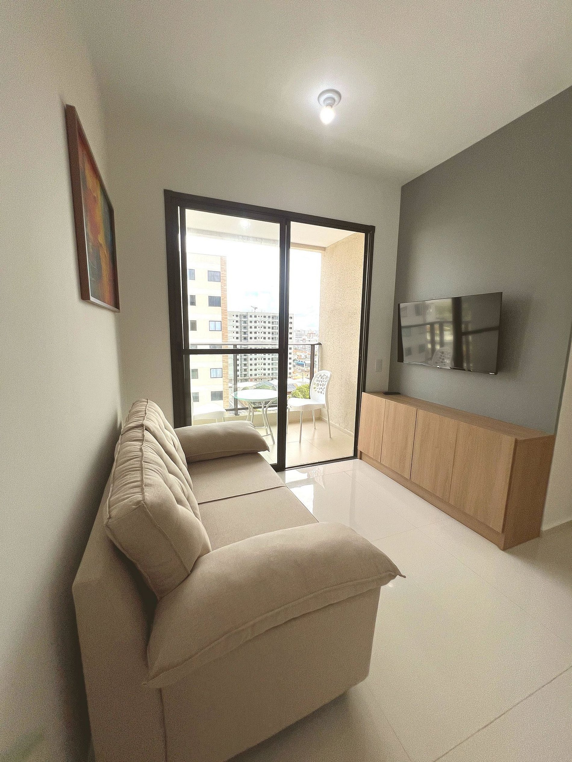 Apartamento moderno com 2 quartos climatizados (acomoda 4 pessoas), 2 banheiros, sala com Smart TV, cozinha equipada e varanda com vista livre.