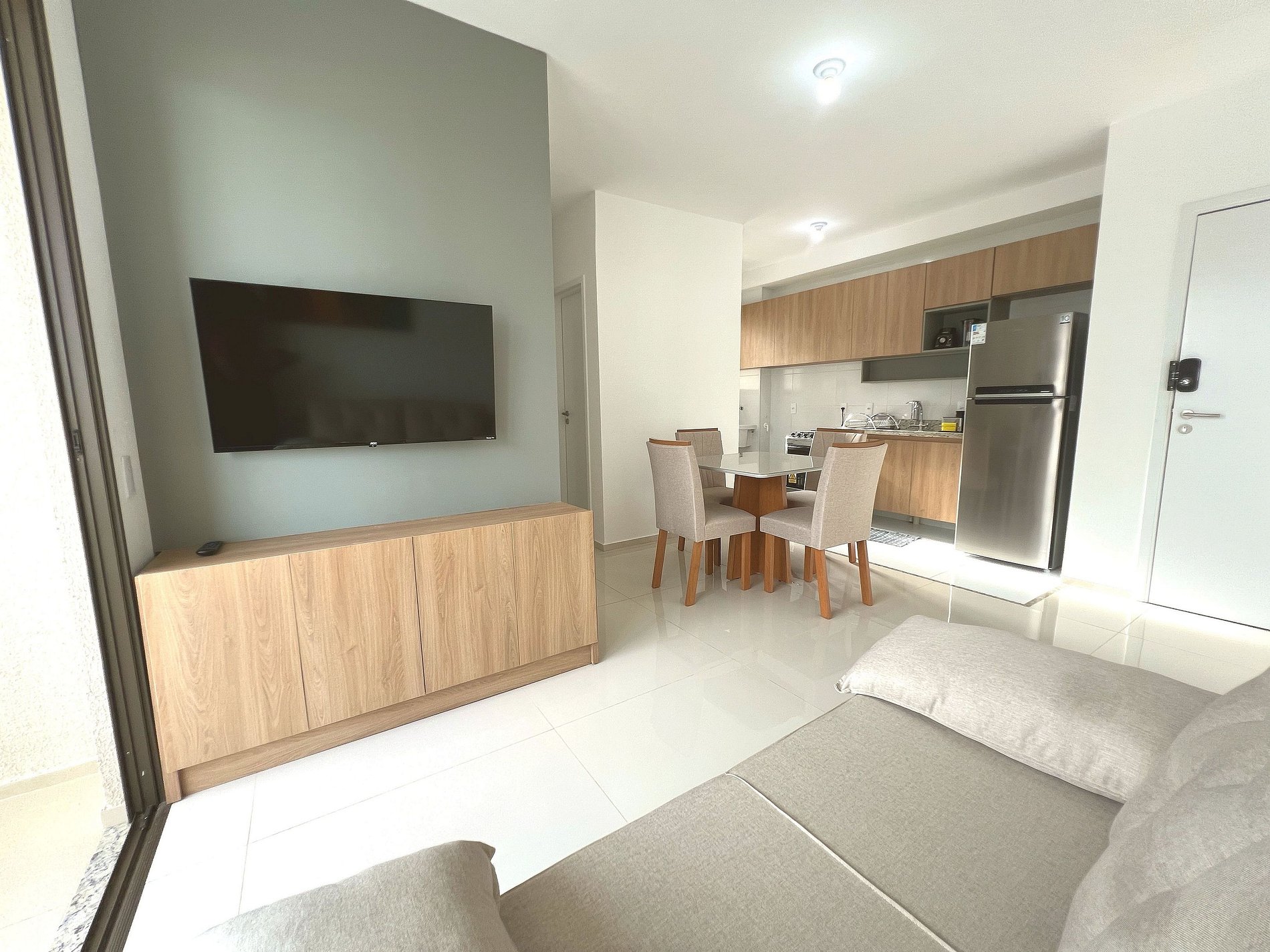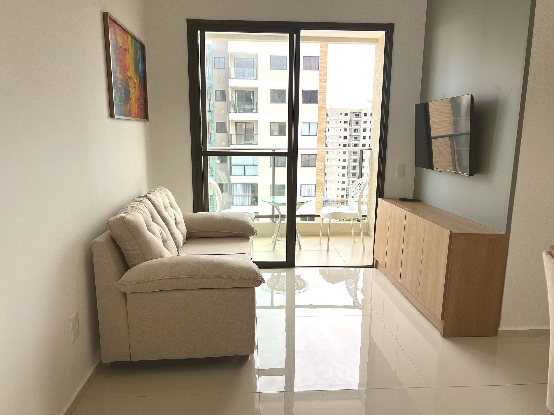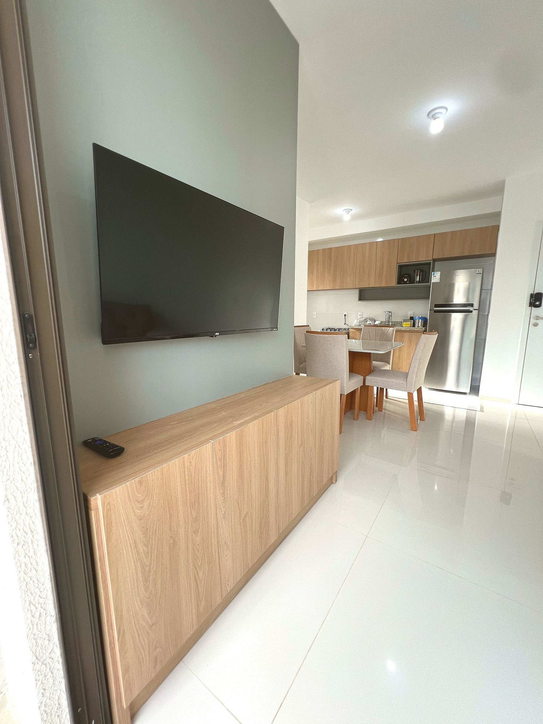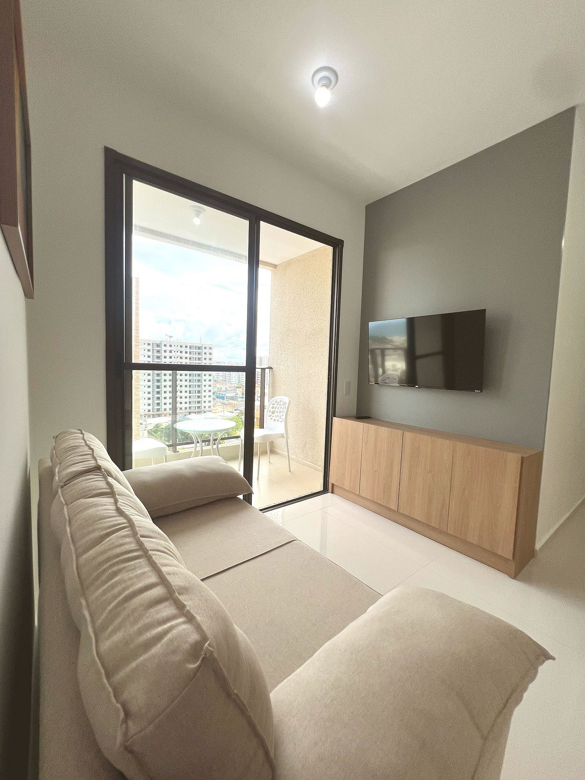 Apartamento moderno com 2 quartos climatizados (acomoda 4 pessoas), 2 banheiros, sala com Smart TV, cozinha equipada e varanda com vista livre.