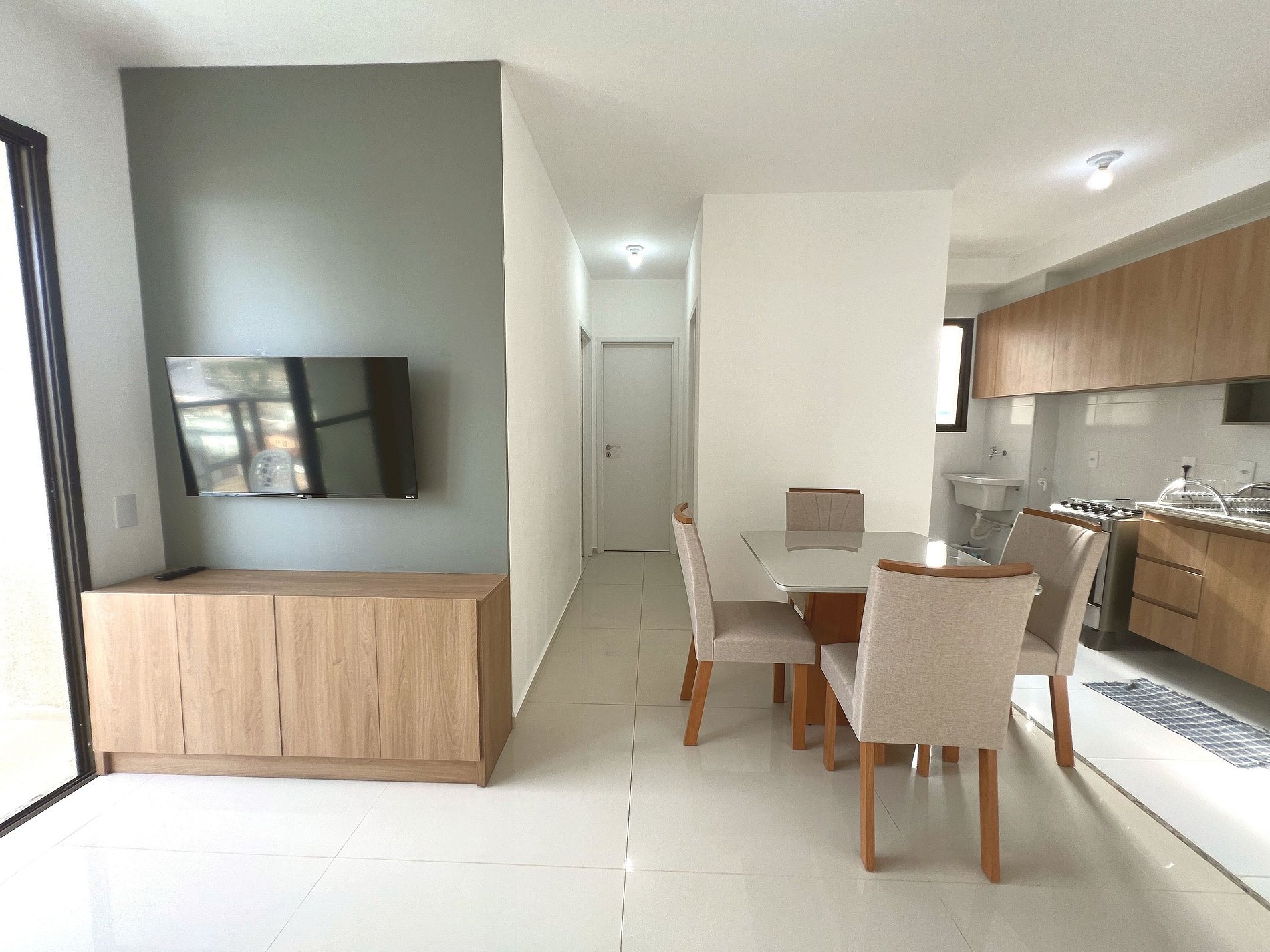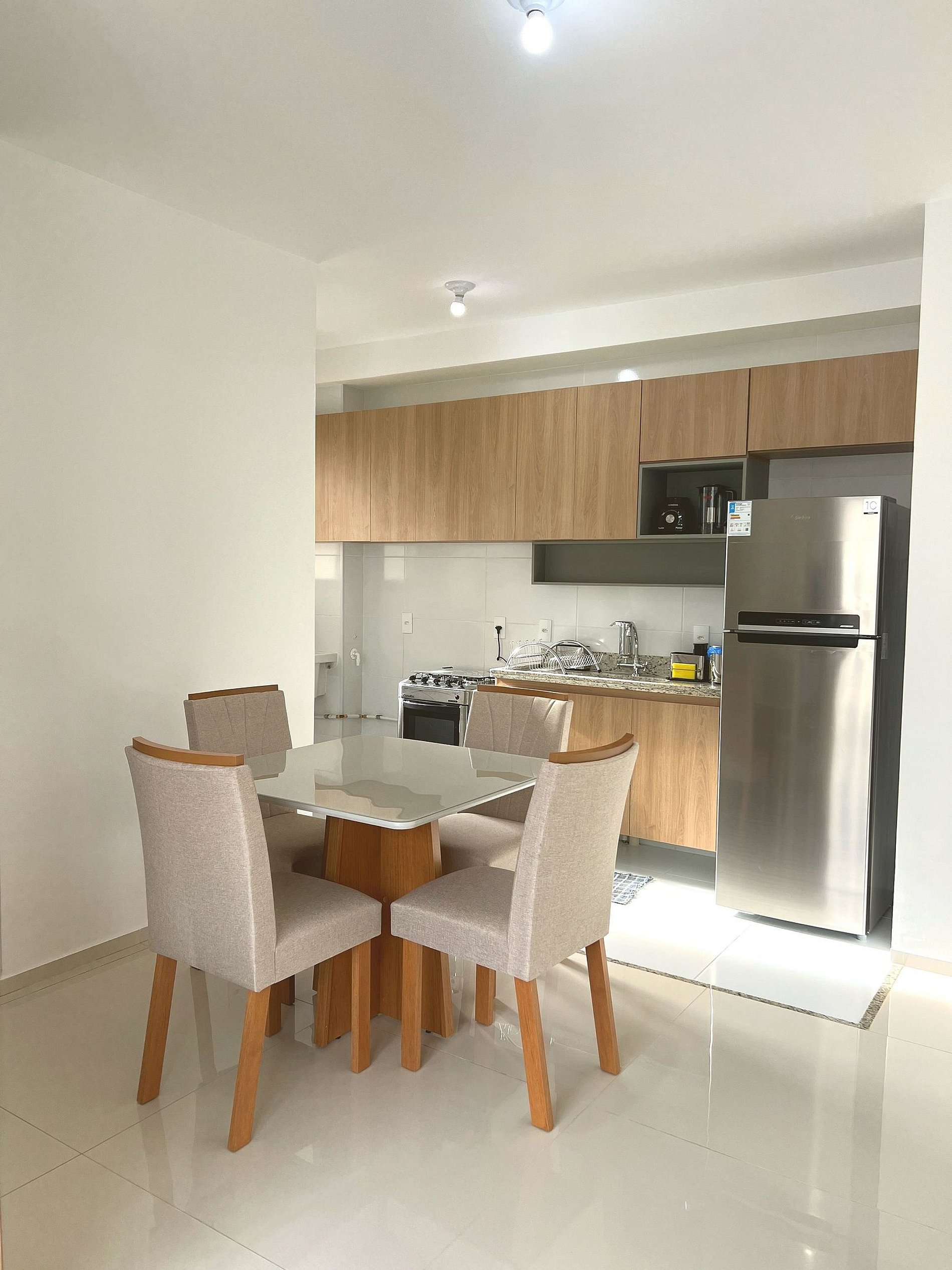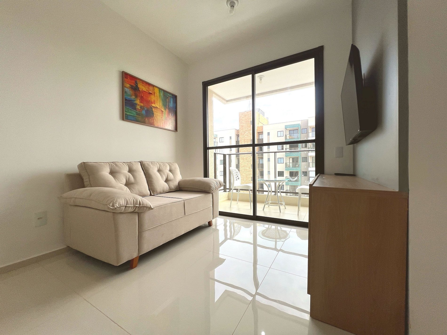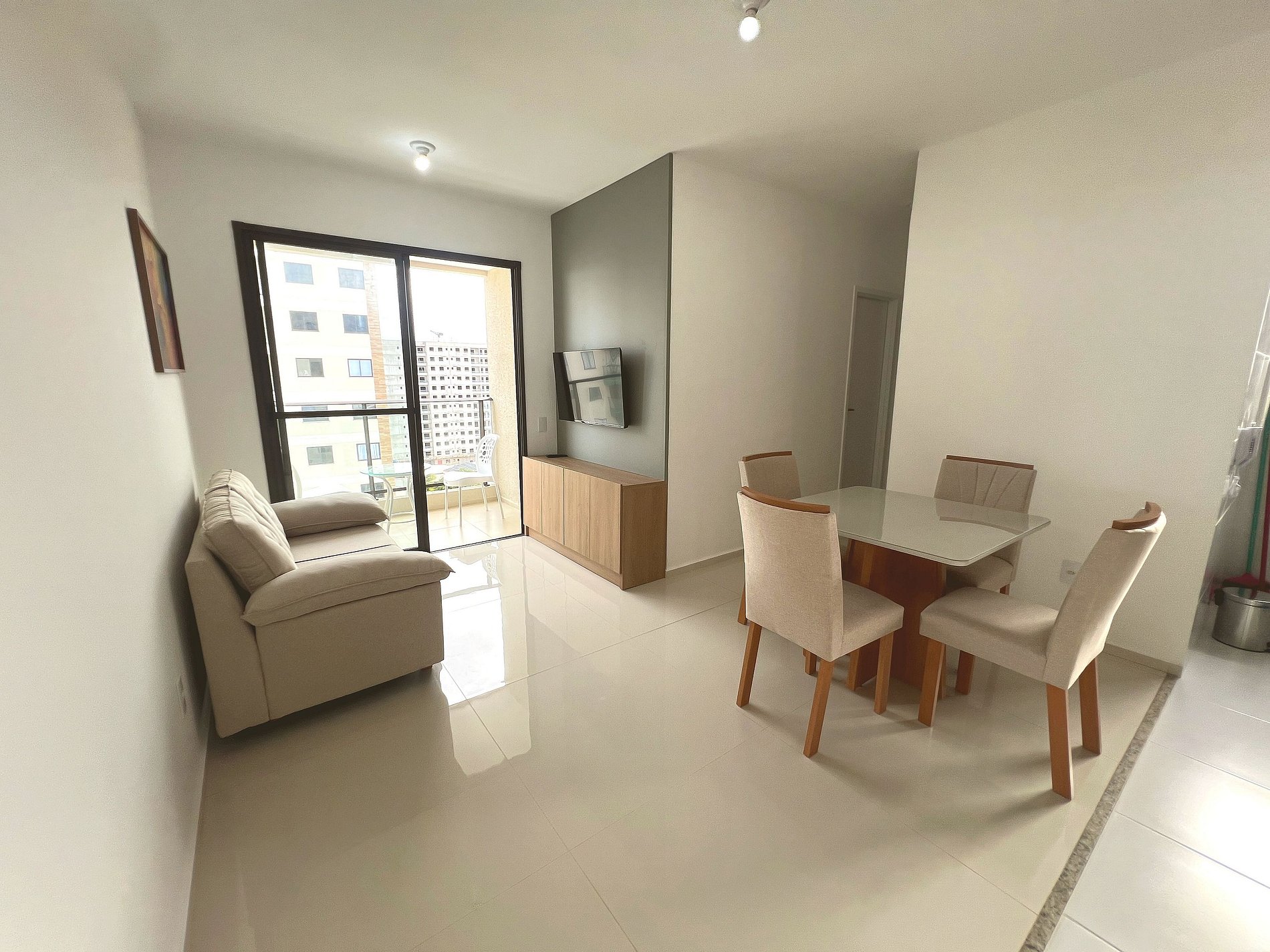Apartamento moderno com 2 quartos climatizados (acomoda 4 pessoas), 2 banheiros, sala com Smart TV, cozinha equipada e varanda com vista livre.
