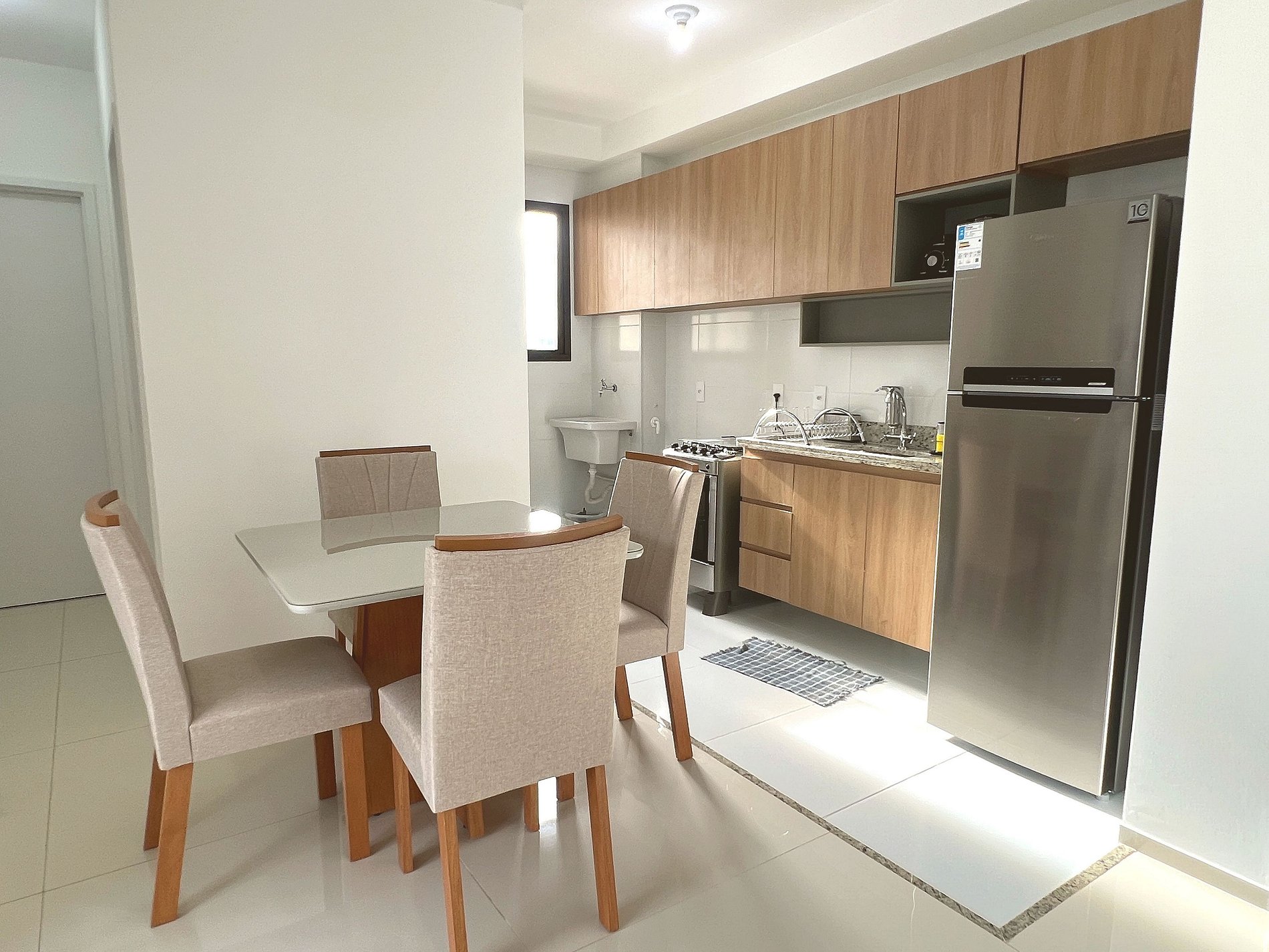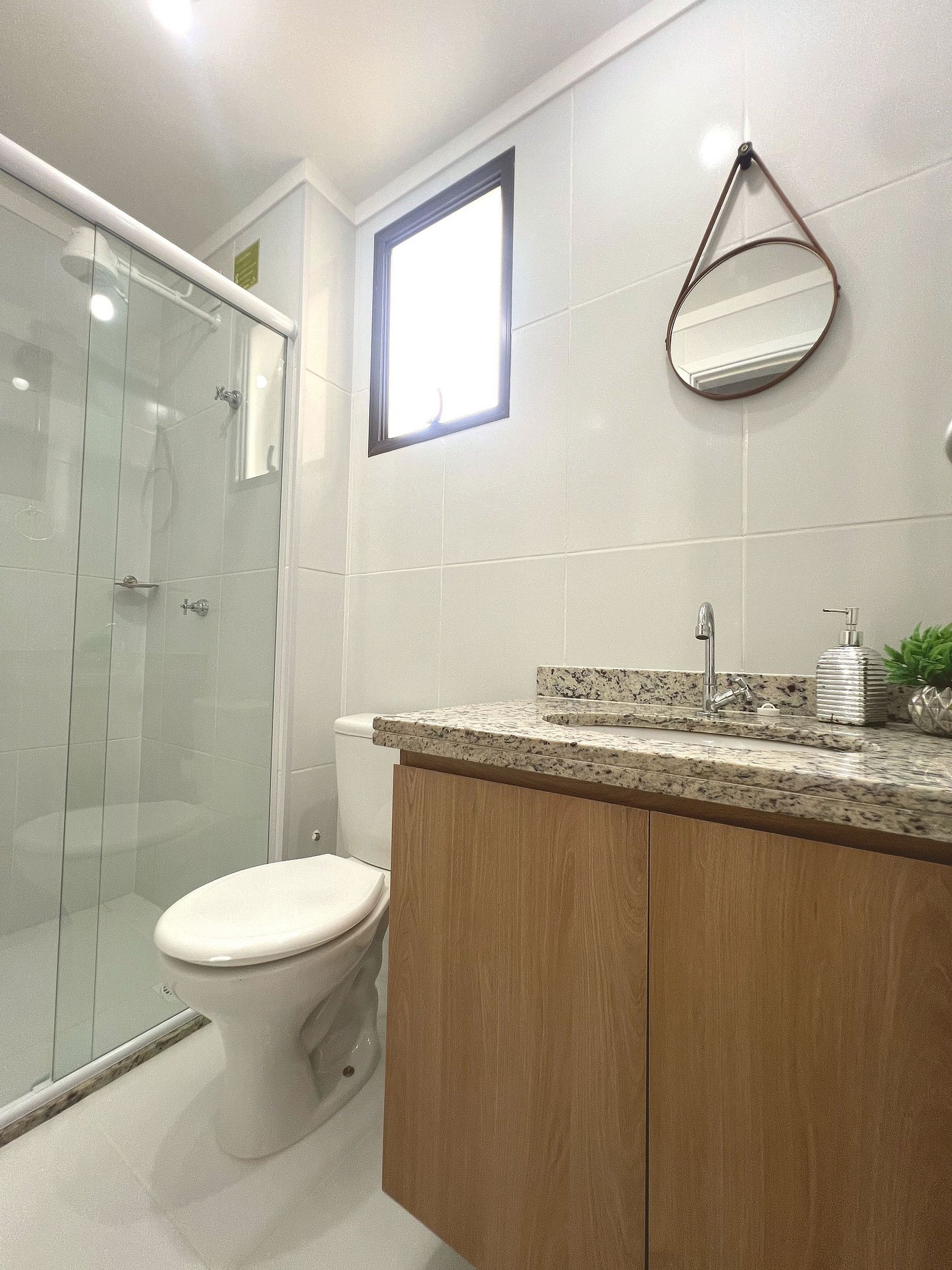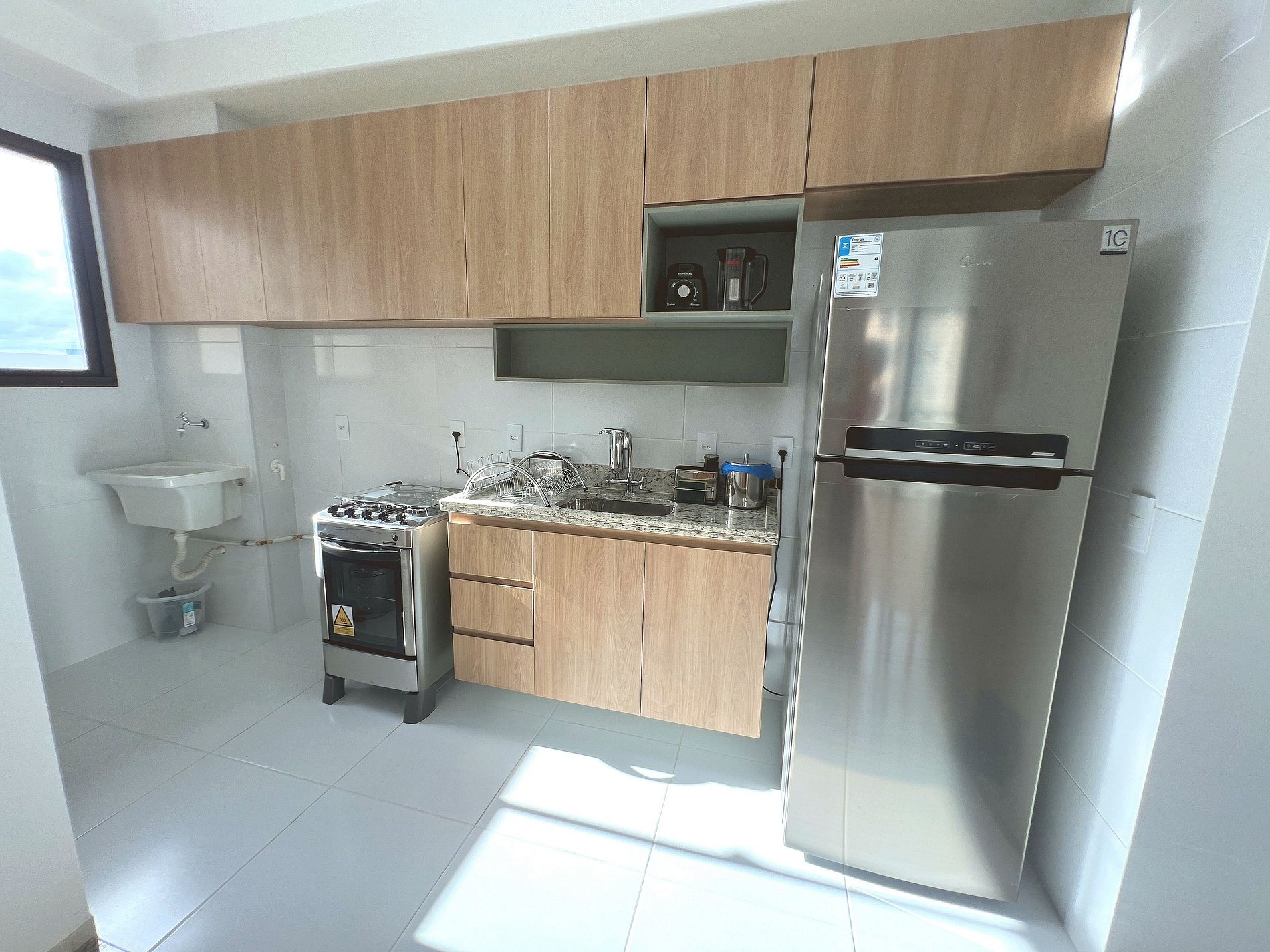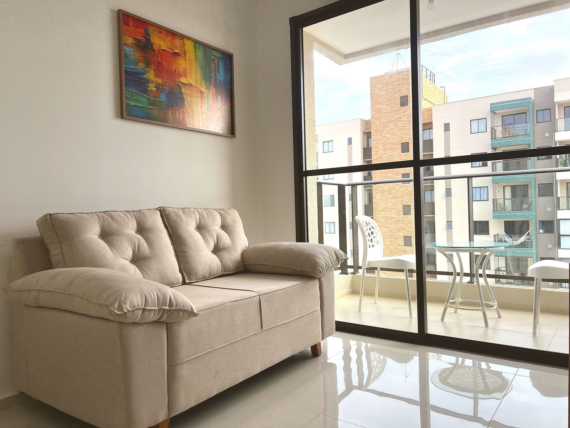 Apartamento moderno com 2 quartos climatizados (acomoda 4 pessoas), 2 banheiros, sala com Smart TV, cozinha equipada e varanda com vista livre.