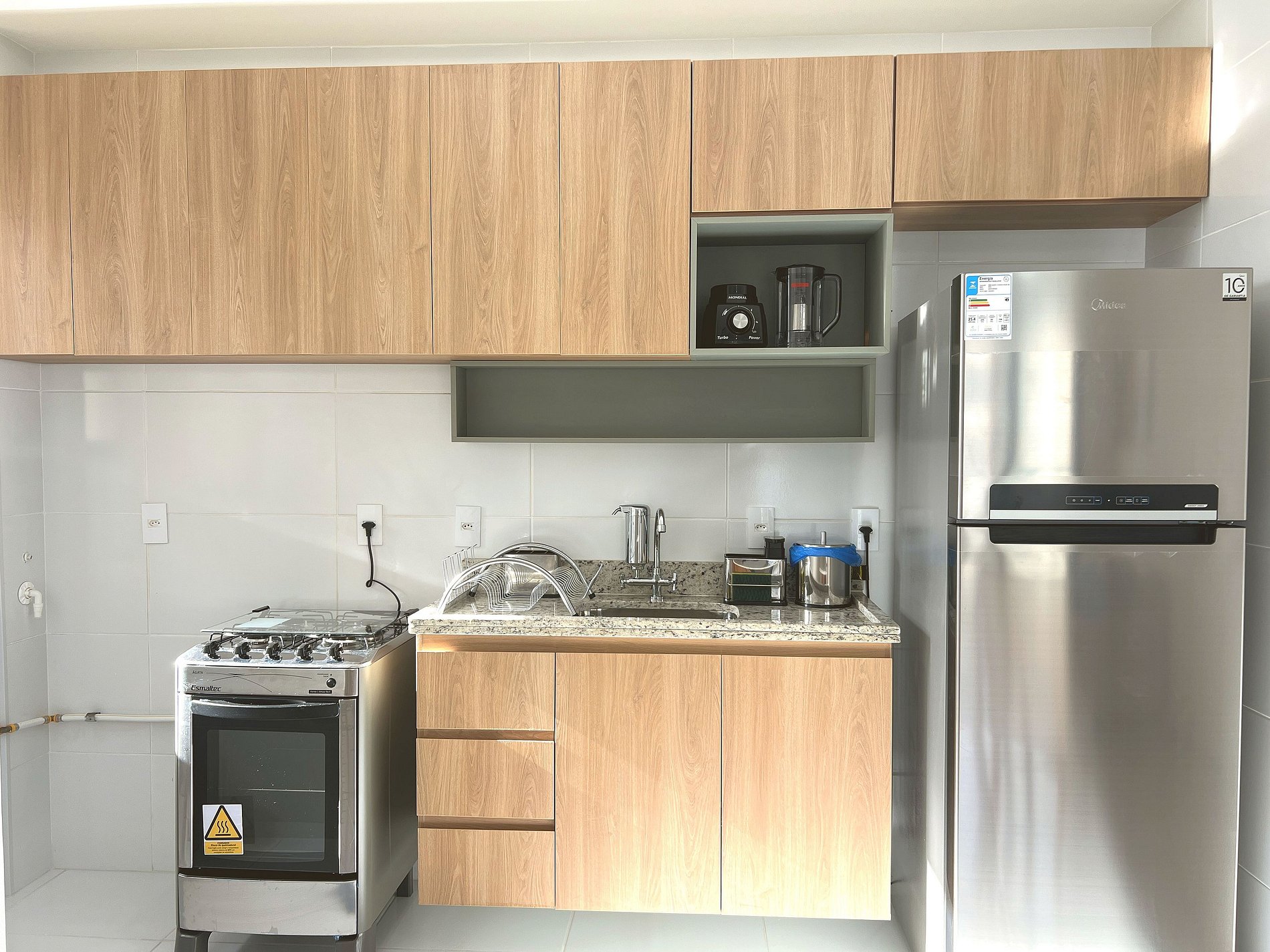 Cozinha planejada com armários em tom madeira e totalmente equipada para o preparo das suas refeições: