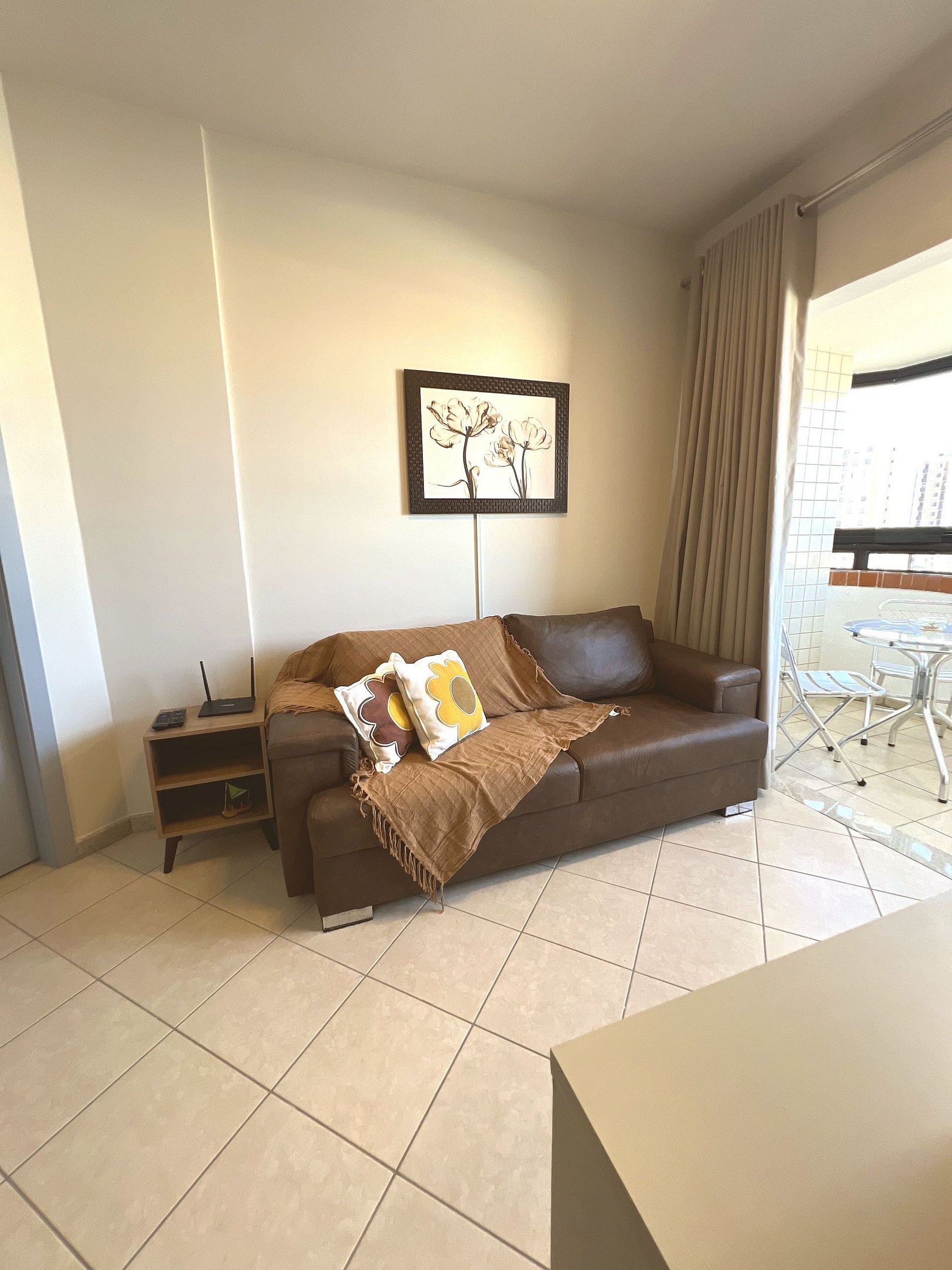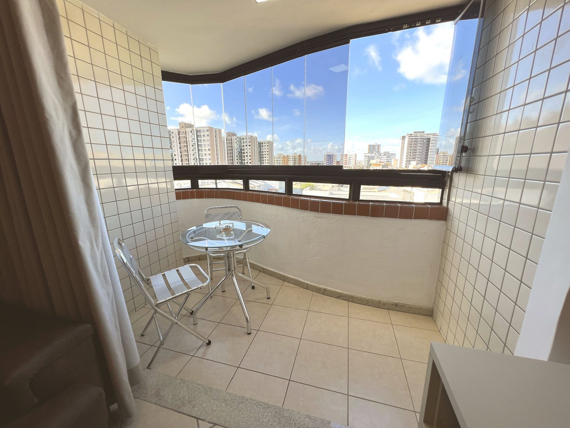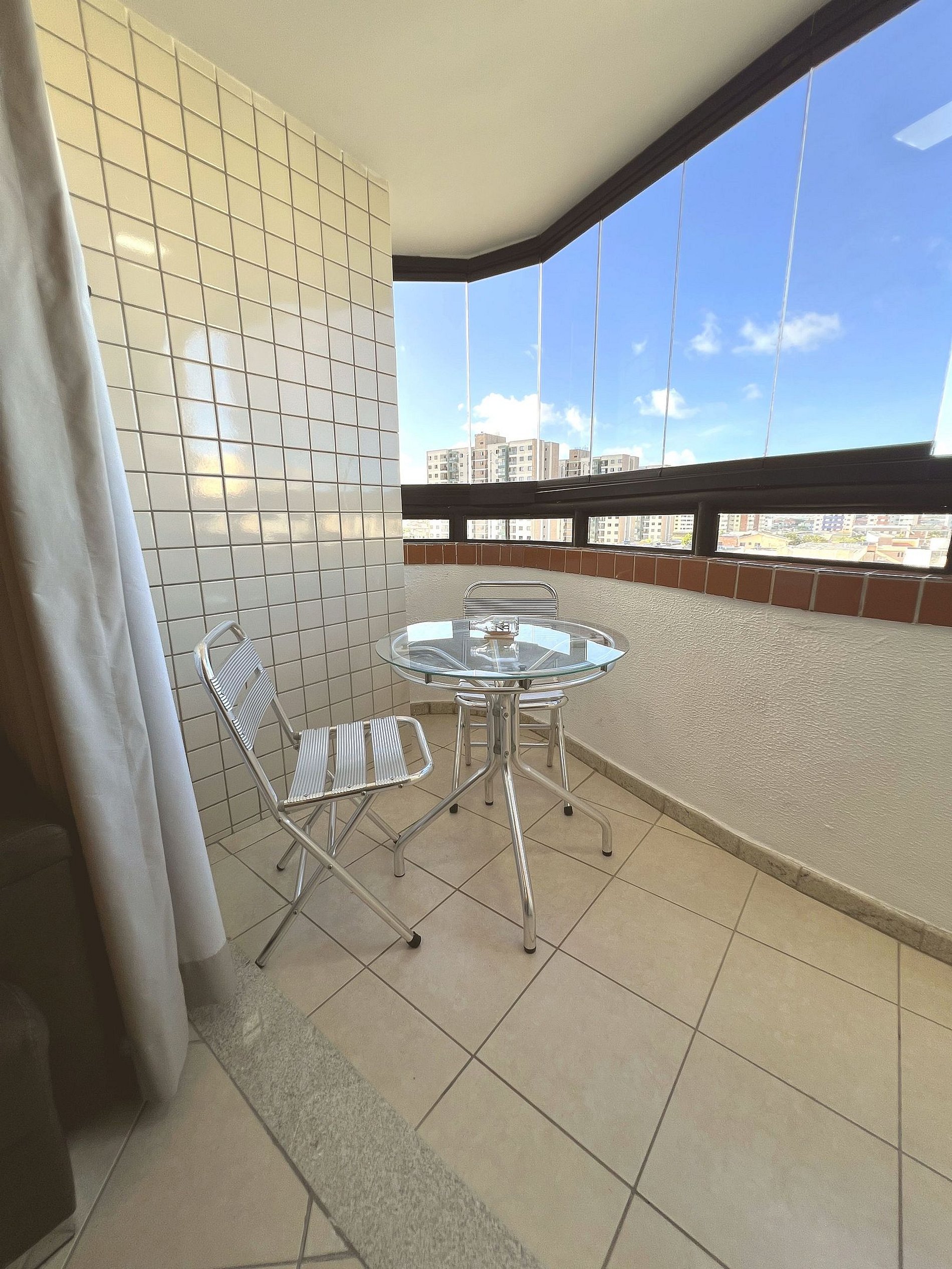 O grande destaque do apartamento! Um espaço agradável com mesa de vidro e cadeiras, perfeito para tomar um café da manhã contemplando a vista da cidade e do mar ao fundo. A cortina de vidro protege do vento sem tirar a luminosidade natural — ideal para relaxar a qualquer hora do dia.