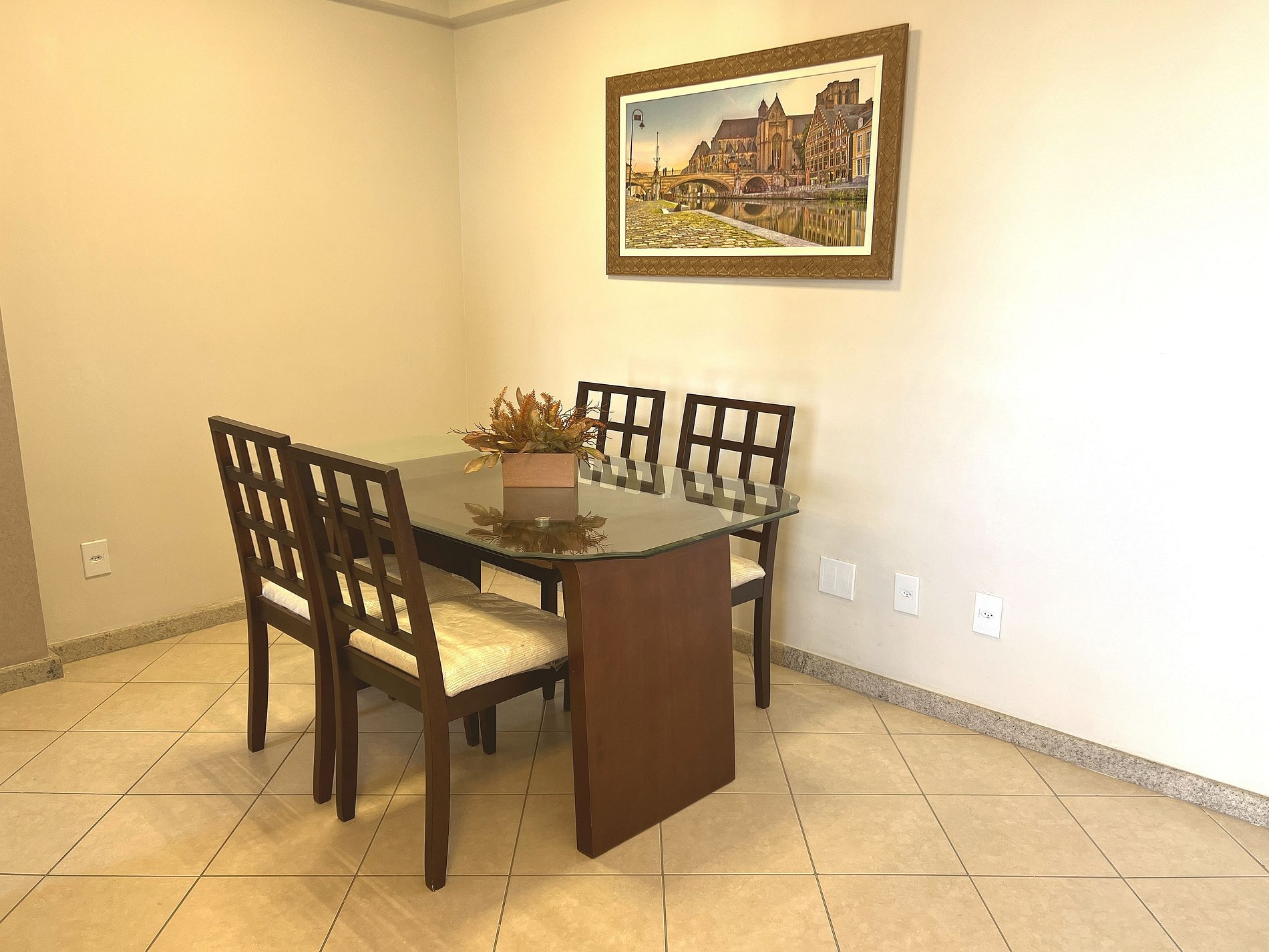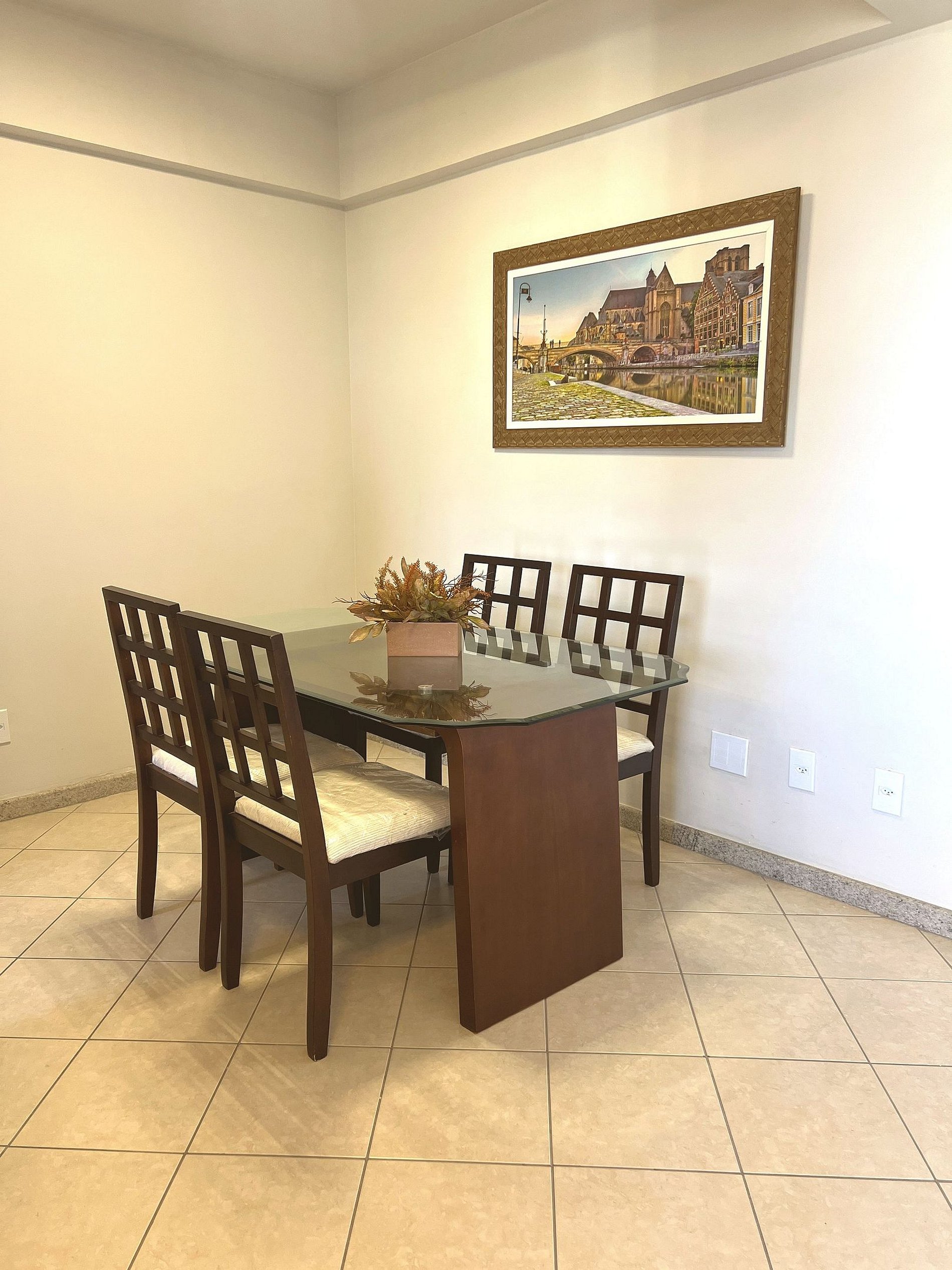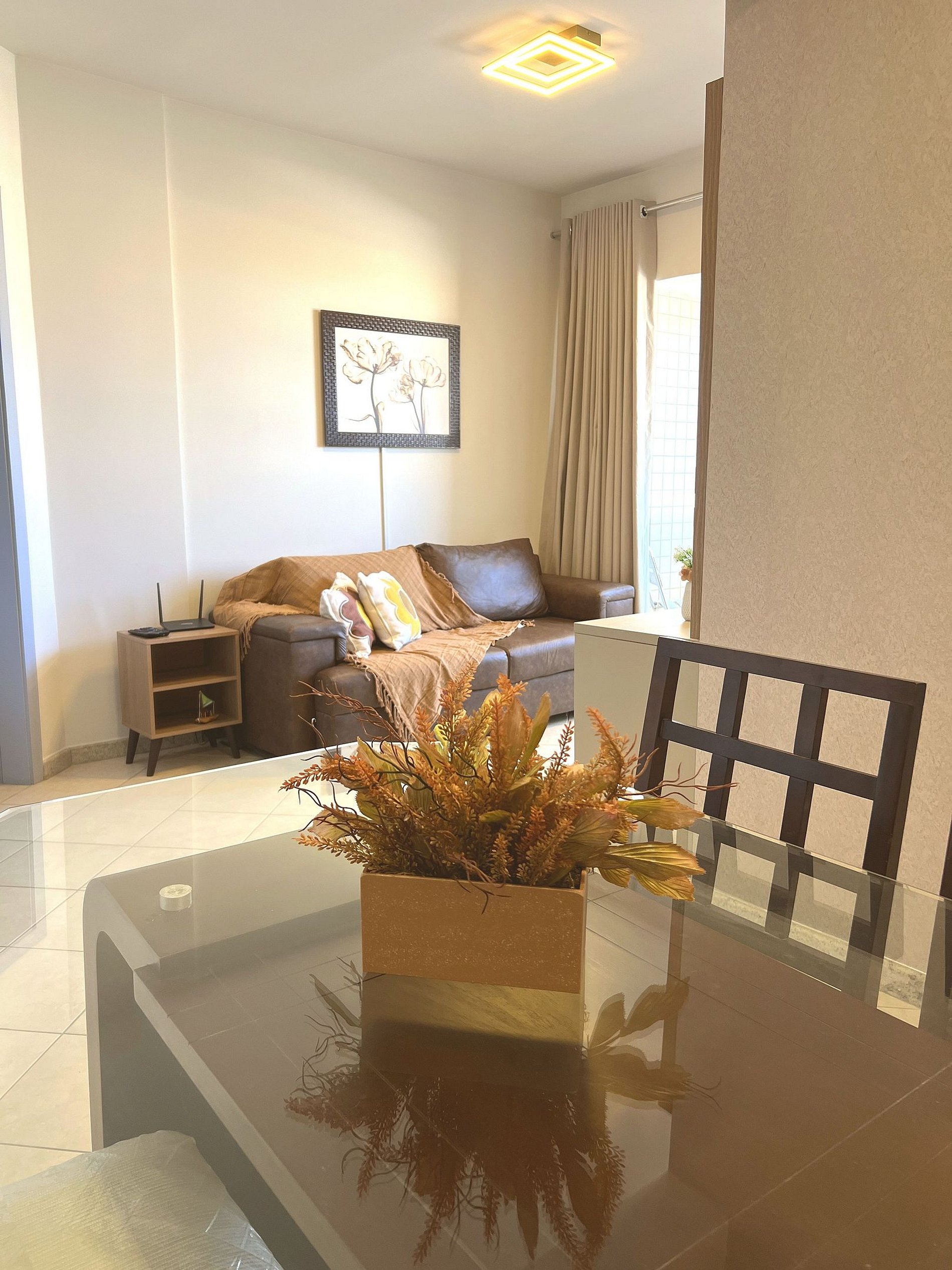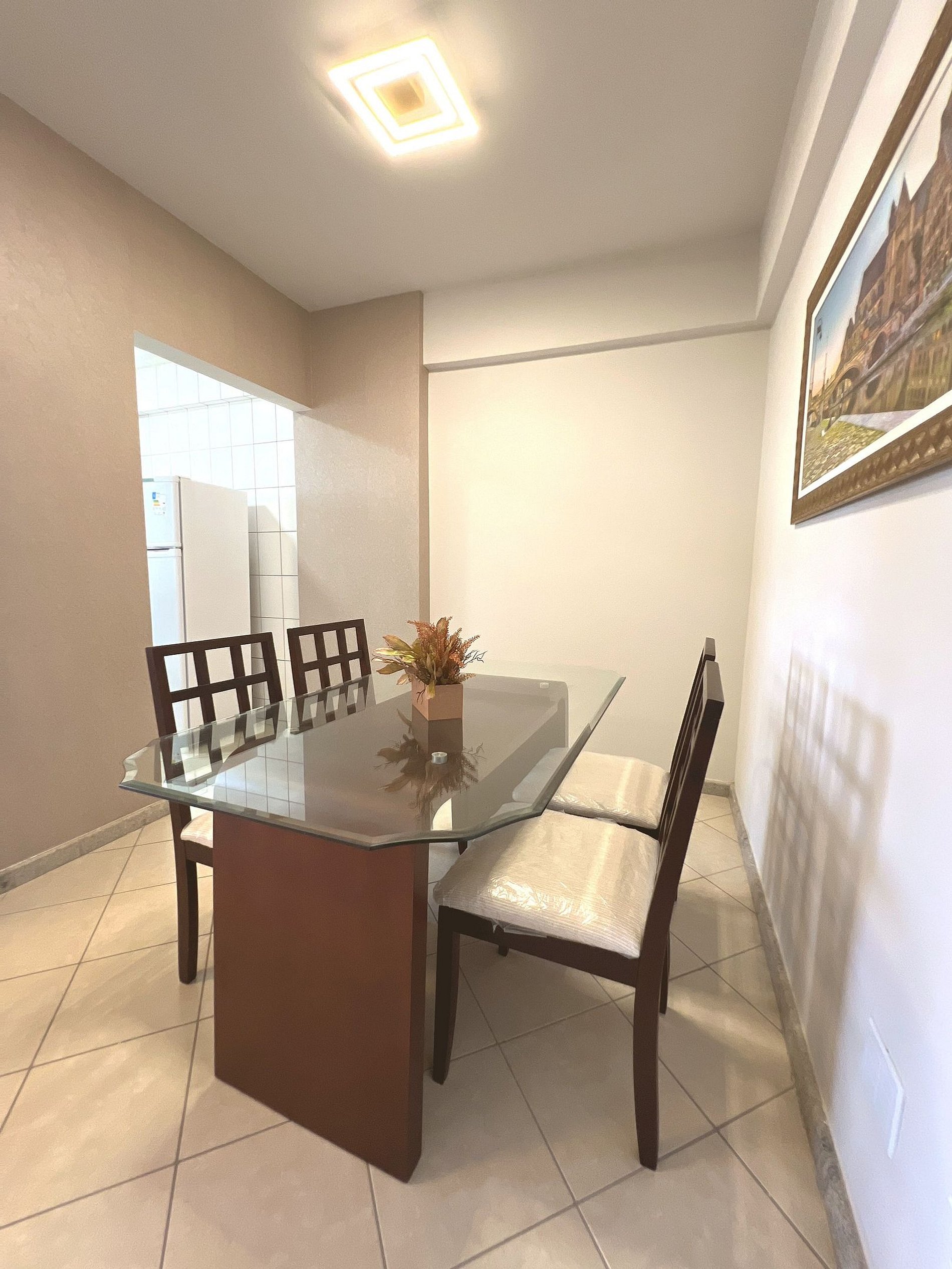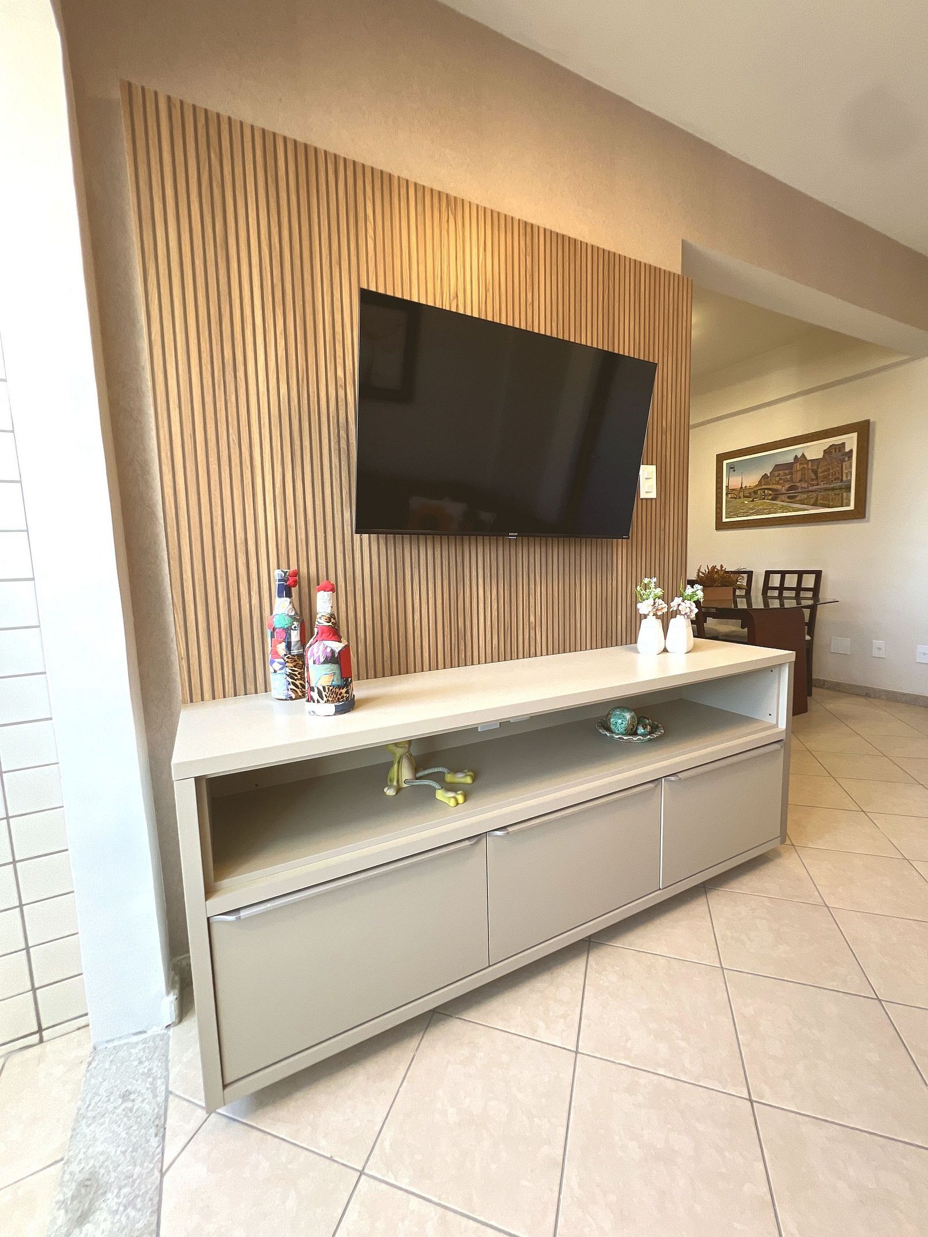 A sala é aconchegante e bem decorada, com sofá confortável, almofadas e quadros artísticos que dão personalidade ao ambiente. O painel de madeira ripada abriga uma Smart TV de tela grande, garantindo entretenimento para toda a família. A mesa de jantar com 4 cadeiras em madeira maciça e tampo de vidro completa o espaço, perfeita para refeições em grupo. Luminárias LED de design moderno criam uma iluminação acolhedora à noite.