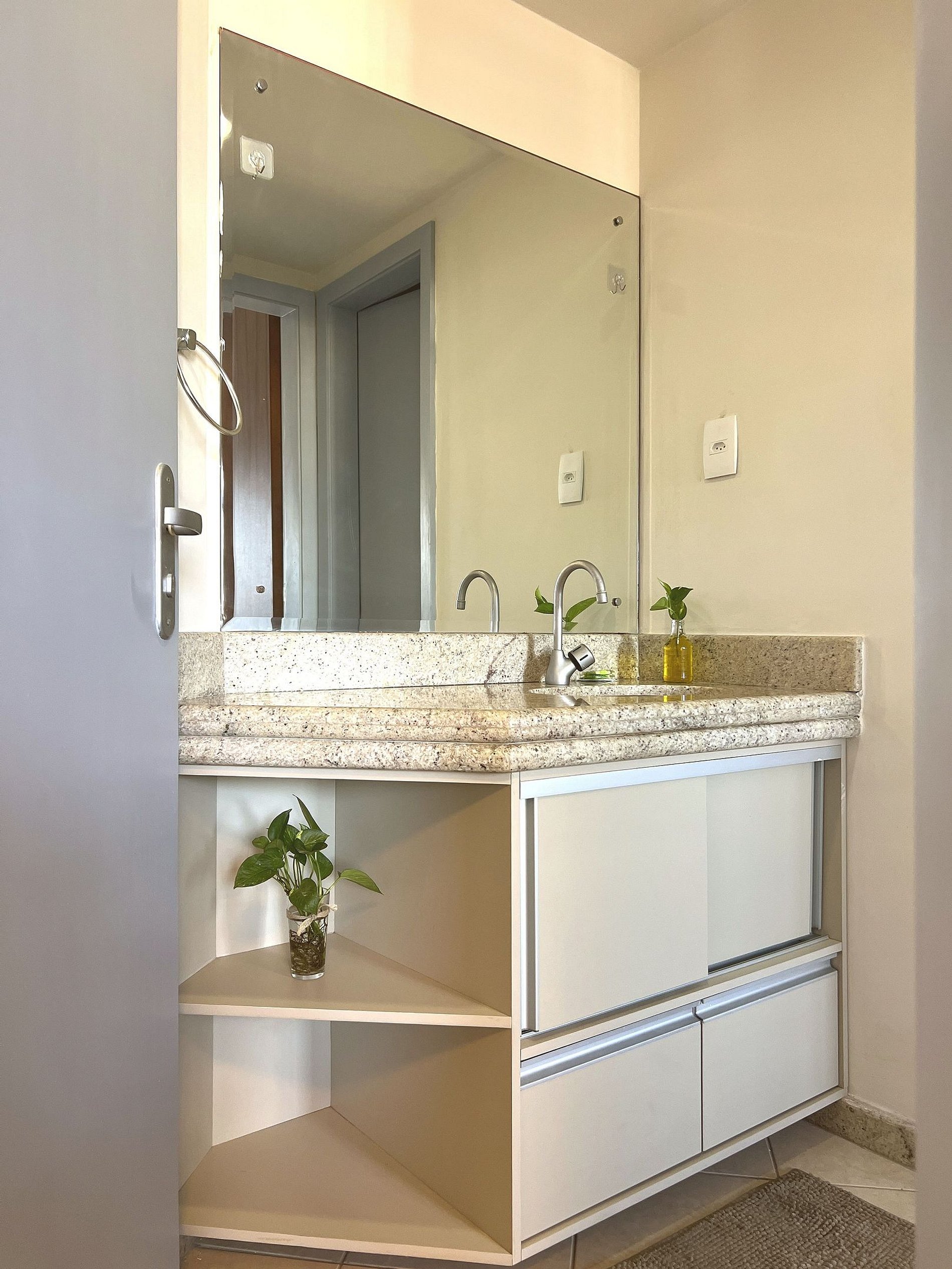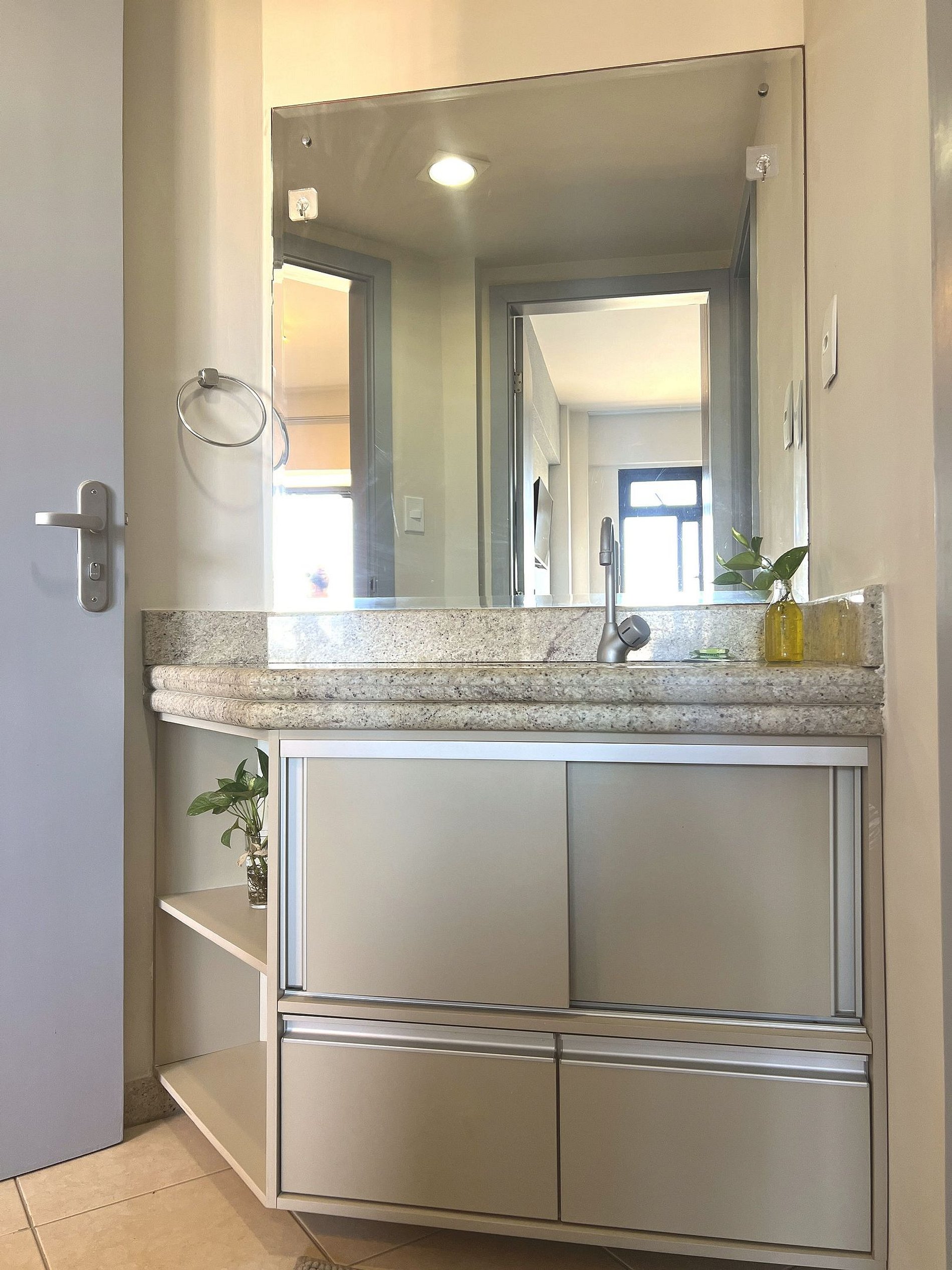 ● Bancada em granito, espelho amplo e armário planejado com nichos e portas de vidro — acabamento moderno e funcional.
