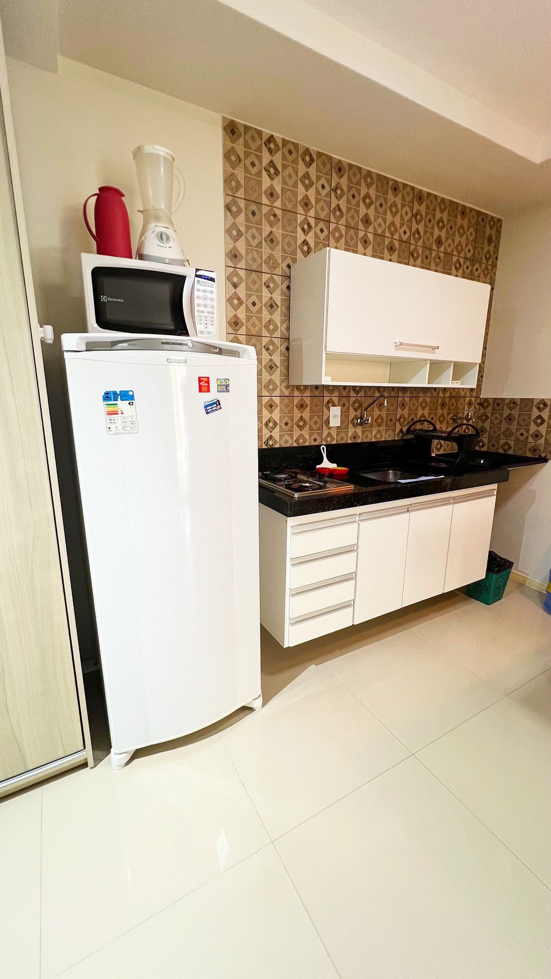 O espaço contem uma cozinha completa e equipada com um cooktop de 2 bocas, liquidificador, panelas e micro ondas.