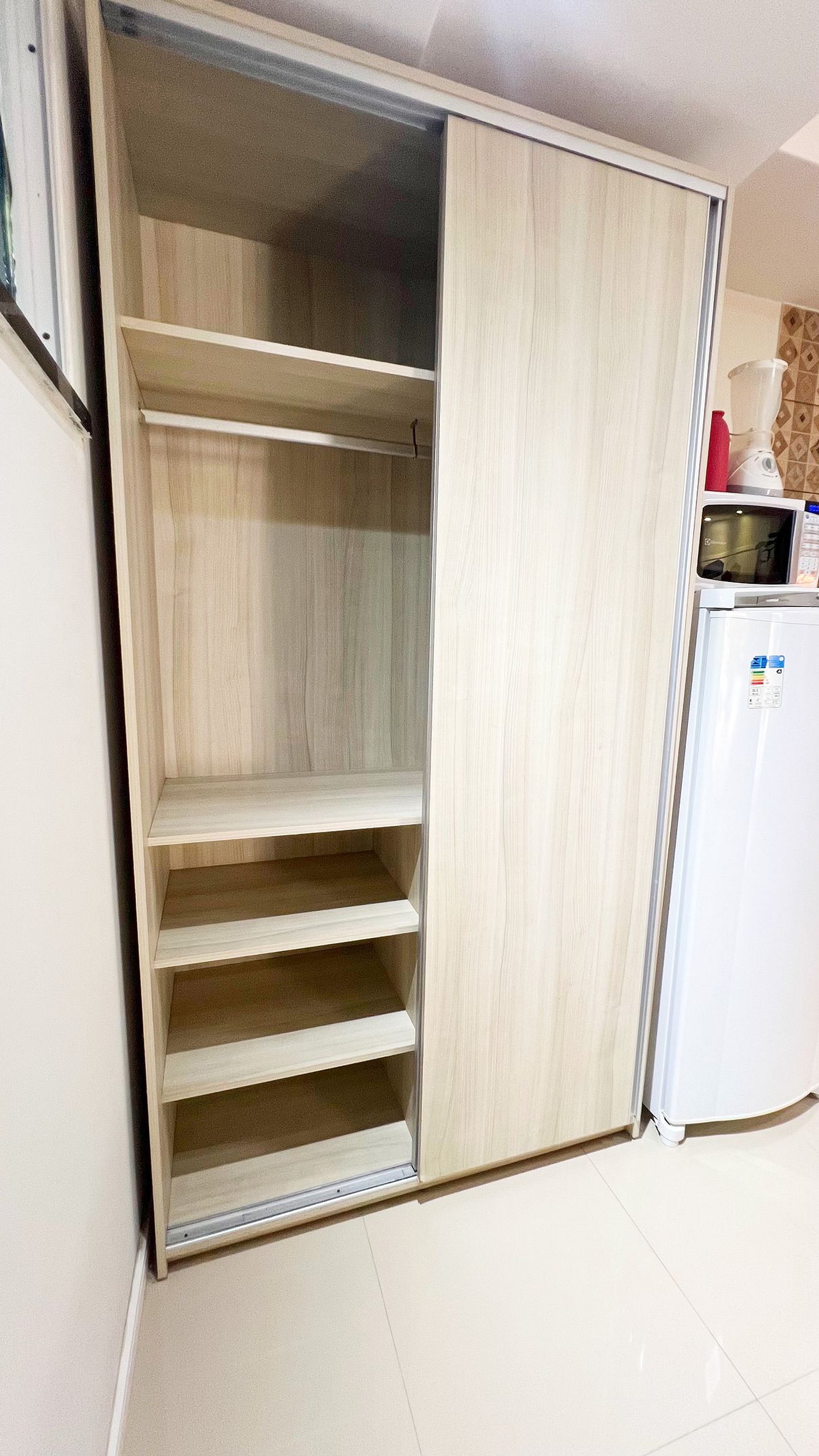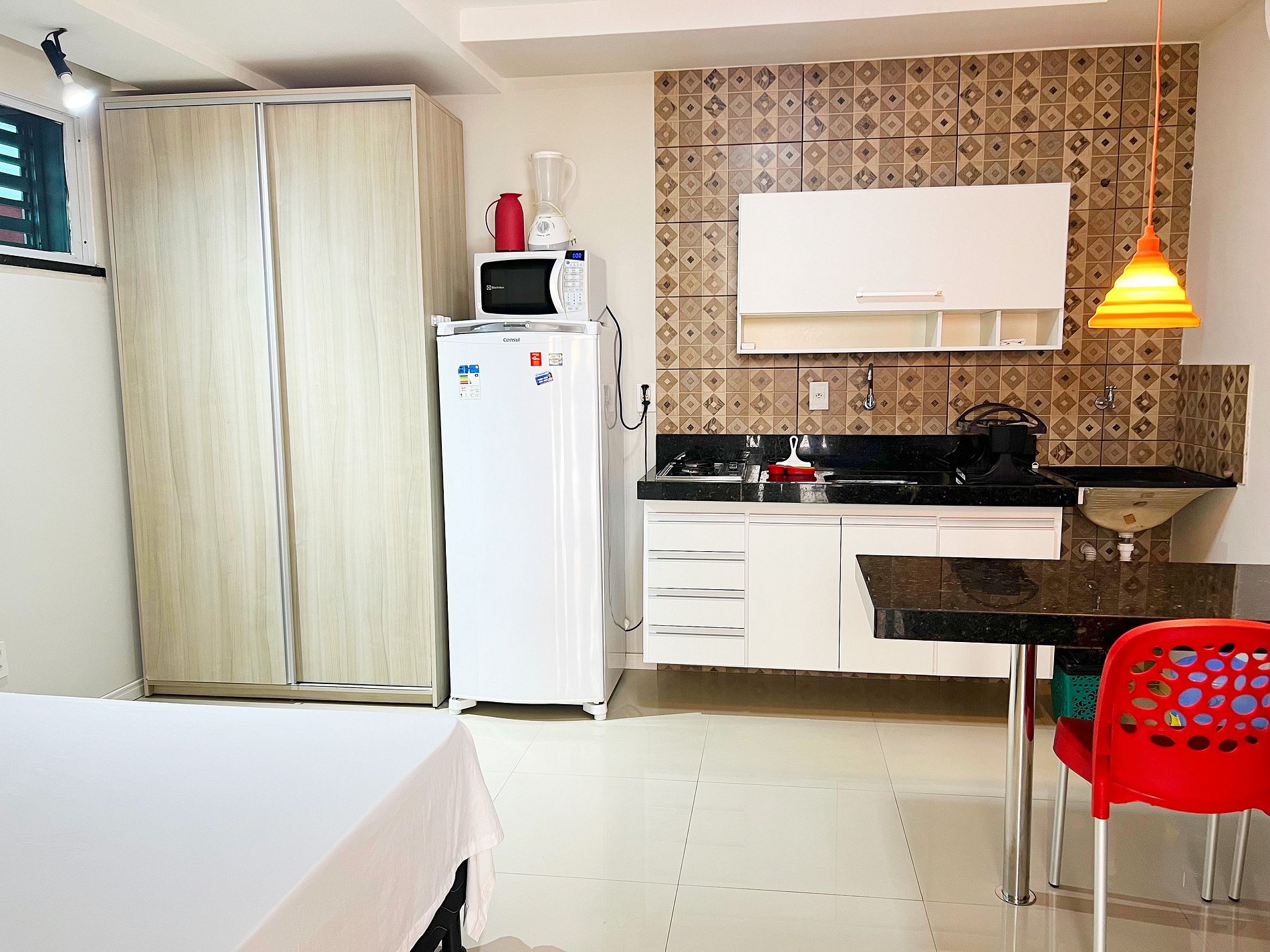 O espaço contem uma cozinha completa e equipada com um cooktop de 2 bocas, liquidificador, panelas e micro ondas.