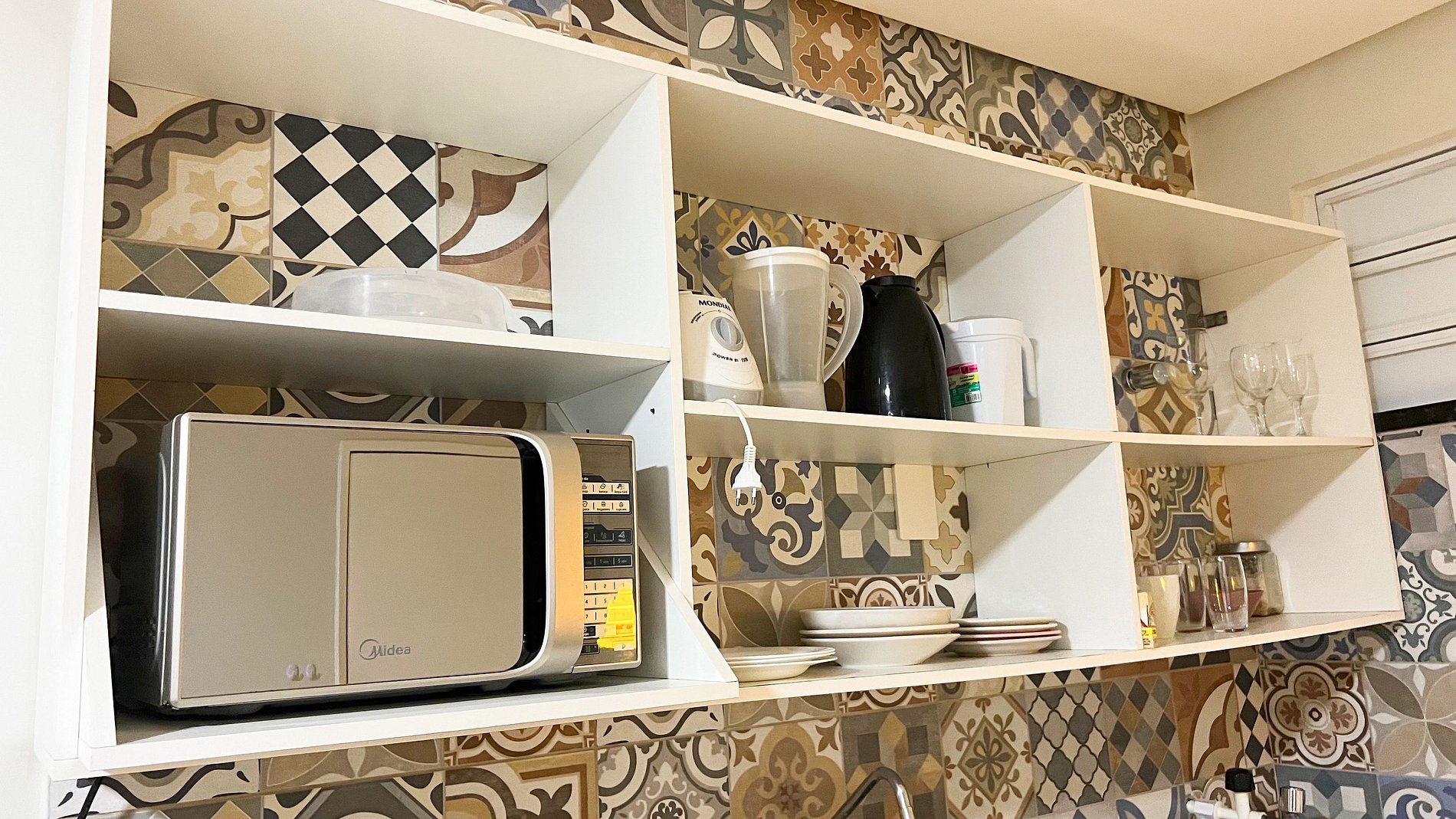 O espaço contem uma cozinha completa e equipada com um cooktop de 2 bocas, liquidificador, panelas e micro ondas.