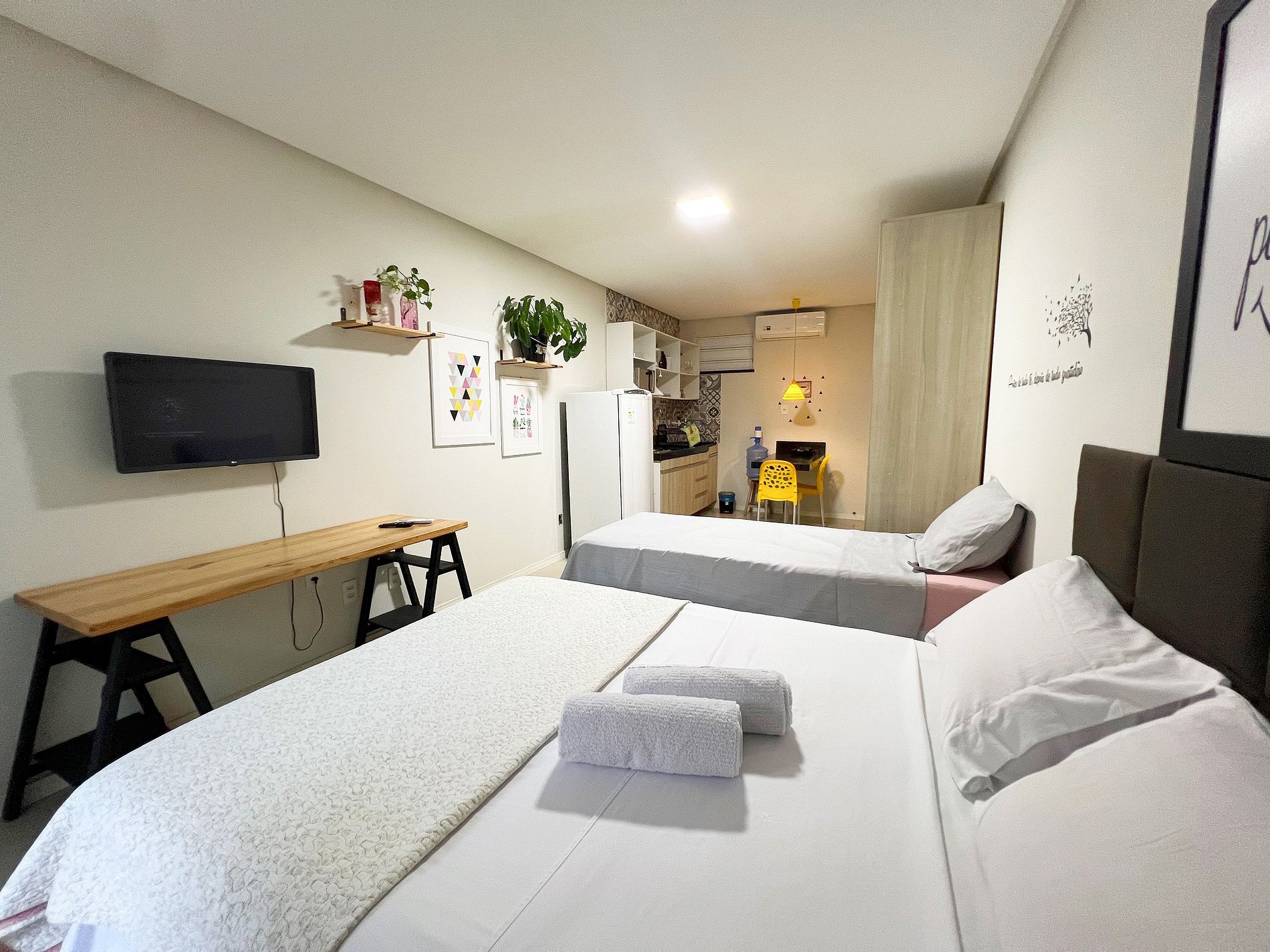 Ideal para até 3 pessoas, o espaço oferece uma confortável cama de casal, ar-condicionado para noites tranquilas e uma cozinha completa para quem ama praticidade.
