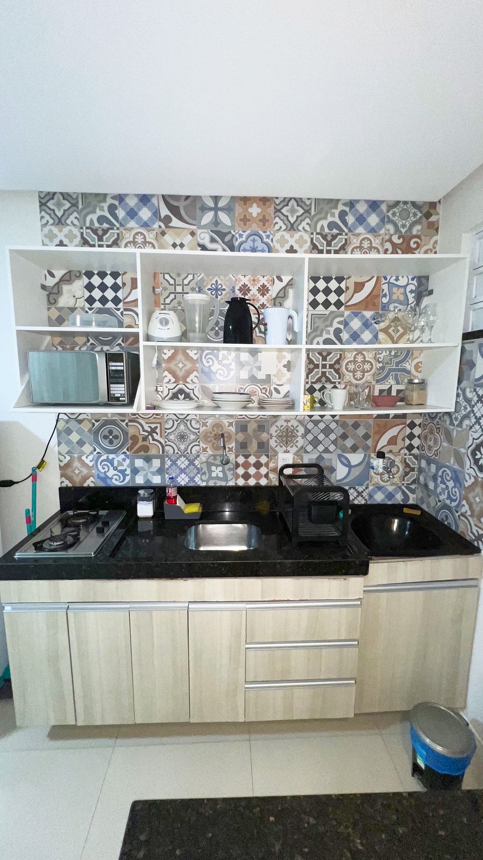 O espaço contem uma cozinha completa e equipada com um cooktop de 2 bocas, liquidificador, panelas e micro ondas.